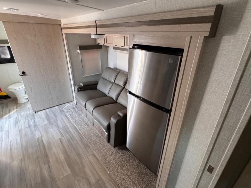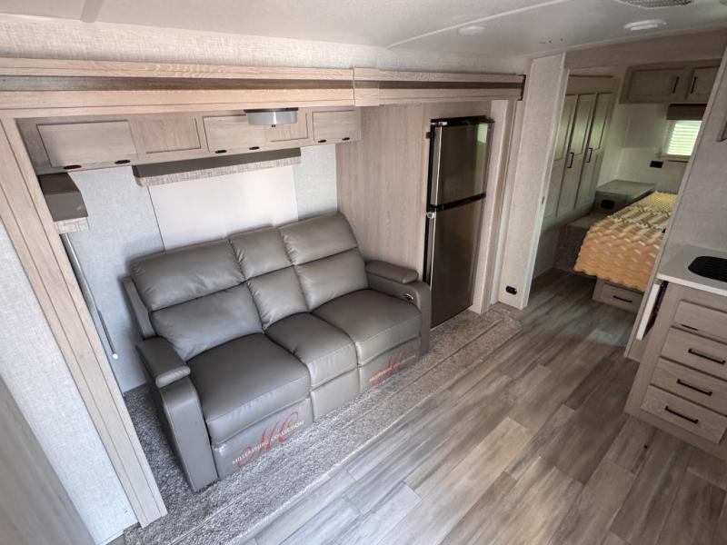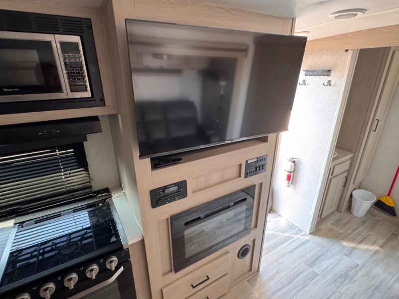 For the couple who enjoys a weekend camping trip, come choose this Flagstaff Micro Lite travel trailer. This unit features a slide that holds the theater seats with cupholders for your favorite beverage. You'll love relaxing on these in the evening while you enjoy your entertainment center with an LED TV. The private front bedroom includes an RV queen bed and a wardrobe slide. You'll love the cute kitchen with a countertop extension for meal prep and a large pantry to hold your favorite snacks. This trailer also features a drop-frame pass-through storage for your large camping items.