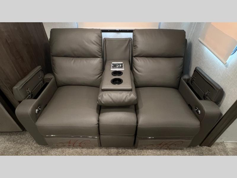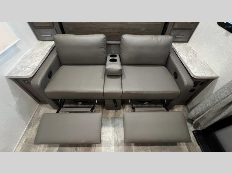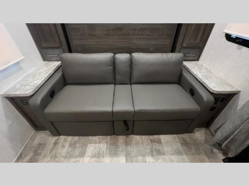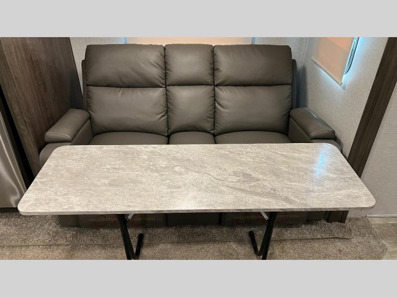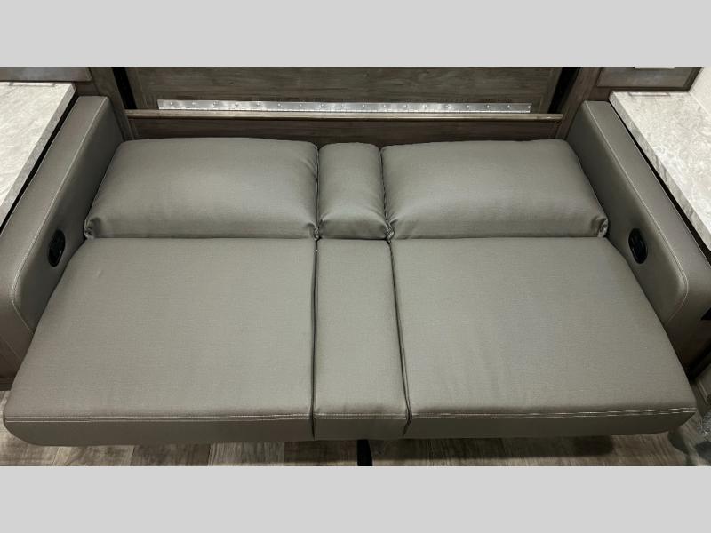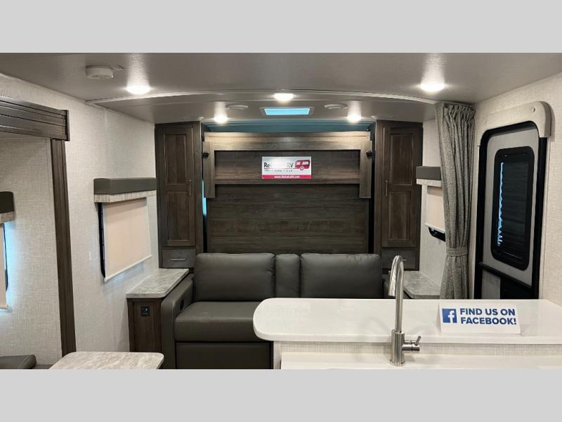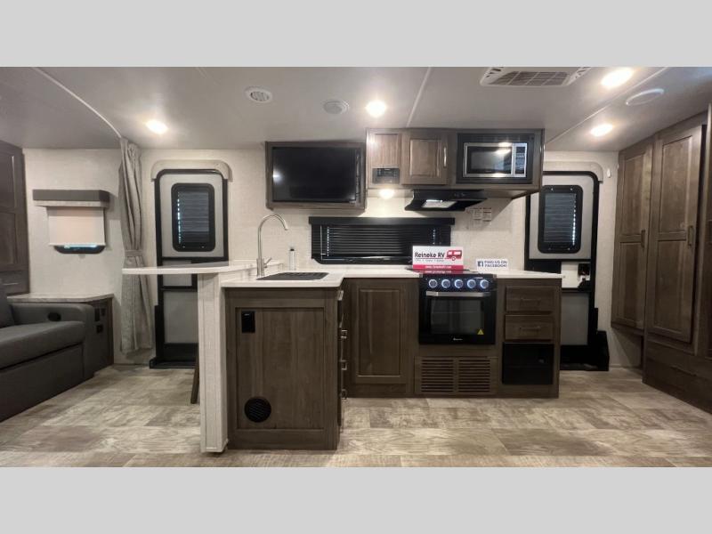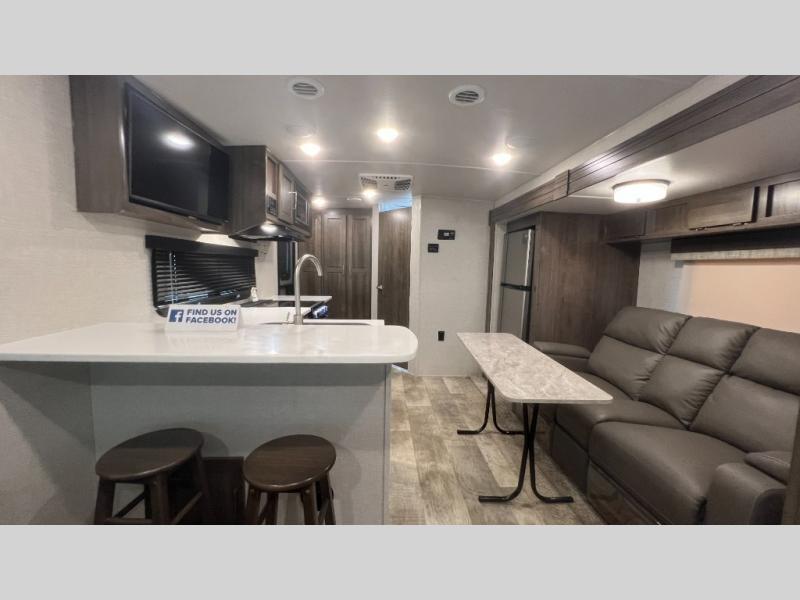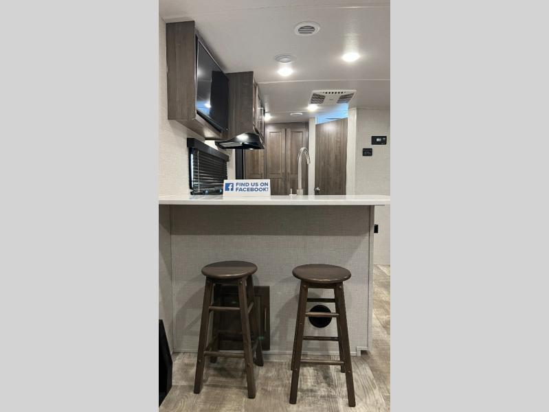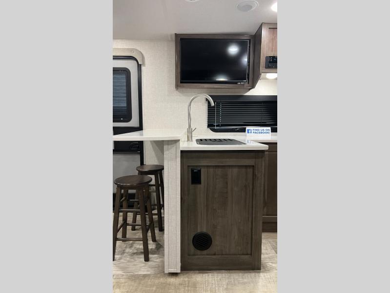 You are going to absolutely love this Flagstaff Micro Lite travel trailer! One feature found on this trailer that will make life easier is the set of two entry doors. Now you can choose whether or not you want to enter the front portion or the back portion of this trailer. If you enter through the rear entry door, you will be able to walk straight into the full bathroom, and that will make it convenient for those times when you are outside playing and need to come in quickly. Up at the front of this trailer is a Murphy bed that can be folded away during the day to reveal a 72" sofa for lounging. You can also choose to sit in one of the two bar stools at the breakfast bar, or you may want to put your feet up in the 67" theater seating. The kitchen also has a countertop extension so that you can add some extra prep space while you cook.