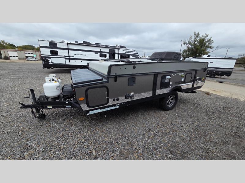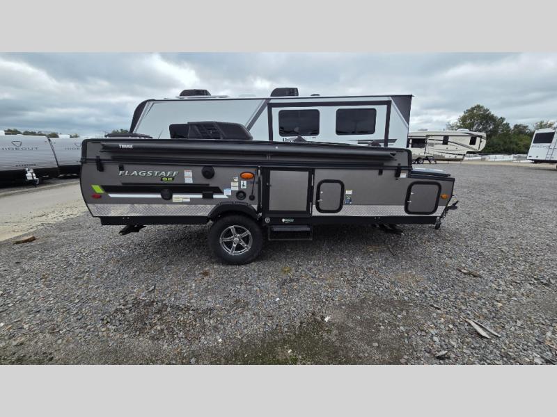 If outdoor sports are the reason you want to get away, then the Forest River Flagstaff SE folding pop-up camper is precisely what you need! These Sports Enthusiast Package (SE) campers have proven that they are sports-friendly and camping-approved. Built with a gray sport exterior, autumn wood interior, wood plank flooring, a black diamond plate, electric brakes, and aluminum wheels with 15" Mud Rover tires, the Flagstaff SE is ready for all sorts of outdoor experiences. There is a power roof lift to make set-up more effortless, and the ProRac permanent crossbars have a 150-LB rating to offer you accommodations for your outdoor gear. And don't overlook the 190W roof-mount solar panel that can be used to provide you with power as you search for a new secluded destination.