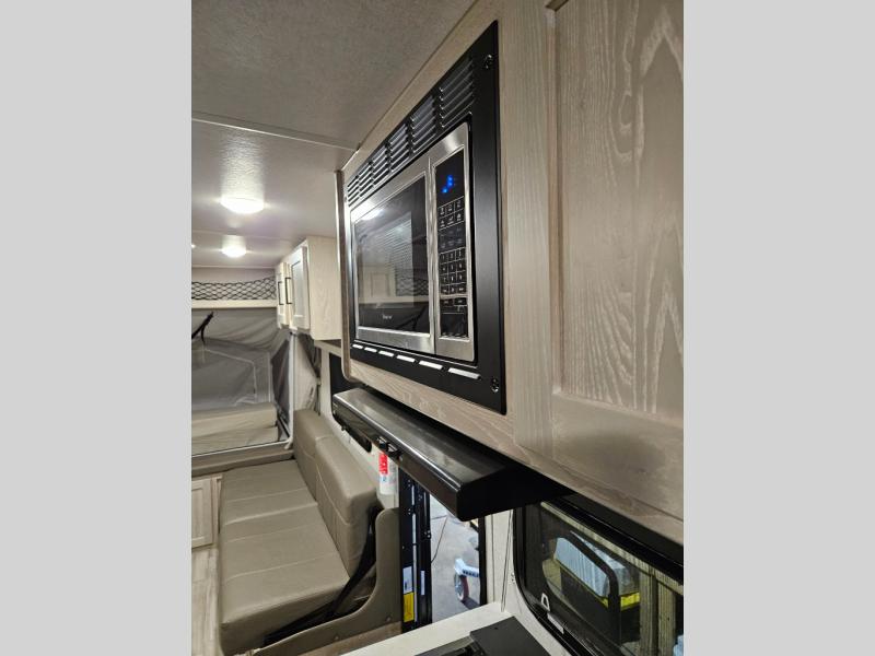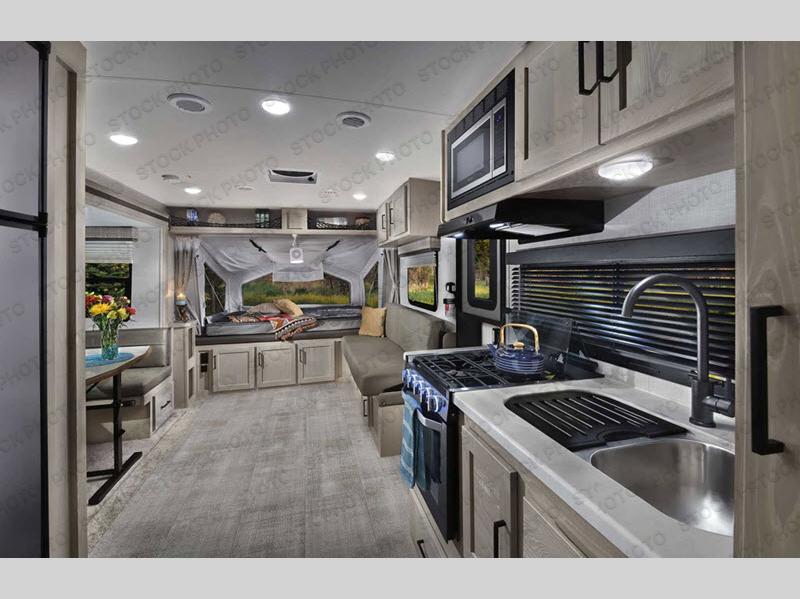 If you're looking for more sleeping space and added interior space, your search is over! This expandable includes three queen tent end beds, plus a U-shaped dinette and a flip sofa to sleep nine! A three burner cooktop and microwave oven in the kitchen will allow you to prepare meals each day, and there is an added exterior griddle for dinner outside. This model also includes an impressive amount of storage, including a kitchen pantry and exterior storage for hiking gear and tackle boxes!