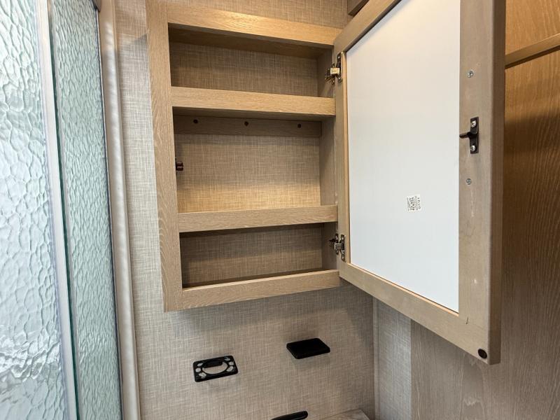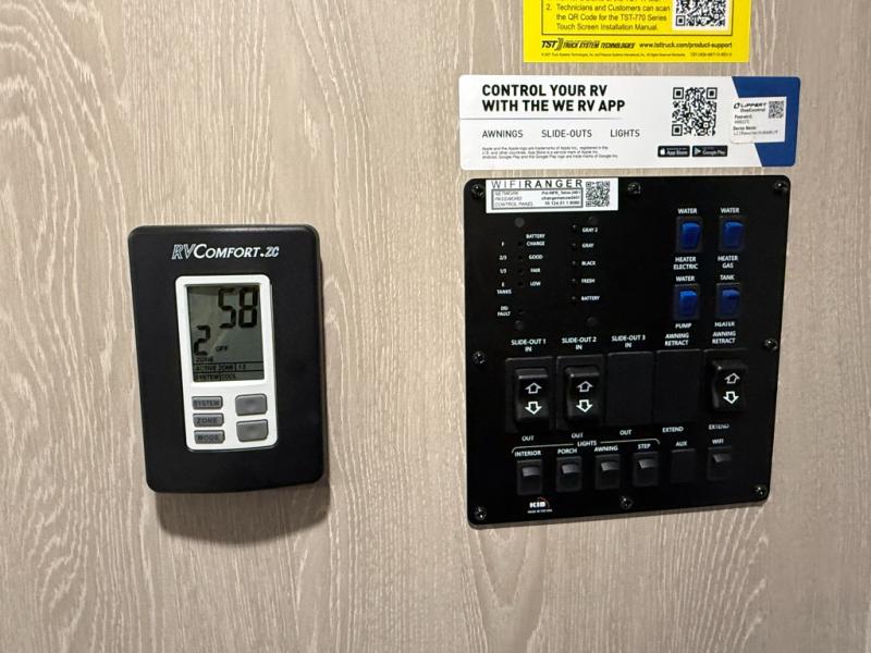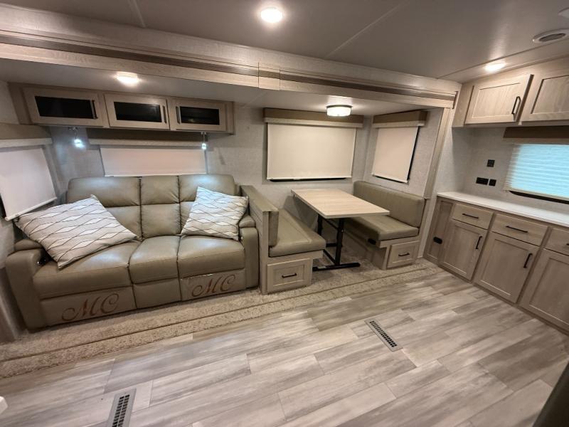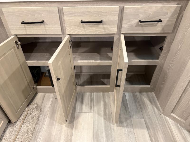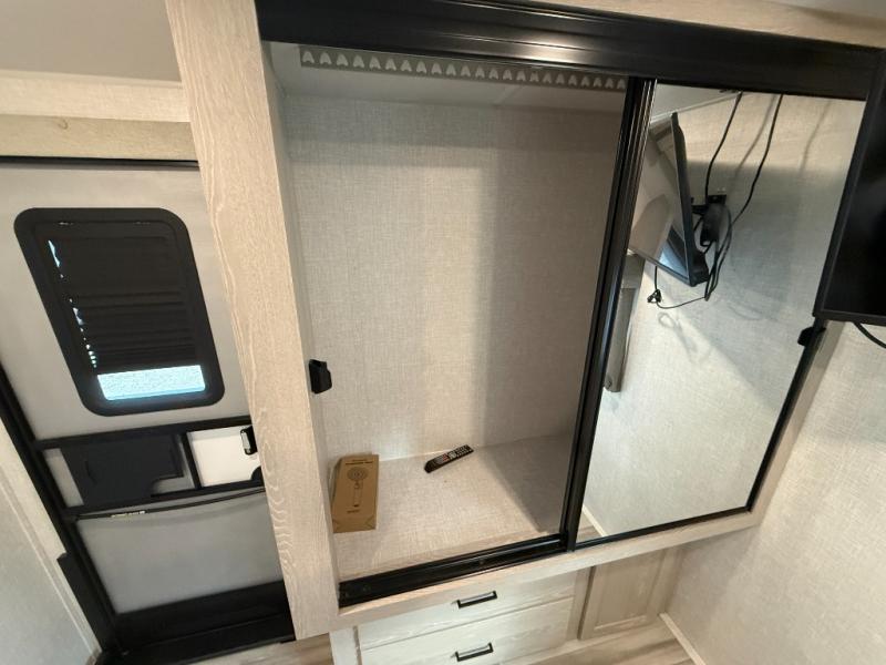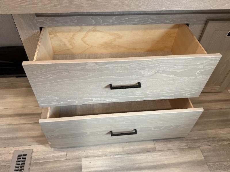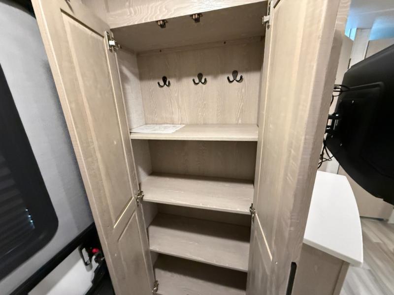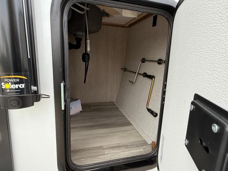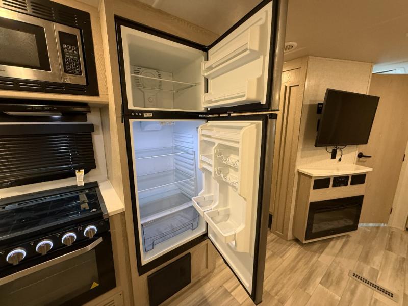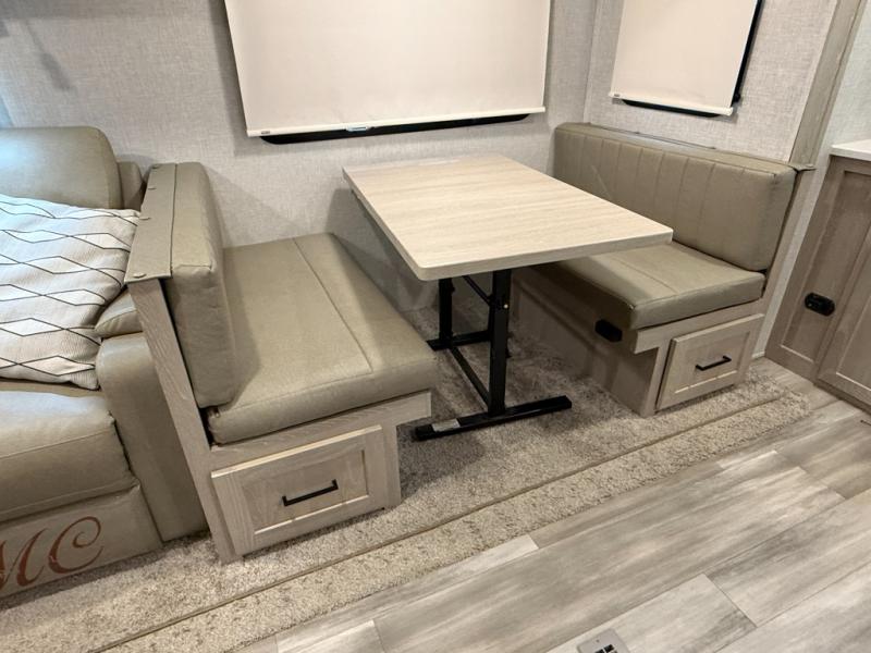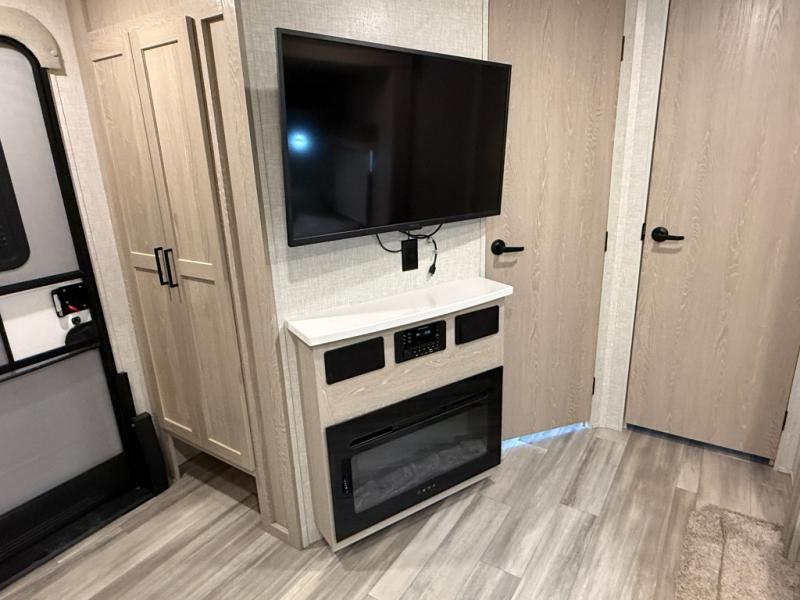 This is the perfect couples trailer with a spacious living and kitchen area and a rear bedroom which includes the second exterior entry/exit door! The bedroom also provides a slide out queen bed, a wardrobe and an optional TV, plus windows for great views and access to the double entry bathroom. The front kitchen gives the cook counter space and cabinetry for dishes and such, plus all the appliances needed to make warm meals and store leftovers. You can dine at the booth dinette, relax on the 67" theater seating and watch the LED TV while enjoying the fireplace.