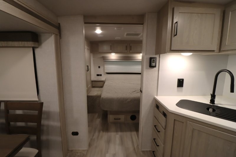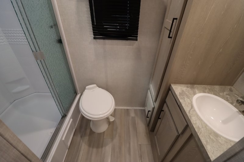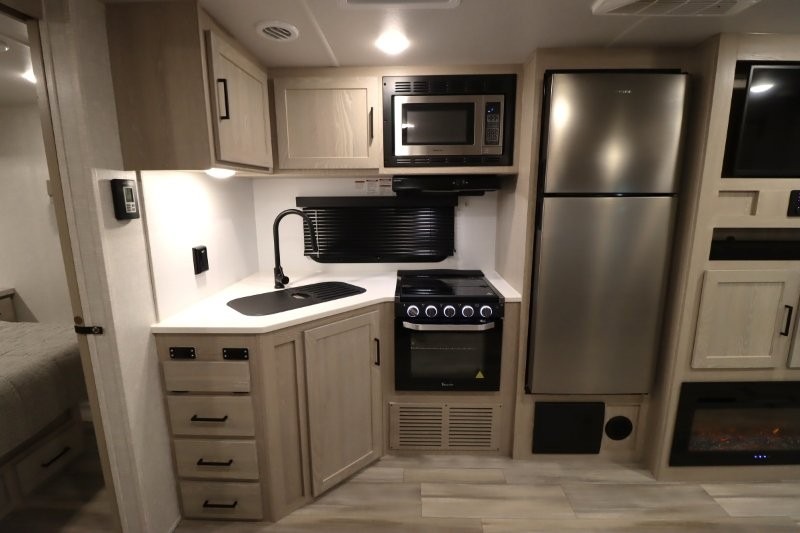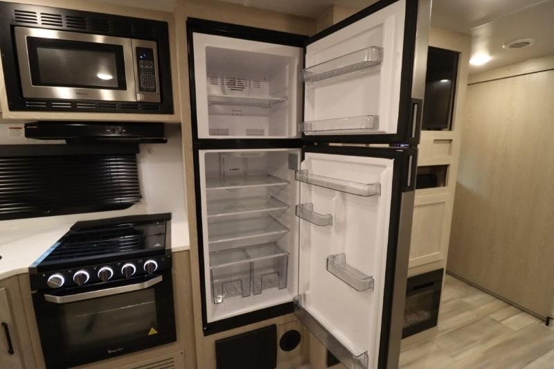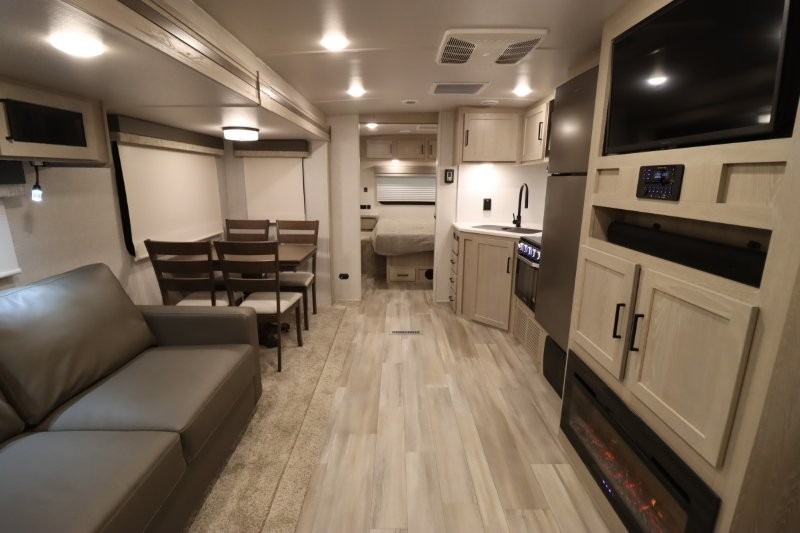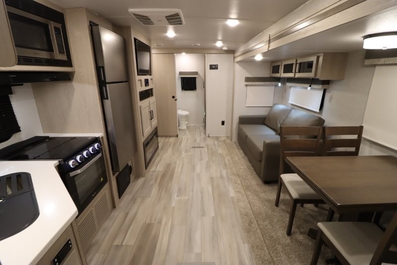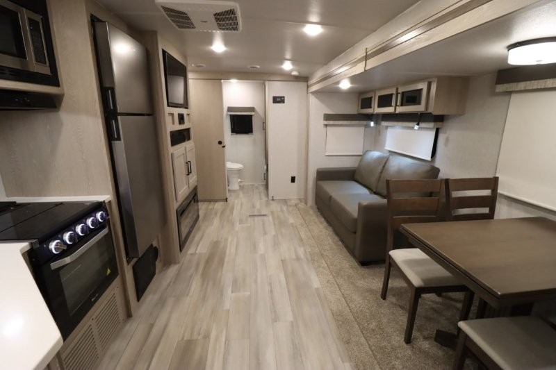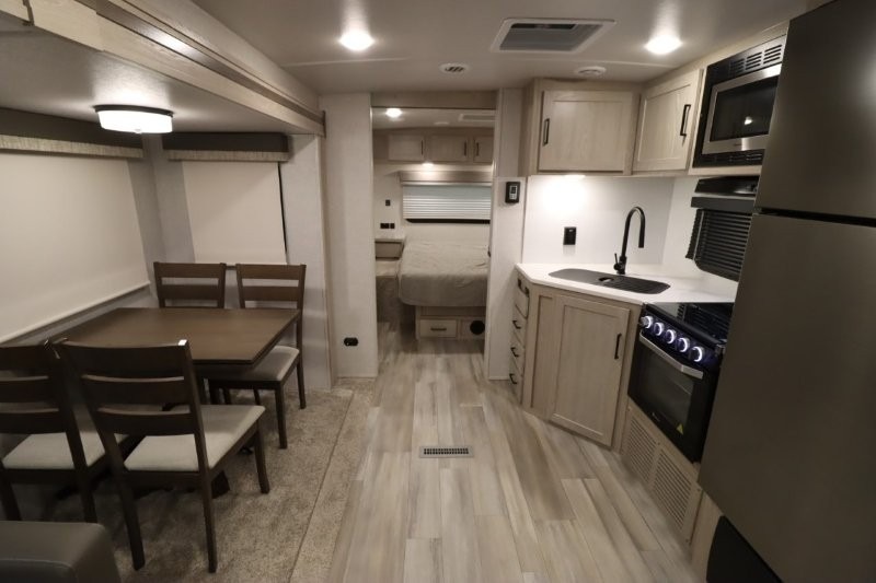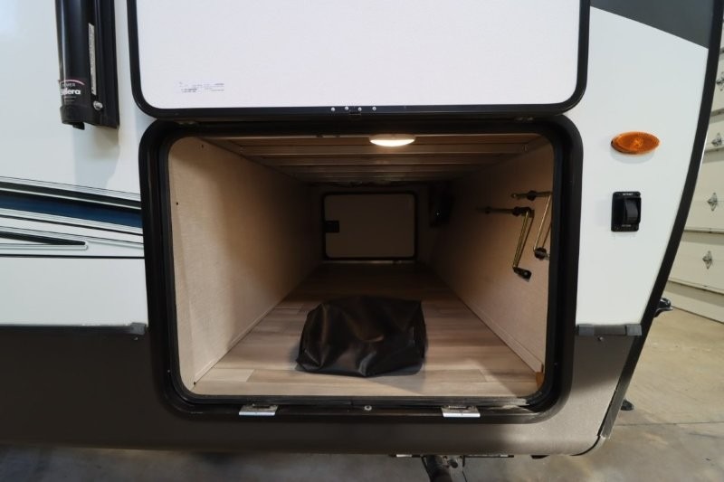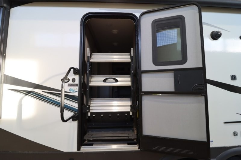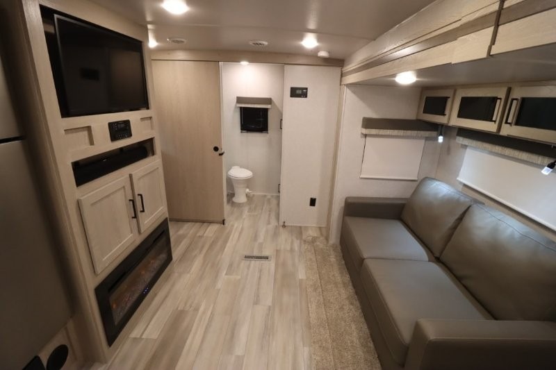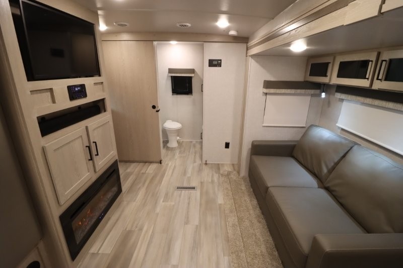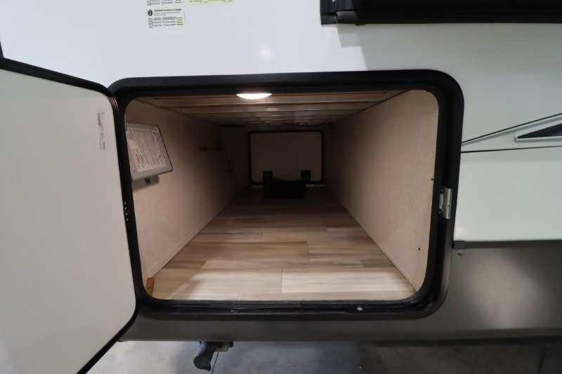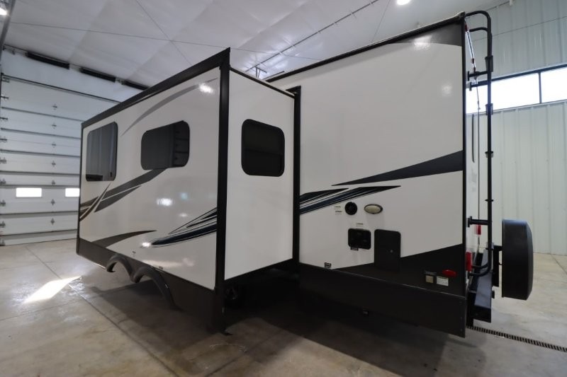 Enjoy inside comforts, and outside conveniences in this trailer. You can relax under the 21' awning which offers an outdoor living area protected from the elements, and a front drop frame pass-through storage allowing you to take camping chairs, tables, fishing poles and such. Enjoy privacy in the rear full bathroom with a space savings sliding door, and a spacious living and kitchen area thanks to the slide out with furniture that also doubles as sleeping space for your kids or guests. The cook will have full amenities to make meals, and when you are ready to sleep, head to the front bedroom with a queen bed and plenty of storage, and a slide out giving you more floor and storage space.