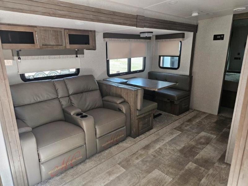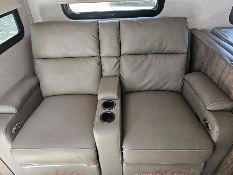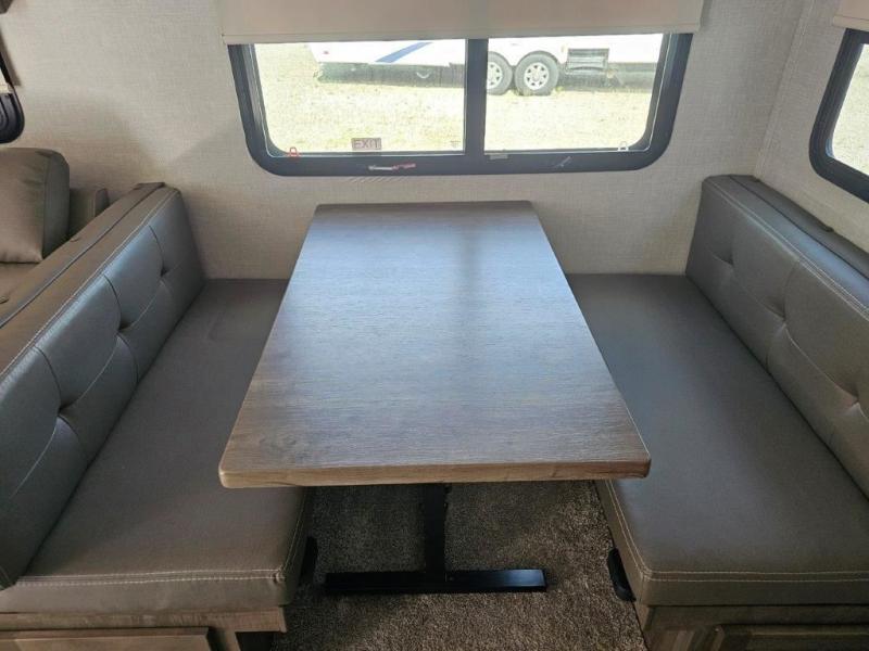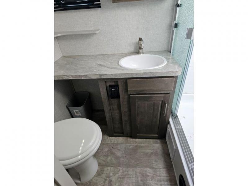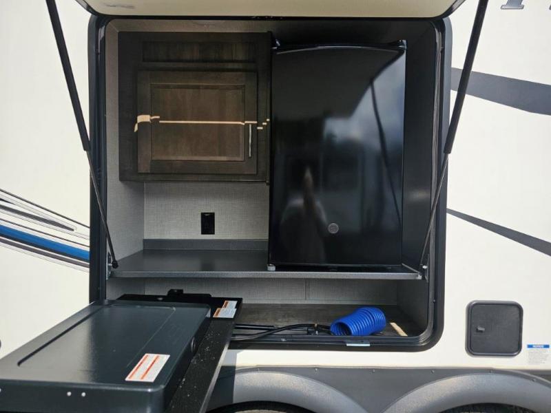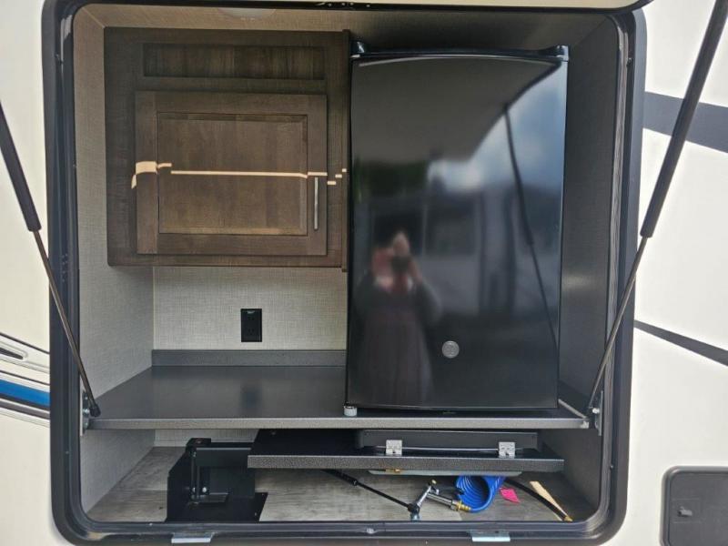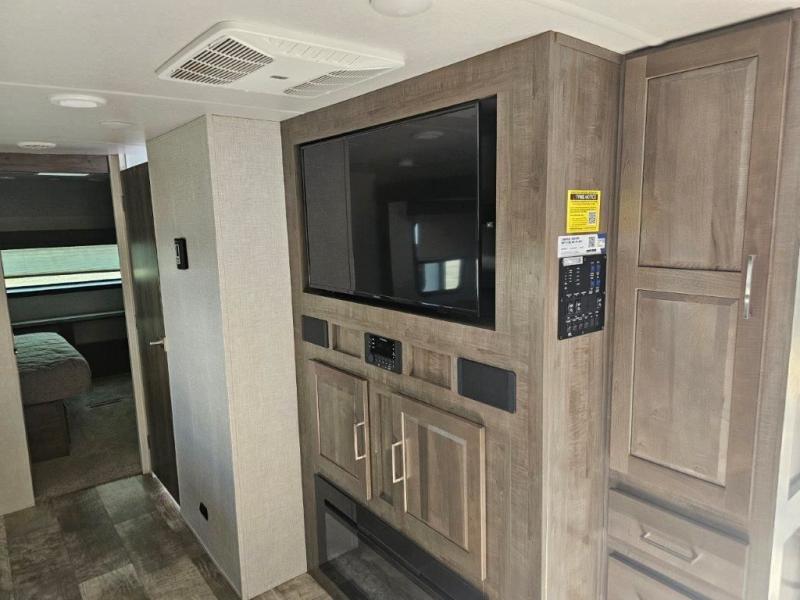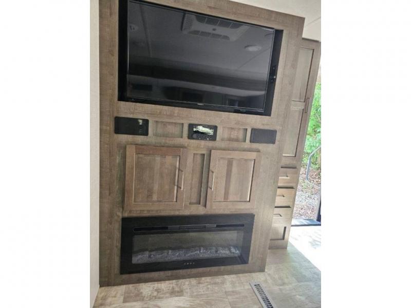 Whether you camp at state parks, National forests or on your friend's land, this trailer offers you plenty of floor space thanks to the two slide outs! As you enter the main entrance near the rear kitchen you can grab a drink from the refrigerator or a snack from the pantry and relax on the 60" theater seating or sit at the booth dinette. The LED TV offers entertainment while the fireplace will keep you cozy during the cooler months. Everyone will appreciate having a full bathroom to get cleaned up in, and the front bedroom gives you privacy and a queen bed slide, plus storage and the second exterior entry.