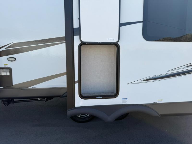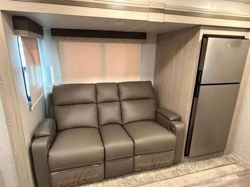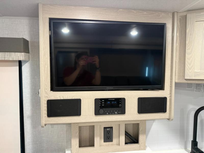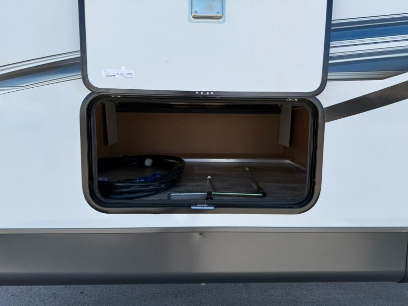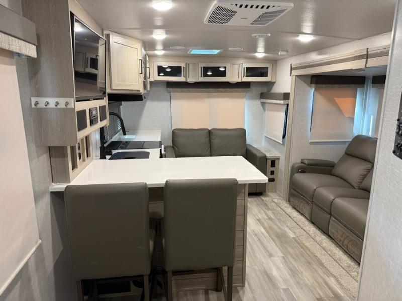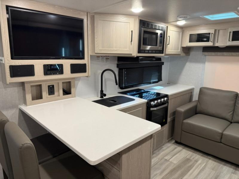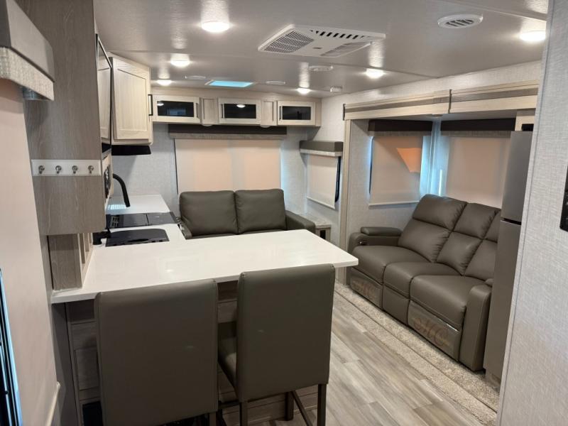 Whether you looking for breakfast nook-style seating, theater seats for movie nights or a spacious front bedroom, you will find it all in this trailer! The bar top with chairs and LED TV allow you to dine while enjoying your favorite show, and the 67" theater seats make watching movies more comfortable and fun. You can also relax on the hide-a-bed sofa and your guests will love sleeping here. The full bathroom has two entries which is super convenient, and the front bedroom gives you a slide out queen bed for more floor space, a wardrobe and more storage along the front wall.
