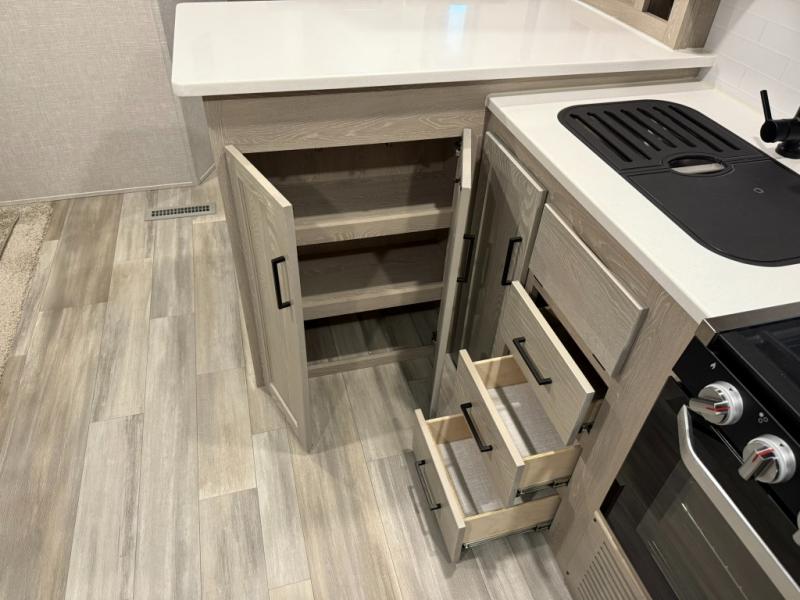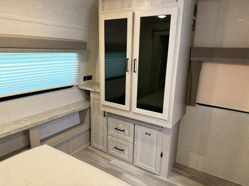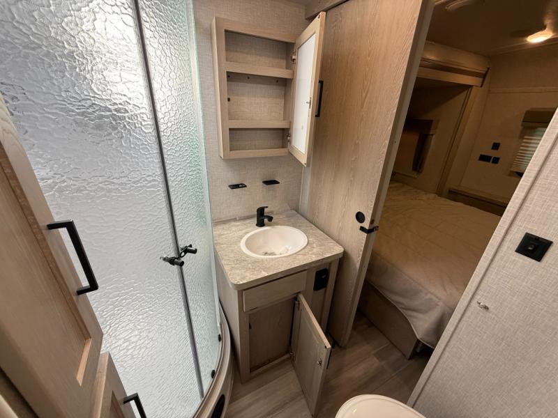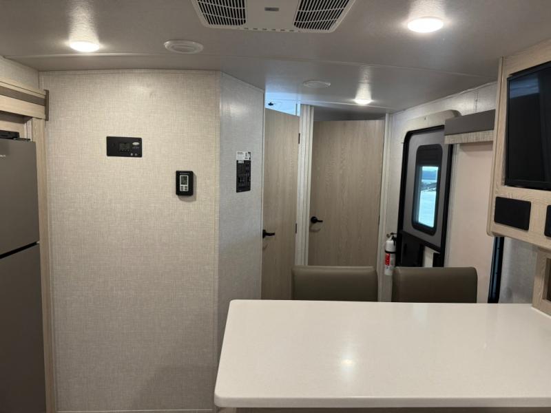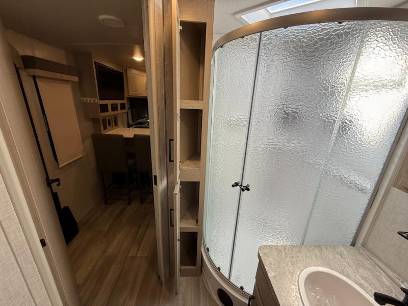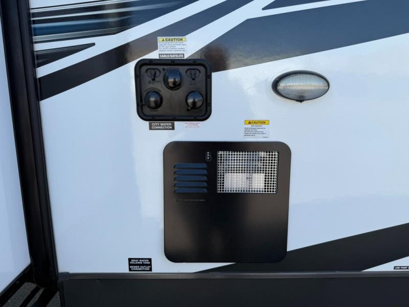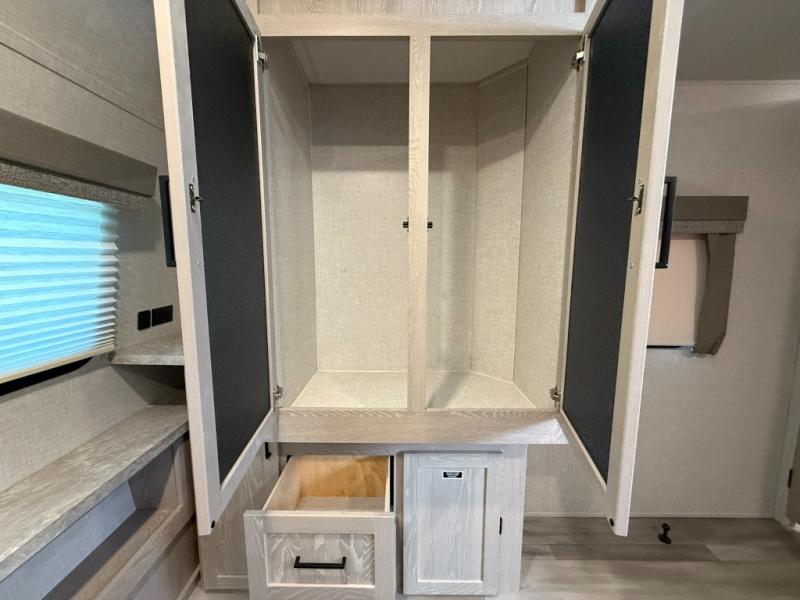 Whether you looking for breakfast nook-style seating, theater seats for movie nights or a spacious front bedroom, you will find it all in this trailer! The bar top with chairs and LED TV allow you to dine while enjoying your favorite show, and the 67" theater seats make watching movies more comfortable and fun. You can also relax on the hide-a-bed sofa and your guests will love sleeping here. The full bathroom has two entries which is super convenient, and the front bedroom gives you a slide out queen bed for more floor space, a wardrobe and more storage along the front wall.