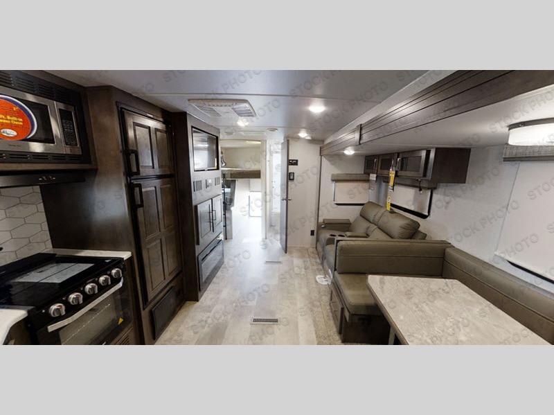 Get ready for a fun camping experience with your family and friends in this trailer that sleeps nine! From the rear double size bunks to the front bedroom's queen bed, and the furniture in the spacious main living area, everyone will find a place to lay their head at night. The cook will have full amenities inside and the choice to make meals on the outside kitchen when feeding everyone, and storage is abundant for your snacks and dry ingredients in the walk-in pantry, your cold items in the double door refrigerator, and throughout the interior and along the exterior. You can load the larger gear in the front drop frame pass-through storage, and other outdoor items in the rear or side storage compartments.