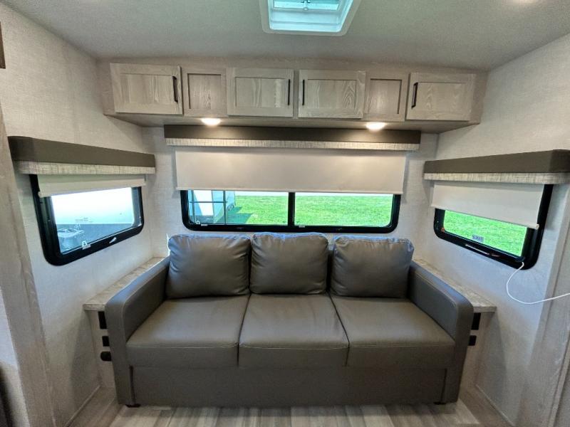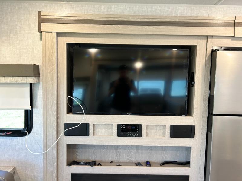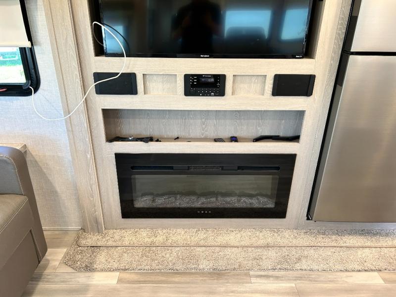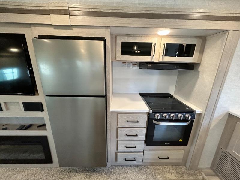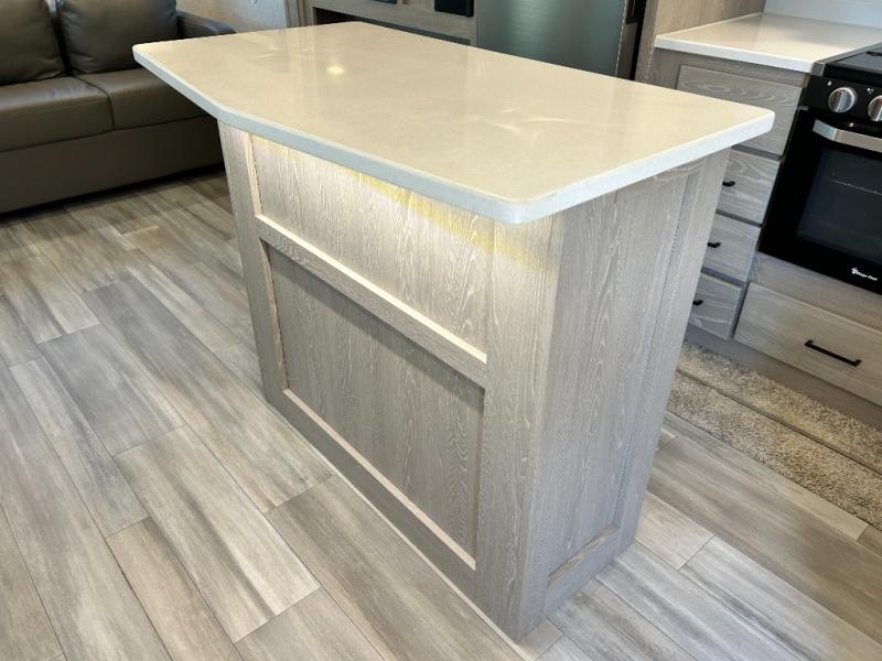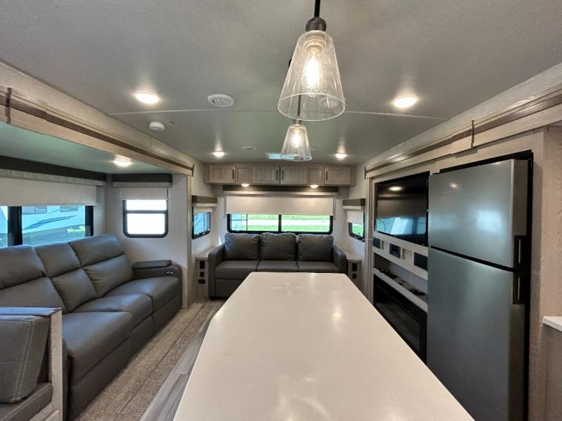 If you enjoy entertaining friends while camping, this trailer offers seating for nine in the combined living and kitchen area on the hide-a-bed sofa, the theater seats and the booth dinette. Everyone can visit, watch the LED TV and enjoy the fireplace all while the cook is preparing snacks in the kitchen with full amenities. The snacks and drinks can be served from the center island, and everyone can enjoy all the views out of the windows along the rear and door side wall. The full bathroom has two entries for convenience, and the front bedroom offers a queen bed slide for more floor space or choose a king option, plus plenty of storage. And the two 11' awnings offer an outdoor living area after you add your camping chairs.
