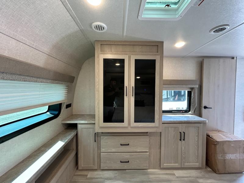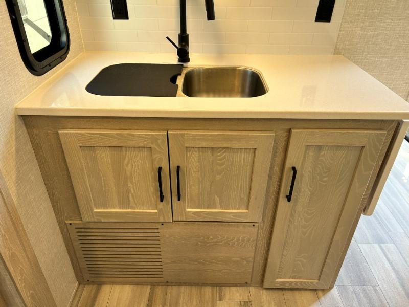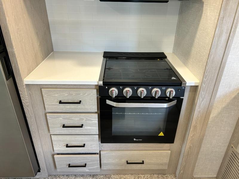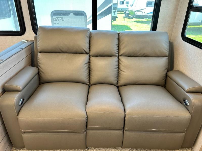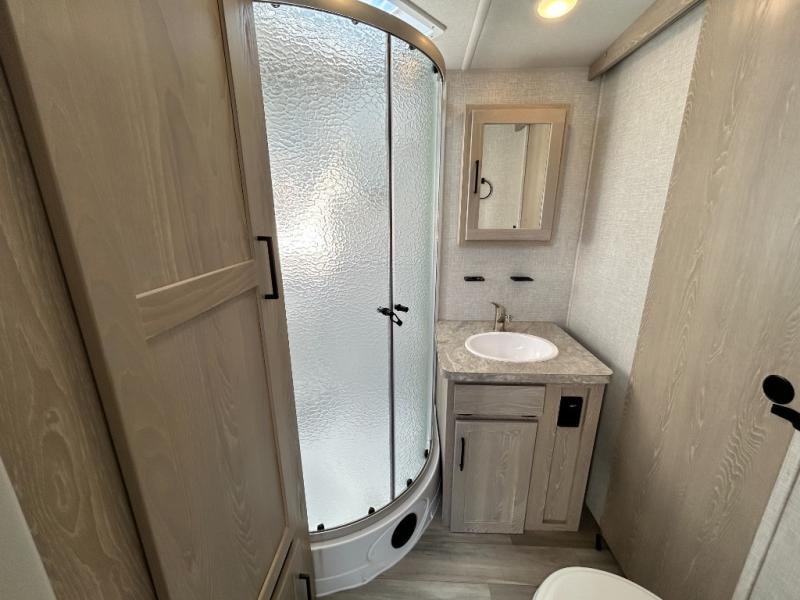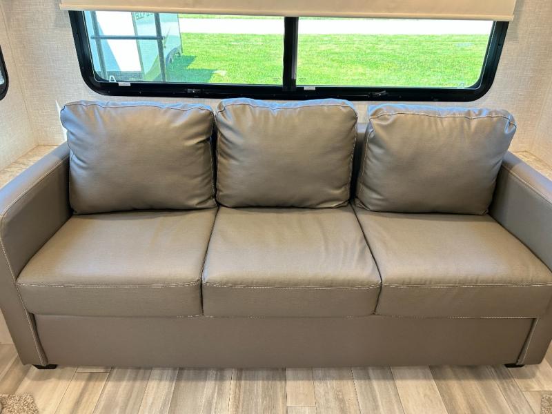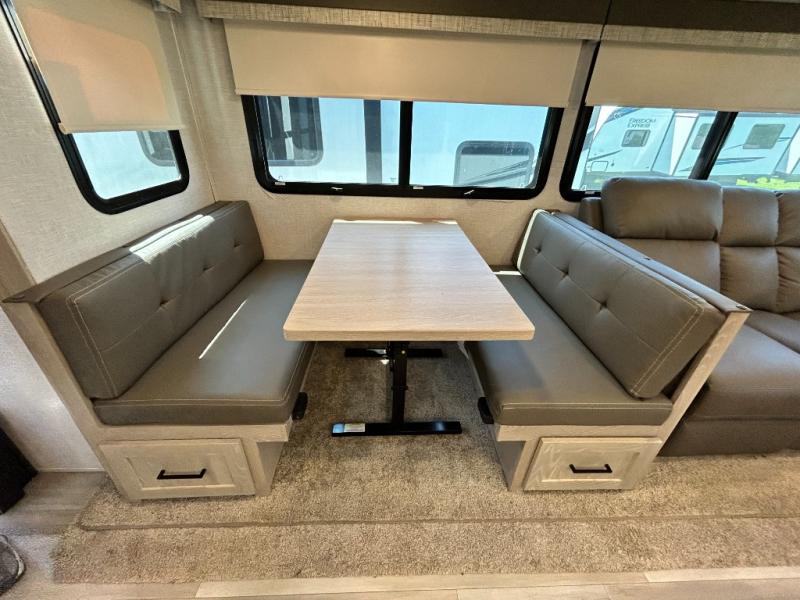 If you enjoy entertaining friends while camping, this trailer offers seating for nine in the combined living and kitchen area on the hide-a-bed sofa, the theater seats and the booth dinette. Everyone can visit, watch the LED TV and enjoy the fireplace all while the cook is preparing snacks in the kitchen with full amenities. The snacks and drinks can be served from the center island, and everyone can enjoy all the views out of the windows along the rear and door side wall. The full bathroom has two entries for convenience, and the front bedroom offers a queen bed slide for more floor space or choose a king option, plus plenty of storage. And the two 11' awnings offer an outdoor living area after you add your camping chairs.