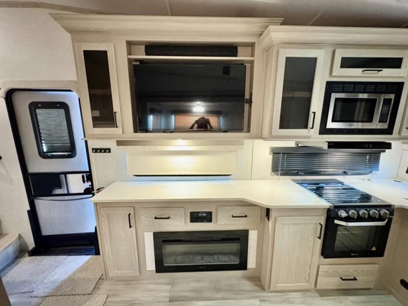 The perfect couple's fifth wheel offers privacy in a front bedroom with a queen bed, a slide out wardrobe providing more floor space, and more storage for your things. You have found it in this Flagstaff Super Lite! You will also appreciate the second entry into the bathroom from the bedroom, and the linen storage in the bathroom and the radius shower that saves floor space. The cook will love all the counterspace and cabinets provided in the rear kitchen and along the side wall, plus the ceiling fan can keep the air circulating when the air conditioner is off. And the king U-shaped dinette allows you to play games, dine and even work with lots of seating and table space for many to gather when you invite guests over.