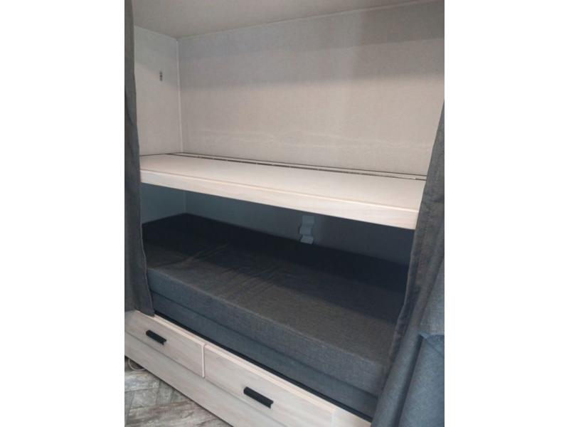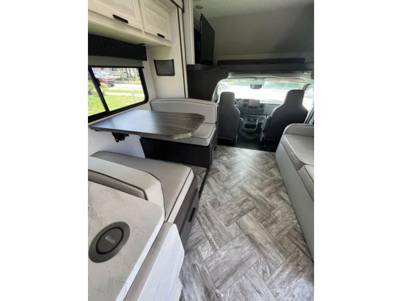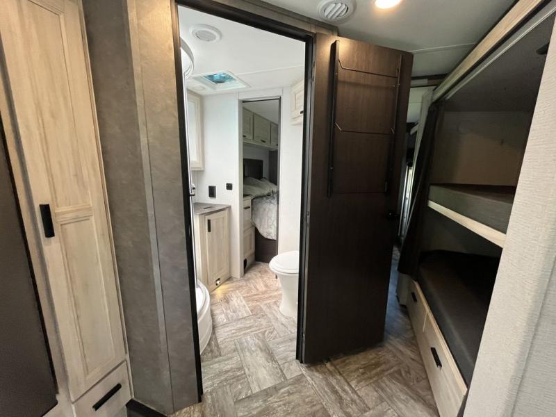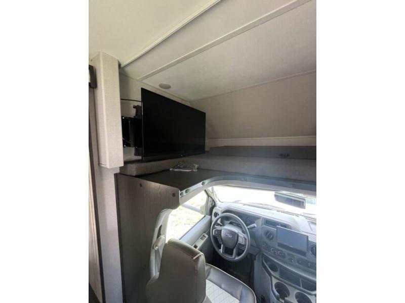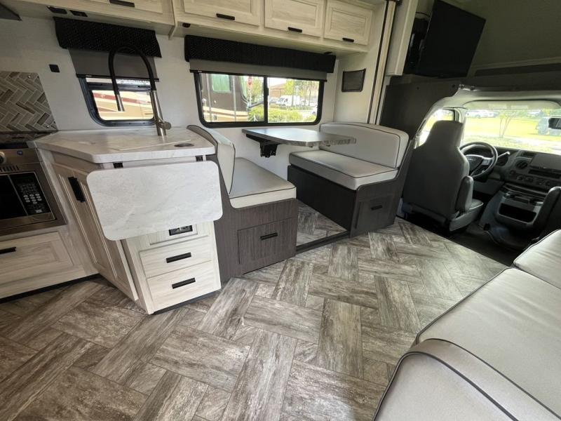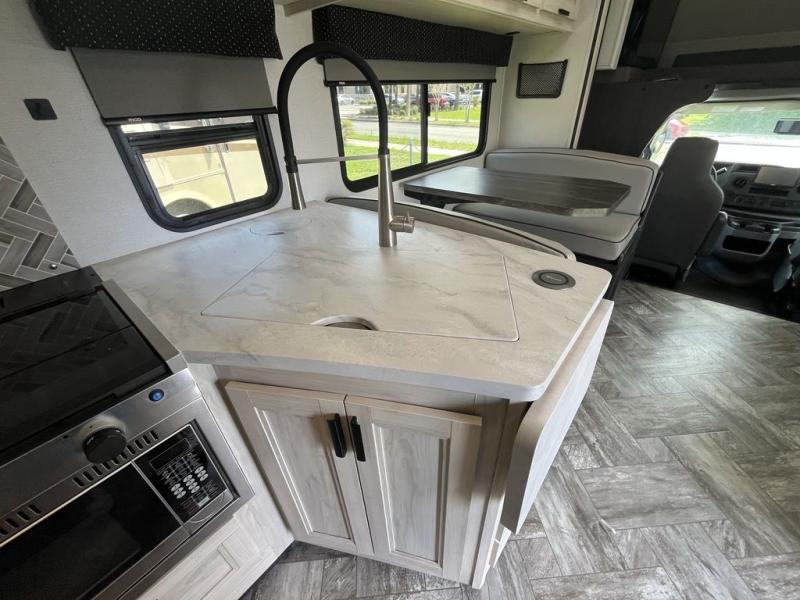 The whole family can travel together in this motorhome! There is a set of 27" x 72" bunk beds, a 60" x 80" bunk over cab mat, and a 60" x 74" queen bed to lay your heads at night, plus the sofa and the booth dinette can transform into extra sleeping spaces if needed. Everyone can easily access the dual entry bathroom which has a 32" x 32" radius shower to freshen up in each morning. The kitchen has everything you need to prepare your best meals like a three burner cooktop, a 10 cu. ft. 12V refrigerator with a pantry, an undermount 1.3 cu. ft. convection microwave, and a flip-up countertop. You can even choose to add an optional outside 12V TV to watch the big game in the great outdoors!