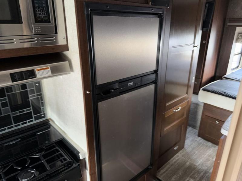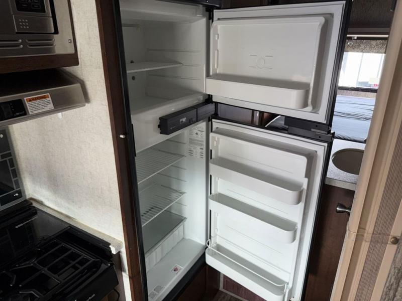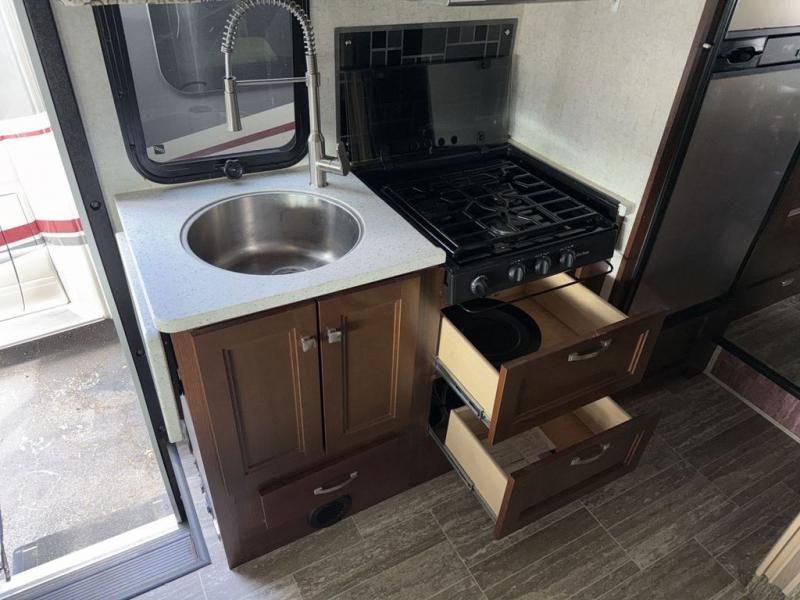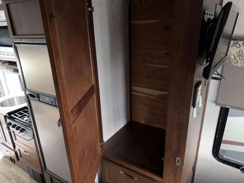 When you are ready to enjoy camping and traveling, take this coach with you! From the leather, swivel driver and passenger seats to the full bathroom, you can enjoy the view with less stops along the way. Once at your destination, easily set up the large slide and power awning, and relax on the U-shaped dinette or outside under the awning. You might even like to add the optional exterior TV. Back inside, you can make meals using the two-burner range and the convection microwave, and the 10 cu. ft. 12V refrigerator will hold all your drinks and cold items. There is a flip-up counter extension for more prep space, and a pantry for your dry goods. At night, sleep on a queen bed while you watch the 12V TV in the bedroom, and your friends can sleep on the cab over bunk and the U-shaped dinette while watching the living area 12V TV.