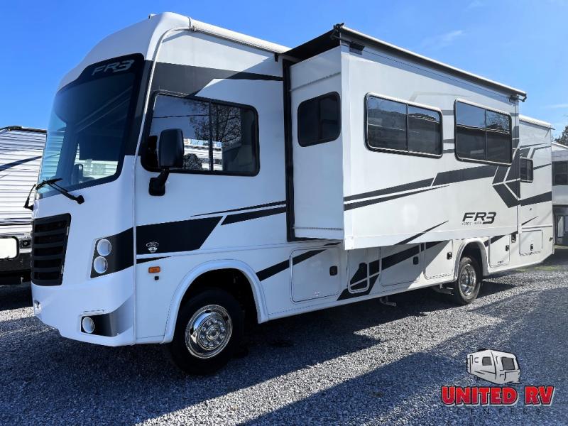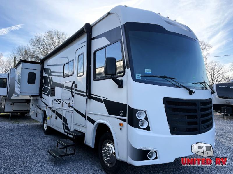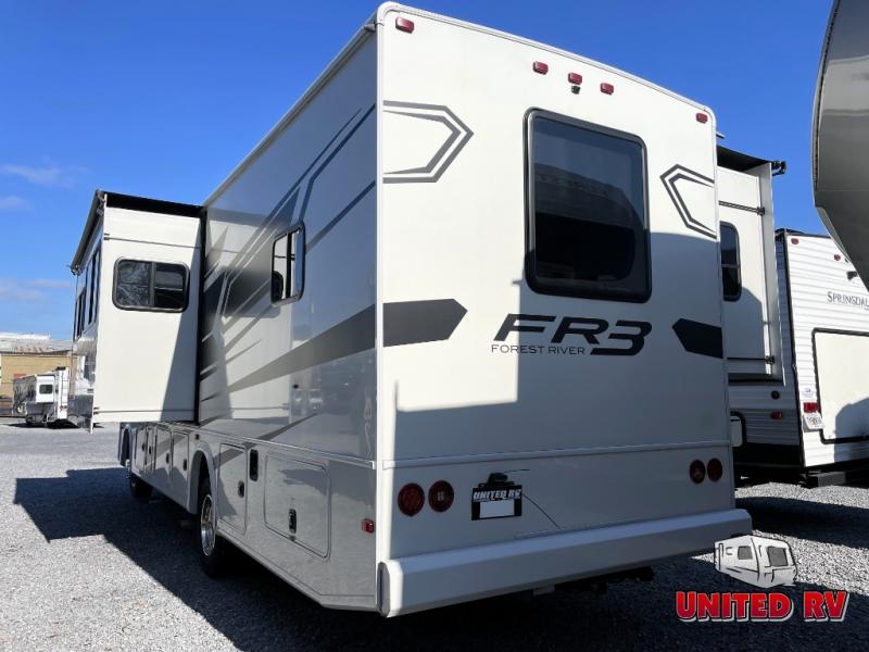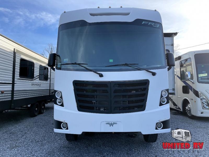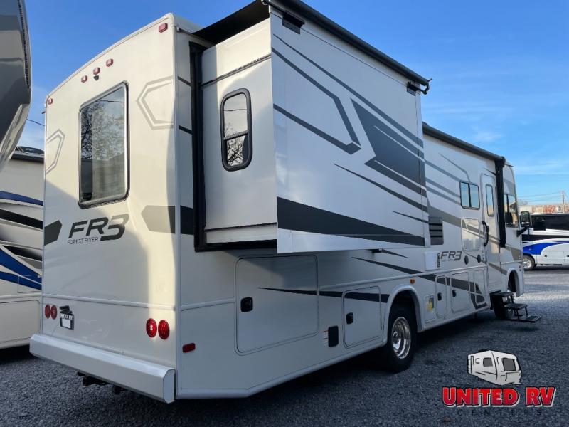 With each FR3 Class A gas motorhome by Forest River, you will find an easy-to-drive coach with a spacious interior allowing you to gather with friends and family with convenience and style found throughout! Each is built with vacuum-bonded construction, a one-piece fiberglass roof with extended rain spouts, a steel firewall and A-pillar extension, Bi-LED headlamps and lower LED fog lights, and grey Rotocast storage boxes with drains, plus more! Inside, you will enjoy black hardware, appliances, plumbing fixtures, and a glass shower door frame. Plus, you will also find a stainless steel kitchen sink with a bamboo cutting board and roll-up dryer, heavy-duty full-extension ball bearing drawer guides, dual-access dinette storage with doors, and nightstands with charging stations to keep your cellphones ready for whatever is next. Make your selection today!