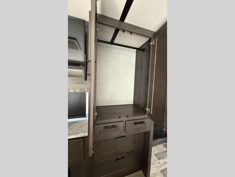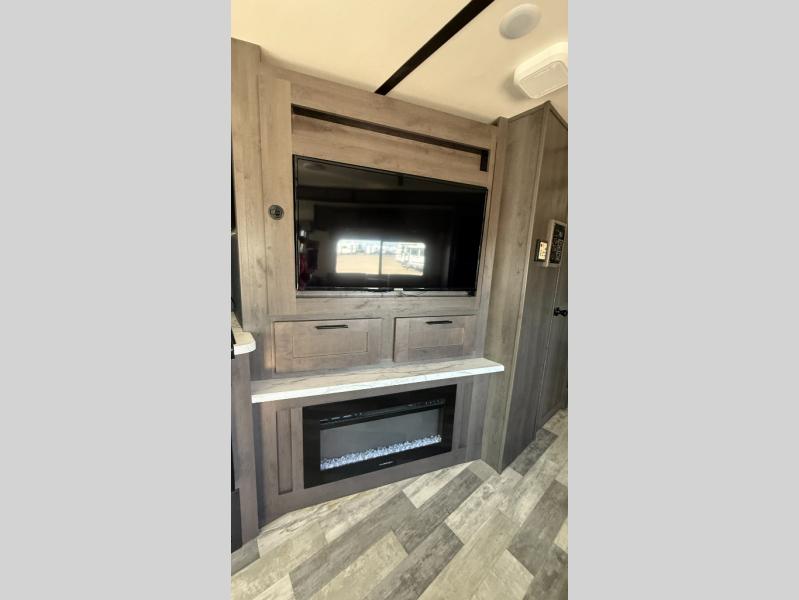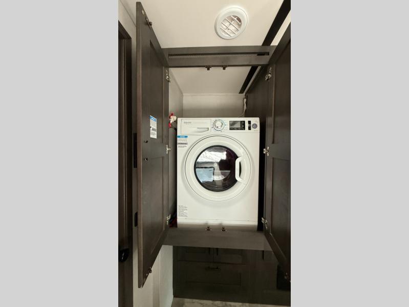 Spacious and inviting for couples or families, this FR3 Class A gas motorhome offers convenience throughout including a half bath for the kids and guests and a full rear bathroom for the owners. This full bathroom is located within the rear master suite where you will also find a king-size bed for relaxing. Once at your destination, you can quickly set up the power awning to relax outside while watching the exterior TV and visiting with other RVers. You might have decided to add the washer and dryer option in the bedroom, so a load of laundry might even get done. Once you are ready to fill your tummy, the full kitchen offers everything you need plus a residential microwave. You might even decide to relax on one of the theater seats after dinner as you watch the big game on the 43" LED TV with a fireplace below.