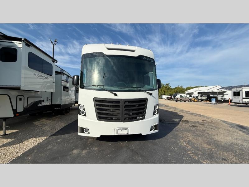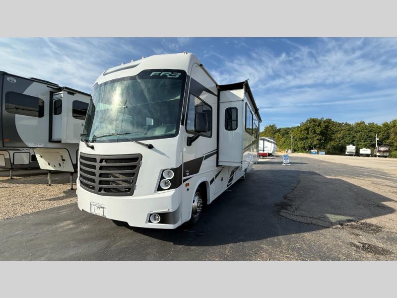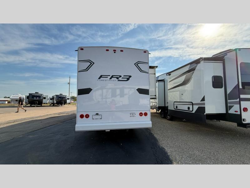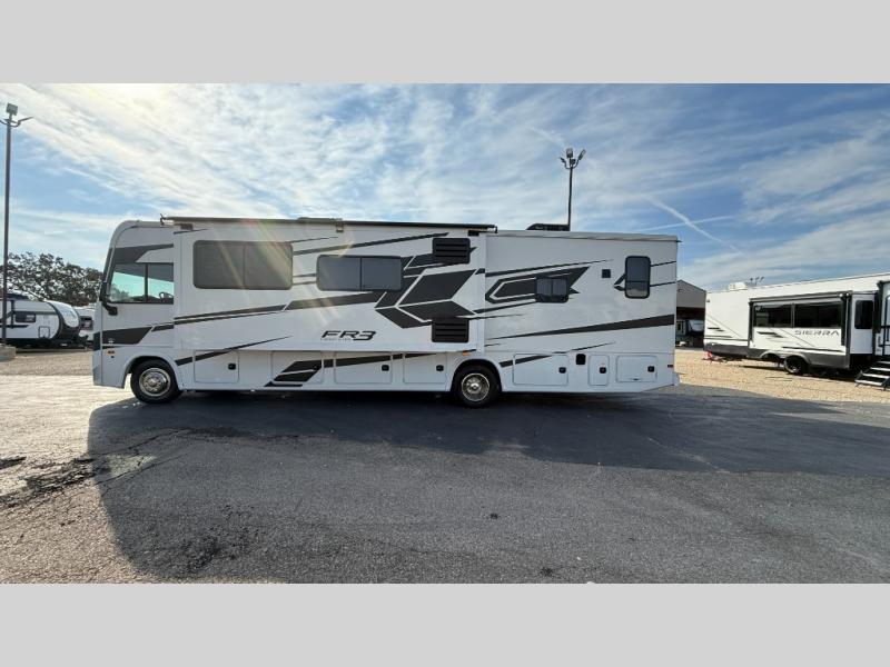 With each FR3 Class A gas motorhome by Forest River, you will find an easy-to-drive coach with a spacious interior allowing you to gather with friends and family with convenience and style found throughout! Each is built with vacuum-bonded construction, a one-piece fiberglass roof with extended rain spouts, a steel firewall and A-pillar extension, Bi-LED headlamps and lower LED fog lights, and grey Rotocast storage boxes with drains, plus more! Inside, you will enjoy black hardware, appliances, plumbing fixtures, and a glass shower door frame. Plus, you will also find a stainless steel kitchen sink with a bamboo cutting board and roll-up dryer, heavy-duty full-extension ball bearing drawer guides, dual-access dinette storage with doors, and nightstands with charging stations to keep your cellphones ready for whatever is next. Make your selection today!