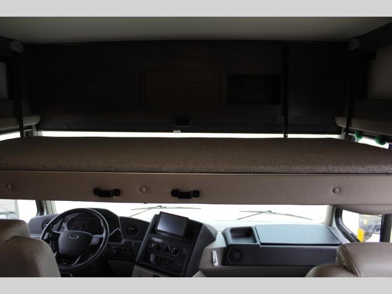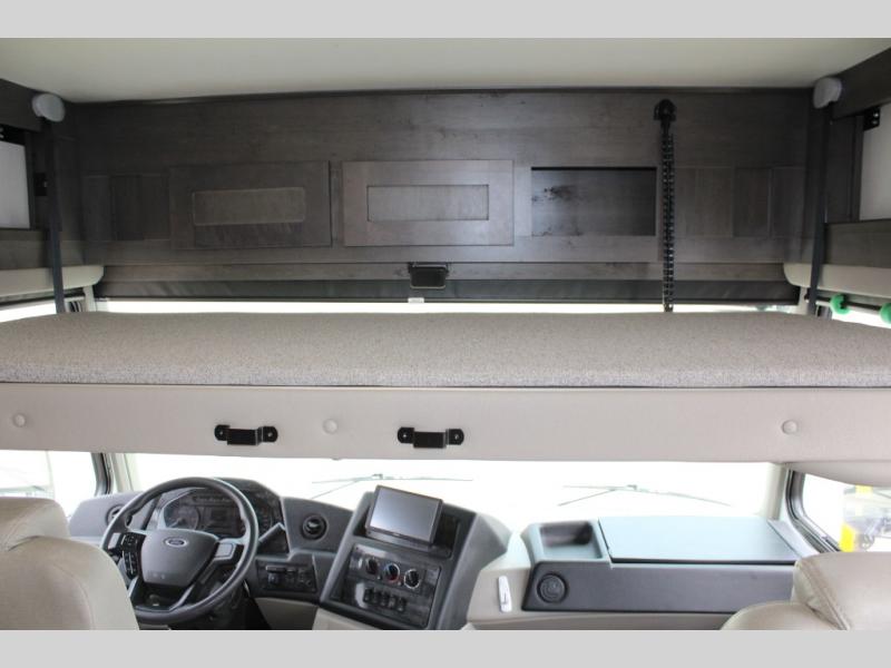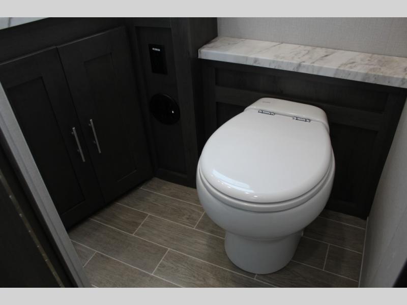 You won't believe all that the rear private bedroom has to offer in this motorhome! It features a 72" x 80" king bed slide with overhead cabinets, a dresser with a 32" TV and overhead cabinets, wardrobes on either side of the dresser, and a desk with wardrobes on either side of too, plus one of the wardrobes is even prepped to add an optional washer and dryer. The separated bathroom makes it easy for one person to freshen up in the shower with a seat while another uses the private toilet and sink. After a long day of traveling, you can relax on either the Thomas Payne theater seating with heat and massage across from the 5,000 BTU fireplace with a 40" LED TV above it or play a game and eat a meal at the Dream Dinette. There is also a 42" x 80" P2K Euro loft power bunk over cab for more sleeping space!