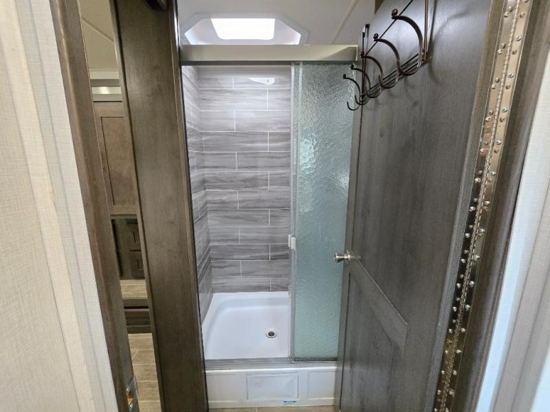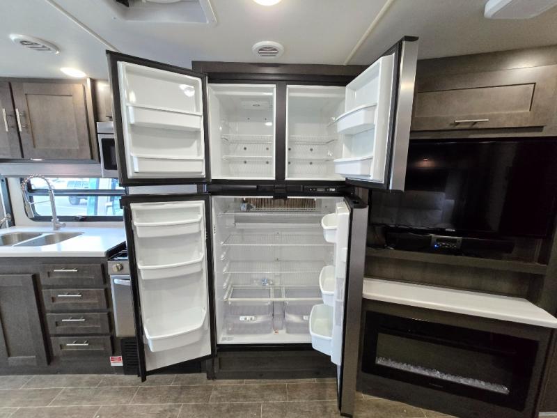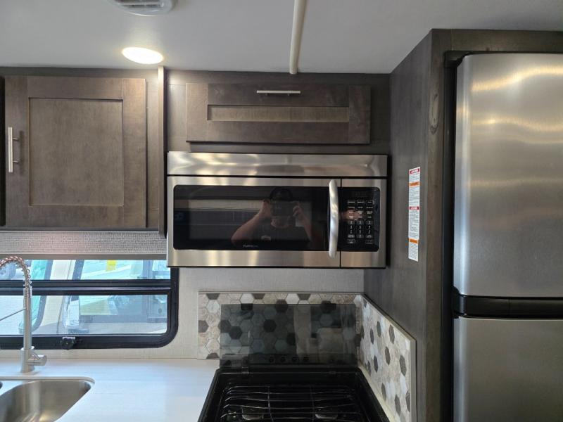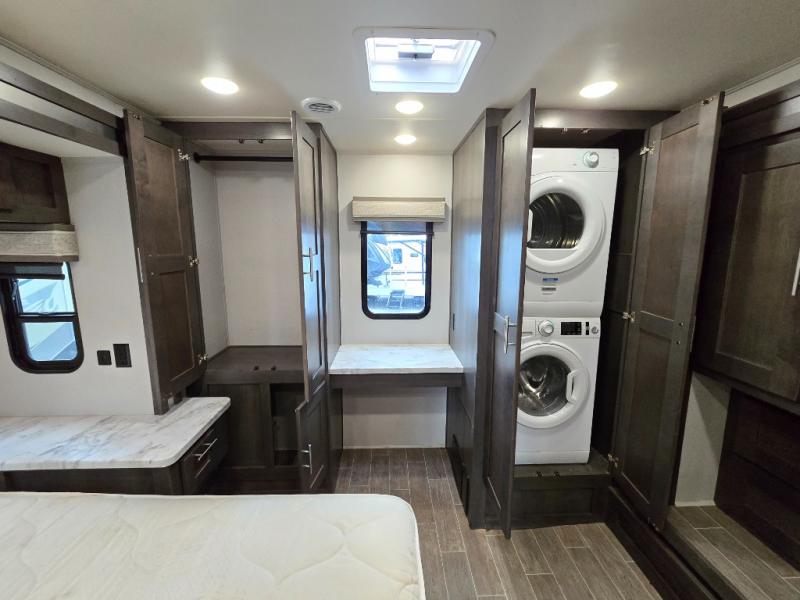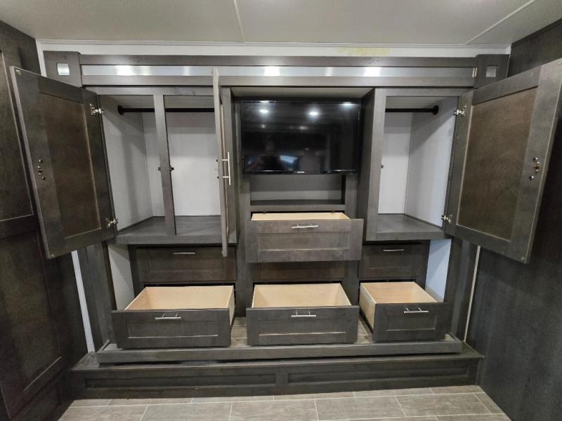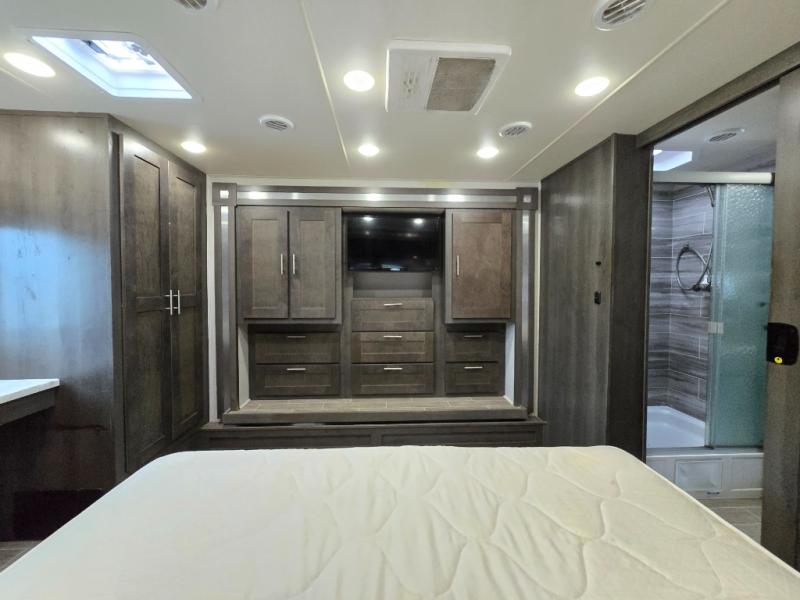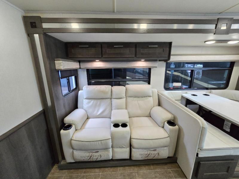 You won't believe all that the rear private bedroom has to offer in this motorhome! It features a 72" x 80" king bed slide with overhead cabinets, a dresser with a 32" TV and overhead cabinets, wardrobes on either side of the dresser, and a desk with wardrobes on either side of too, plus one of the wardrobes is even prepped to add an optional washer and dryer. The separated bathroom makes it easy for one person to freshen up in the shower with a seat while another uses the private toilet and sink. After a long day of traveling, you can relax on either the Thomas Payne theater seating with heat and massage across from the 5,000 BTU fireplace with a 40" LED TV above it or play a game and eat a meal at the Dream Dinette. There is also a 42" x 80" P2K Euro loft power bunk over cab for more sleeping space!
