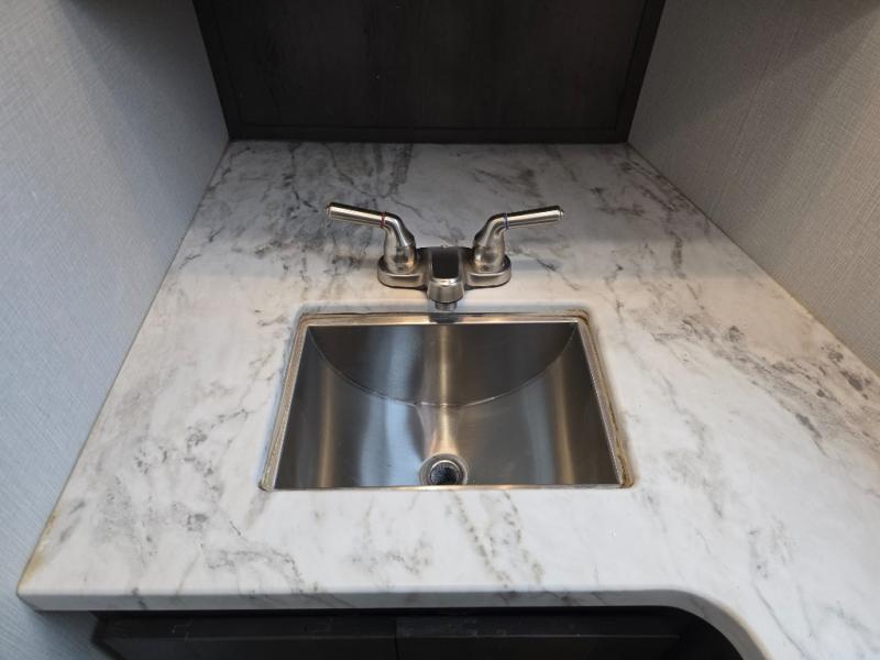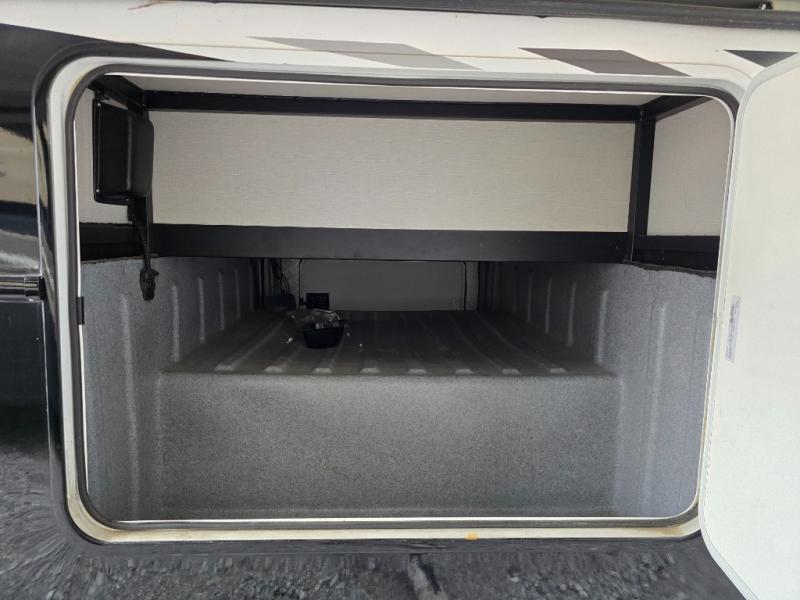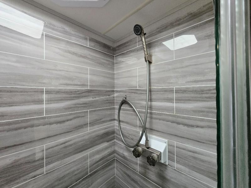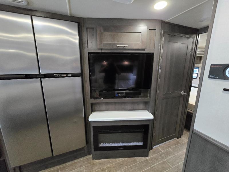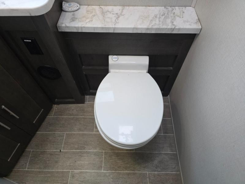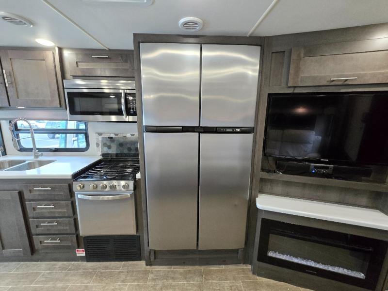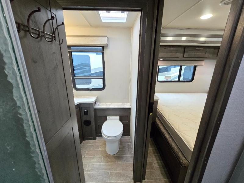 You won't believe all that the rear private bedroom has to offer in this motorhome! It features a 72" x 80" king bed slide with overhead cabinets, a dresser with a 32" TV and overhead cabinets, wardrobes on either side of the dresser, and a desk with wardrobes on either side of too, plus one of the wardrobes is even prepped to add an optional washer and dryer. The separated bathroom makes it easy for one person to freshen up in the shower with a seat while another uses the private toilet and sink. After a long day of traveling, you can relax on either the Thomas Payne theater seating with heat and massage across from the 5,000 BTU fireplace with a 40" LED TV above it or play a game and eat a meal at the Dream Dinette. There is also a 42" x 80" P2K Euro loft power bunk over cab for more sleeping space!