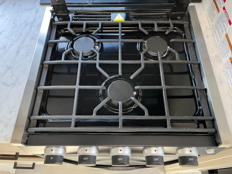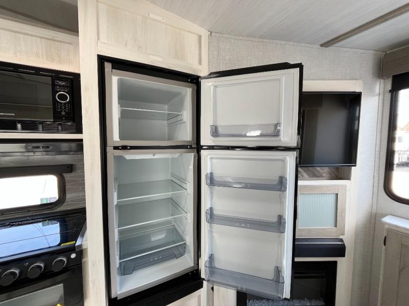 The kitchen in the Impression is designed for convenience and real meal prep. Featuring a full-size refrigerator, three-burner cooktop, oven, microwave, and generous countertop space, this kitchen gives you the flexibility to prepare anything from quick breakfasts to full dinners. Plenty of cabinets and pantry storage help keep your cookware and groceries organized and easily accessible.