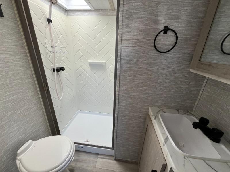 Functional shower, toilet, and vanity make daily routines easy and comfortable on the road.