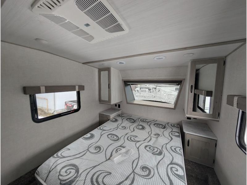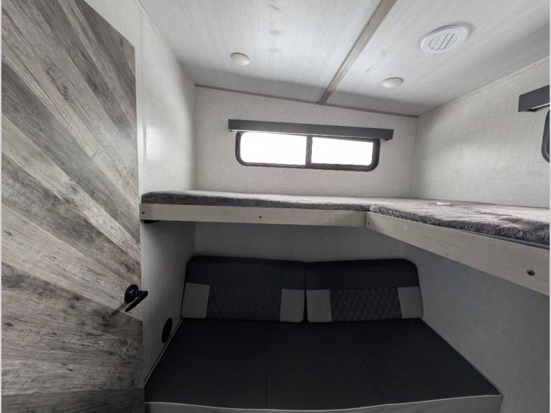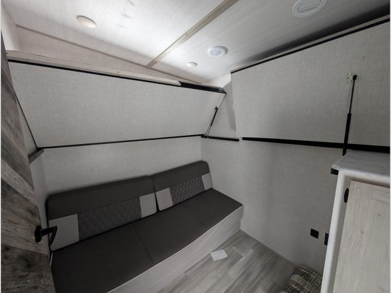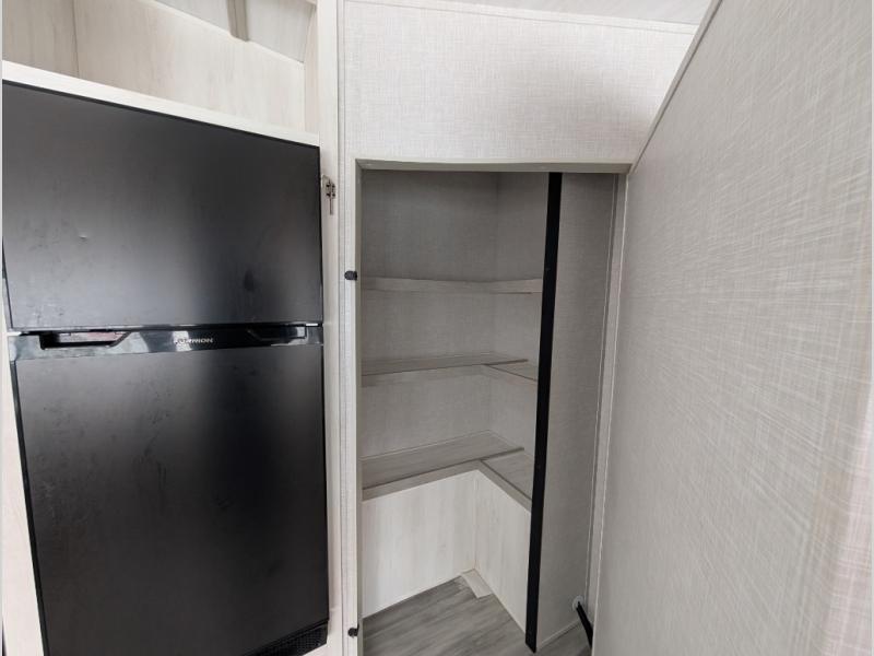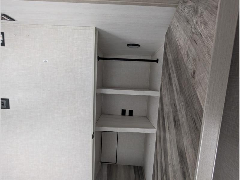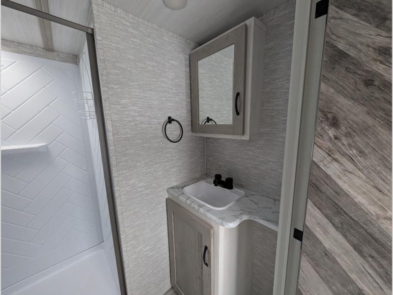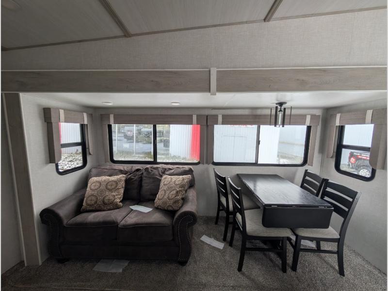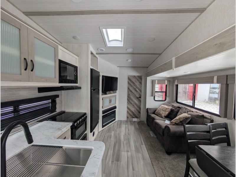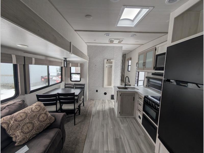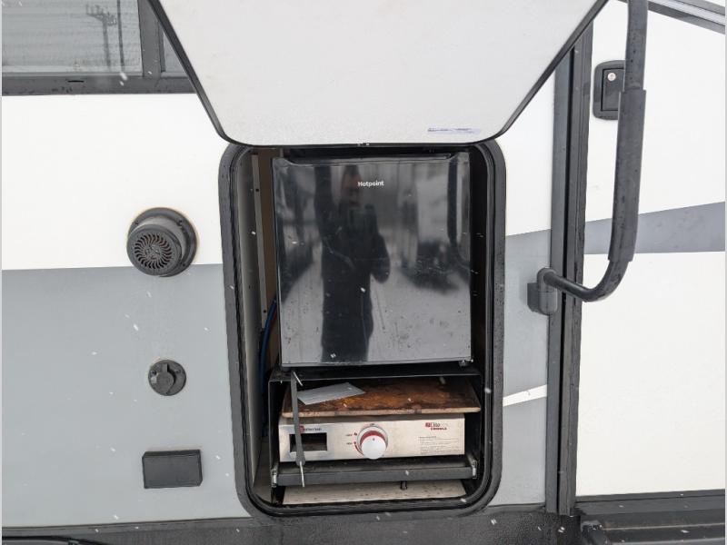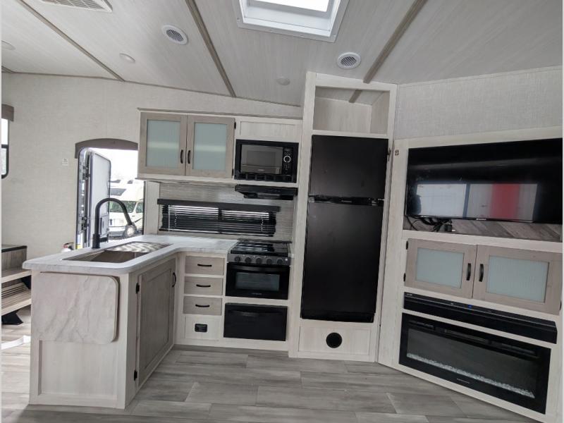 This fifth wheel is going to make an impression on anyone that steps foot inside or walks around the outside! From having a second entry/exit door into the rear bunkhouse and a main entry into the living and kitchen area, plus having an outside kitchen to make meals in the great outdoors, nobody will ever want to go home! The rear bunkhouse also includes a Versa queen bed plus two flip-down upper bunks, plus storage. The front bedroom gives you privacy from everyone and there is a walk-around queen bed, three wardrobes and a space prepped for a washer/dryer option. The full bathroom will keep everyone refreshed, and the inside kitchen has full amenities including an L-shaped counter. There is hidden storage behind the 40" LED TV with fireplace below.