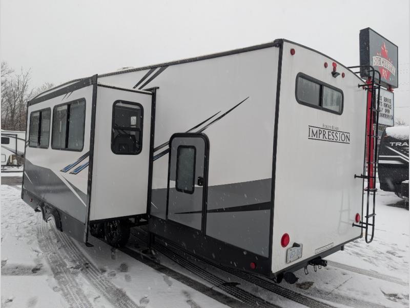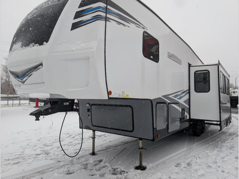 With any Impression mid-profile fifth wheel by Forest River, the focus of the design is comfort and value, built with quality craftsmanship and attention to customer's desires in each Impression! The exterior includes upgraded E-rated Goodyear Endurance tires made in the U.S.A., custom exterior graphics package, and One Touch automatic leveling system for easy setup. There is also an enclosed docking station and a gel coat fiberglass front cap with an automotive windshield with LED lights for style and beautiful views. The fully heated and enclosed AccessiBelly has removable underbelly panels and offers four seasons of travel. The interior has oversized opening windows in the living area for more natural lighting and good air flow, a stainless steel single bowl sink with high rise faucet with a pulldown sprayer to easily clean the dishes, and a porcelain foot flush toilet to mention a few comforts and conveniences.