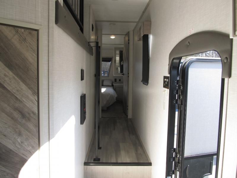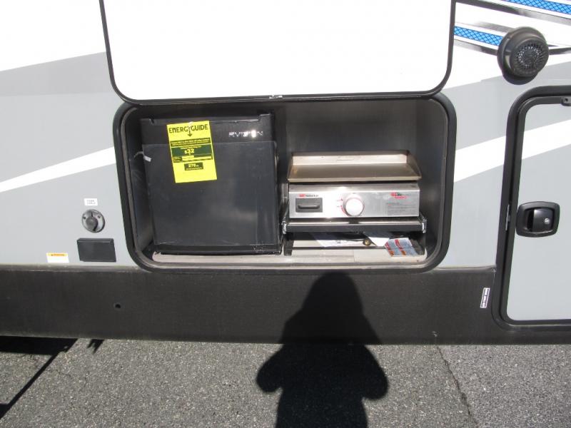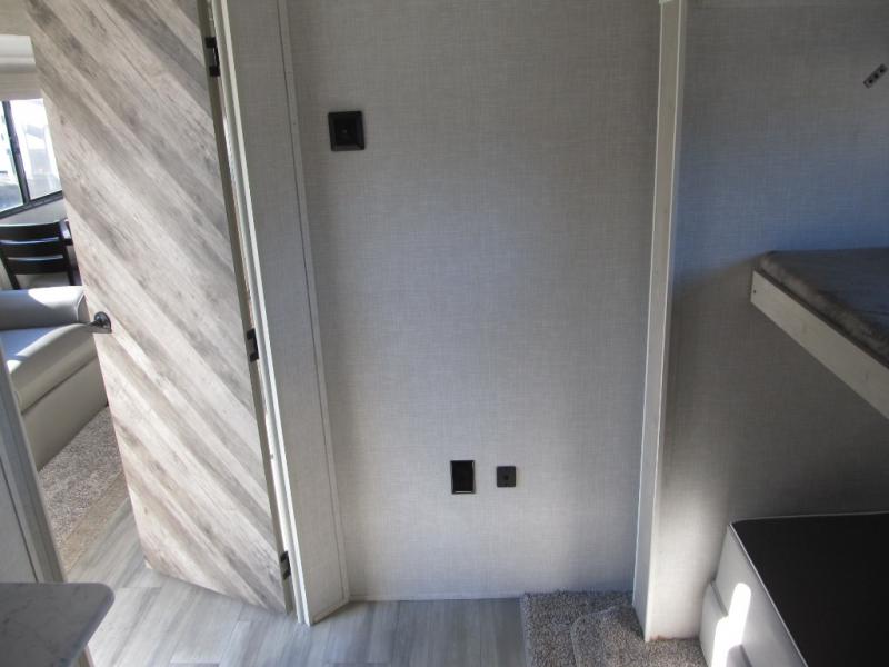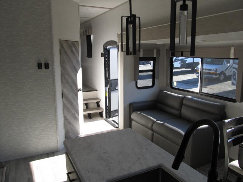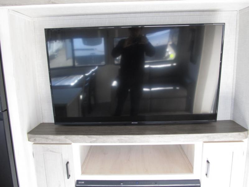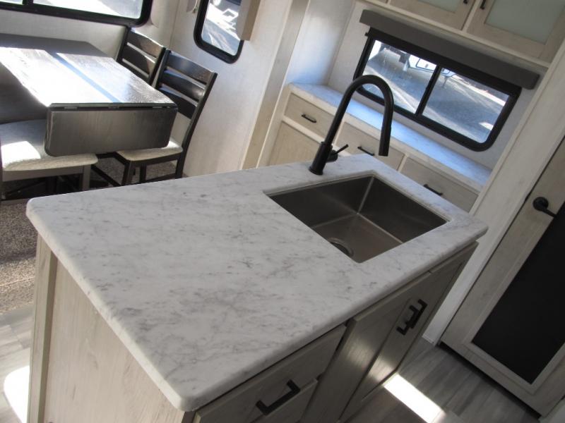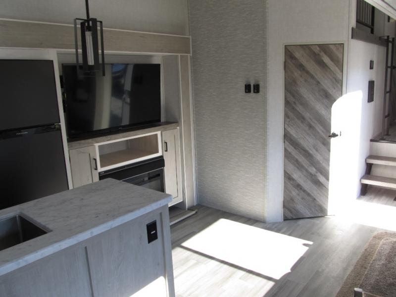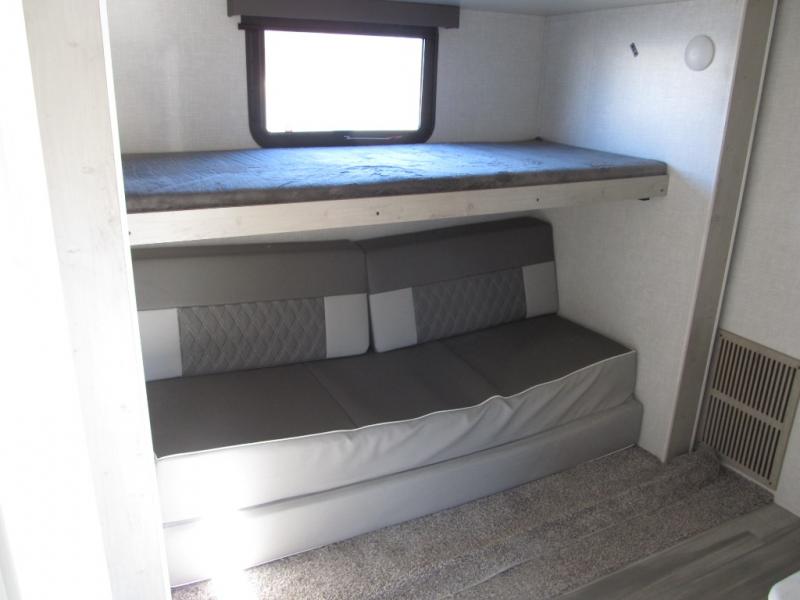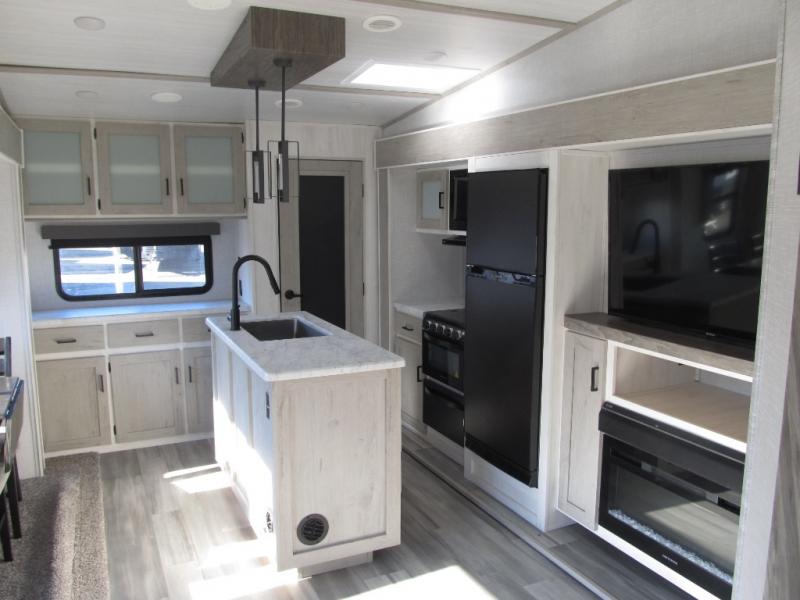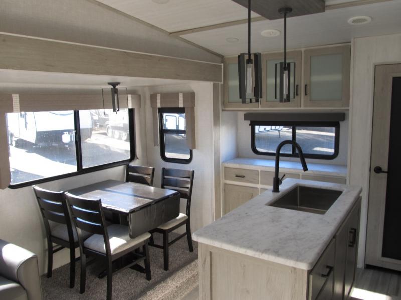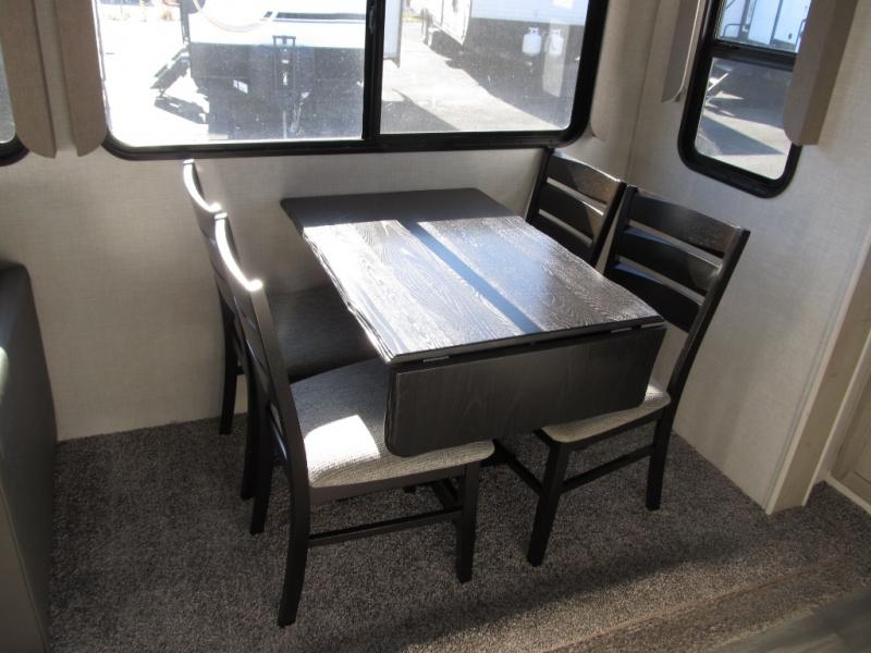 Wow! This fifth wheel will surely make an impression with its middle bunkhouse that can be utilized as an extra bedroom, second living room or even an office thanks to the desk and sofa that becomes a Versa queen bed at night. You will also find a flip-down upper bunk, a slide out for more floor space, and a wardrobe for clothing. The full bathroom is between this room and the front bedroom that offers lots of storage including a slide out wardrobe, a space prepped for a washer/dryer option, nightstands to place your cellphone and such, plus a queen bed. The rear kitchen includes plenty of storage for your dishes, pans, drinkware, and dry goods. The cook will love the kitchen island, the full amenities as well as the choice to use the outside kitchen to help feed everyone. And the free standing dinette with chairs plus the tri-fold hide-a-bed sofa offer seating inside.