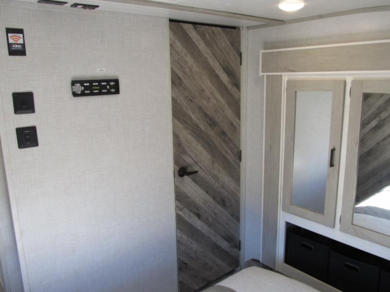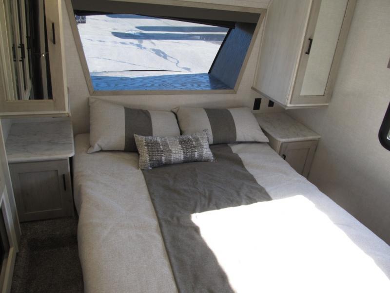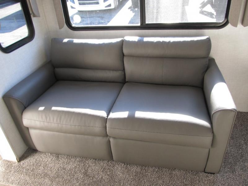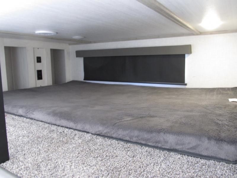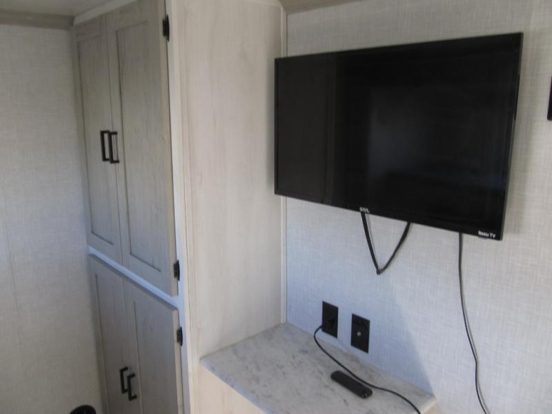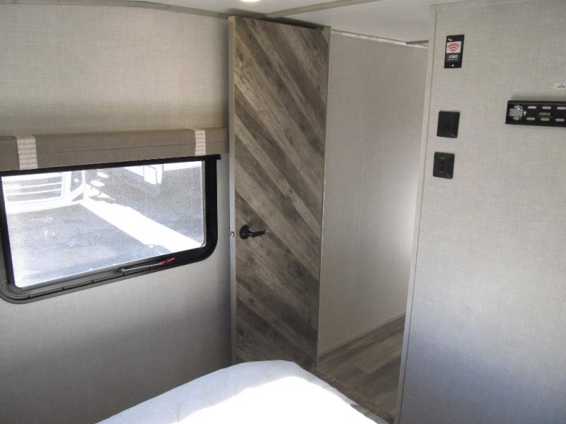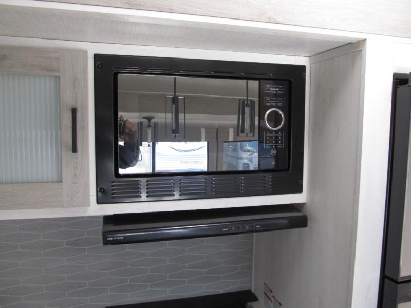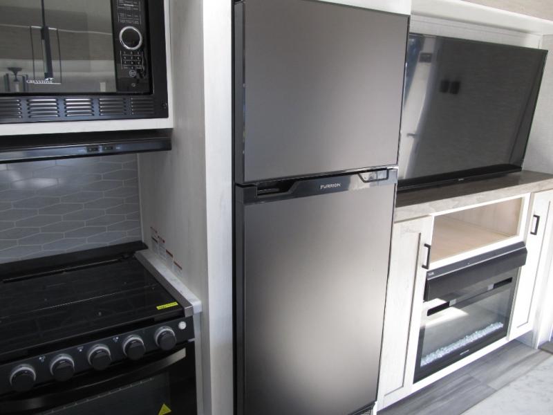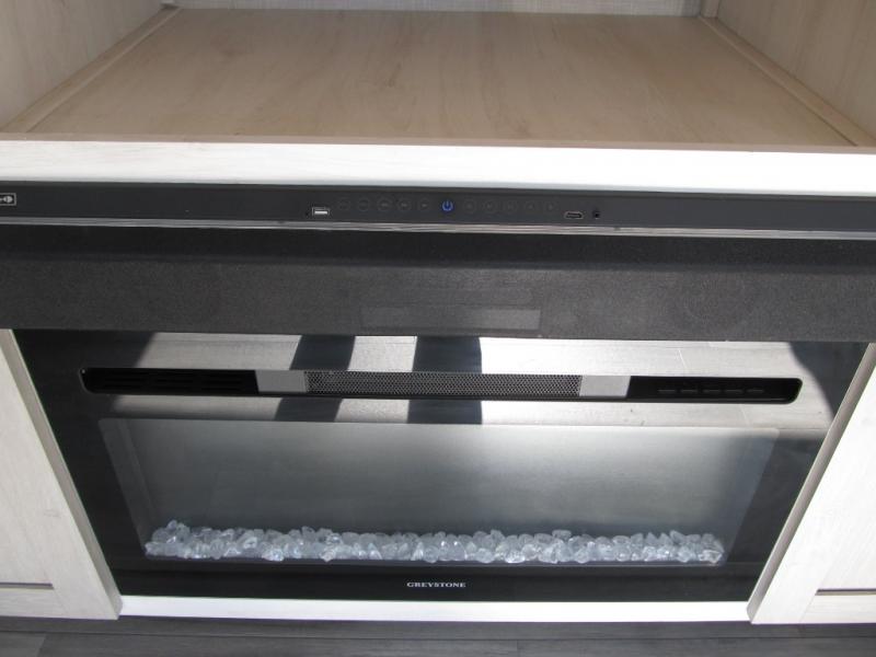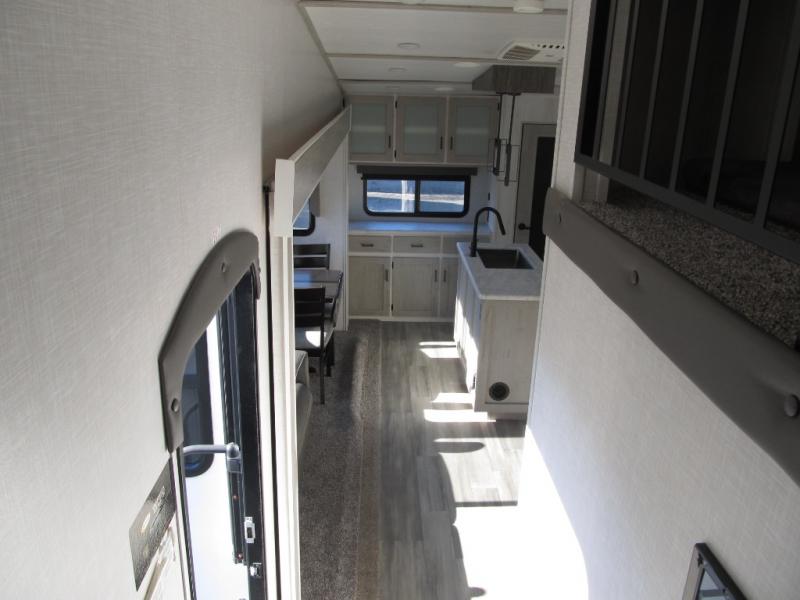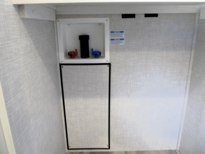 Wow! This fifth wheel will surely make an impression with its middle bunkhouse that can be utilized as an extra bedroom, second living room or even an office thanks to the desk and sofa that becomes a Versa queen bed at night. You will also find a flip-down upper bunk, a slide out for more floor space, and a wardrobe for clothing. The full bathroom is between this room and the front bedroom that offers lots of storage including a slide out wardrobe, a space prepped for a washer/dryer option, nightstands to place your cellphone and such, plus a queen bed. The rear kitchen includes plenty of storage for your dishes, pans, drinkware, and dry goods. The cook will love the kitchen island, the full amenities as well as the choice to use the outside kitchen to help feed everyone. And the free standing dinette with chairs plus the tri-fold hide-a-bed sofa offer seating inside.