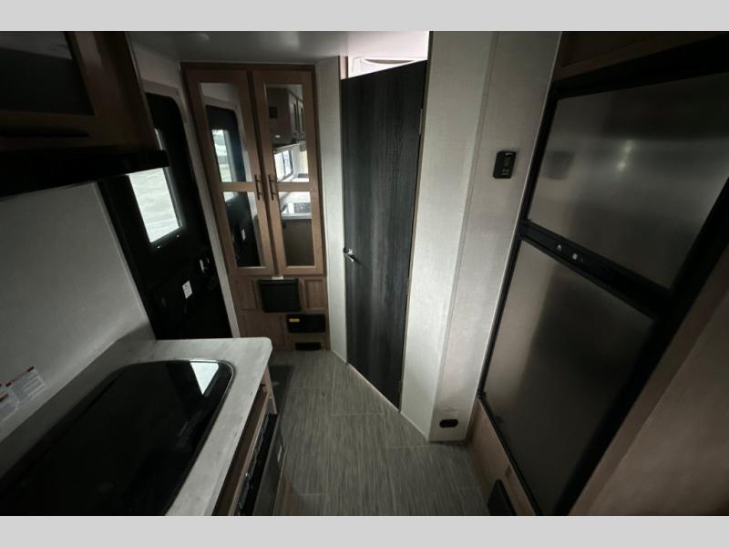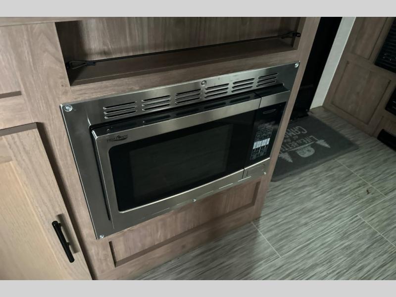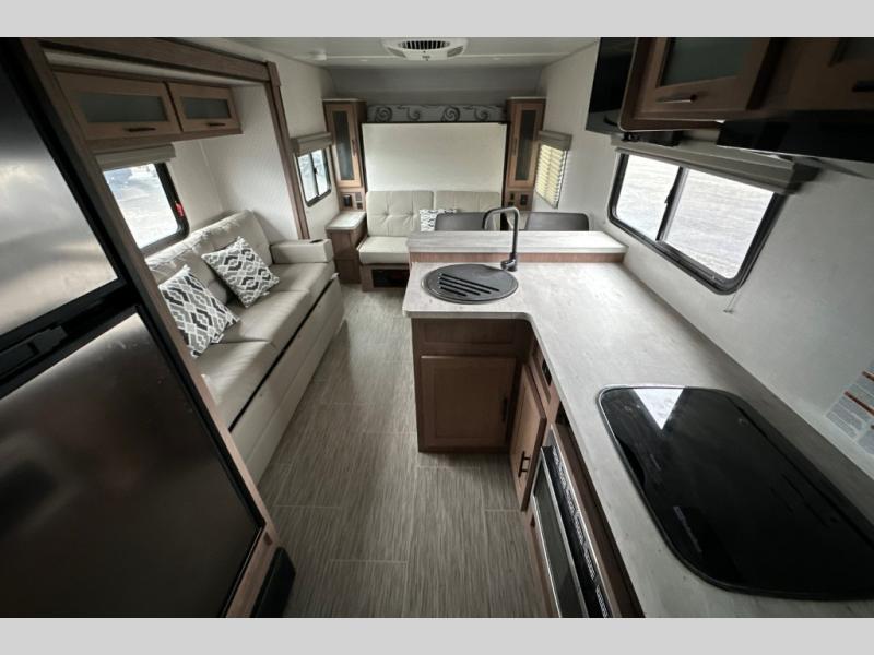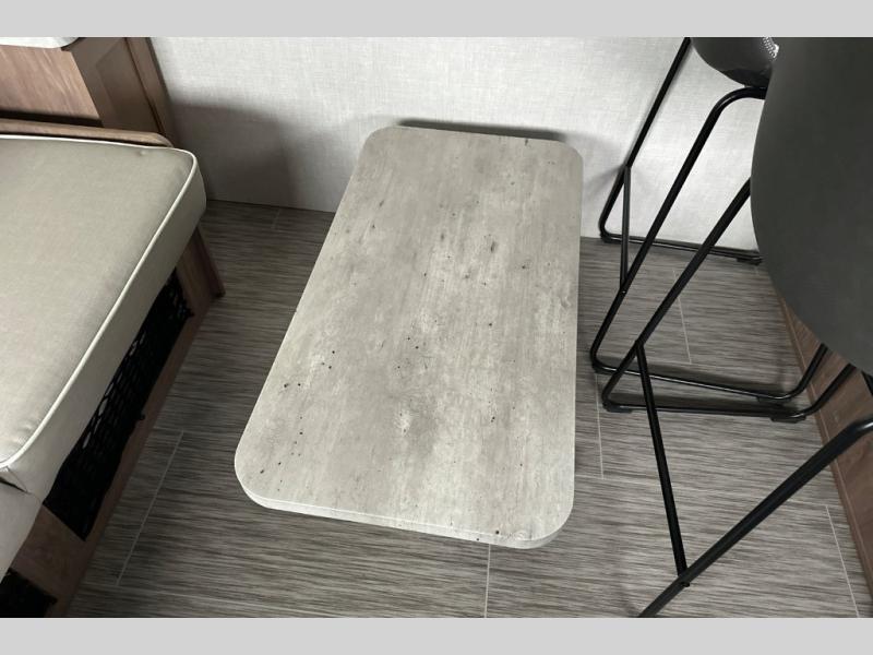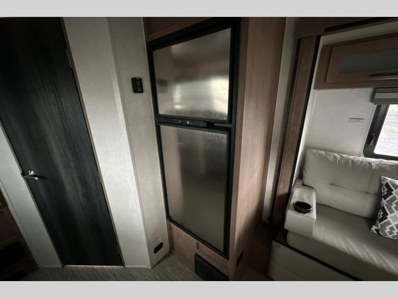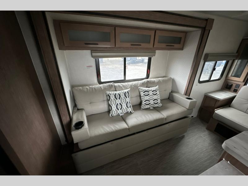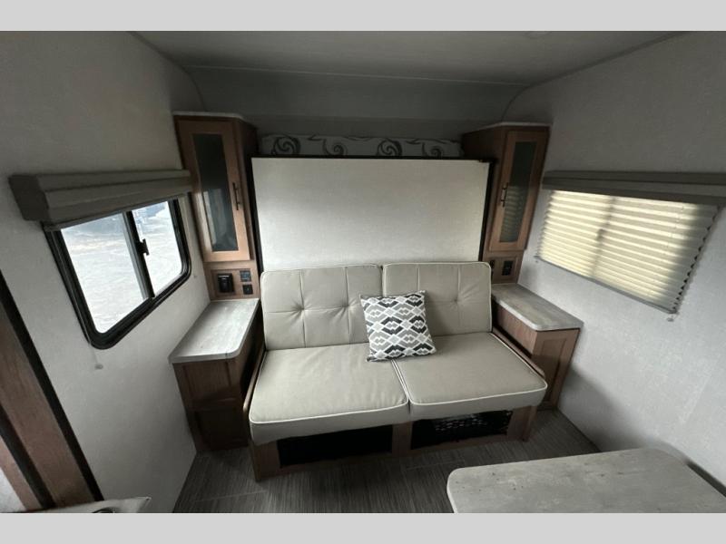 Make your camping dreams come true with this No Boundaries travel trailer! As you enter this unit, you'll notice an entryway closet that you can use to store your coats and scarves, and the full bathroom is also right in front of the entry door for easy access when you need it. The kitchen has great amenities, like a two-burner glass recessed cooktop, a refrigerator, and a sink, and there is a breakfast bar with two stools where you can sit down with a fresh plate of eggs each morning. When you fold away the Murphy bed in the morning, you'll have two sofas to rest on throughout the day, and you can use the JBL FLIP portable Bluetooth speaker to listen to some music while you enjoy the day.