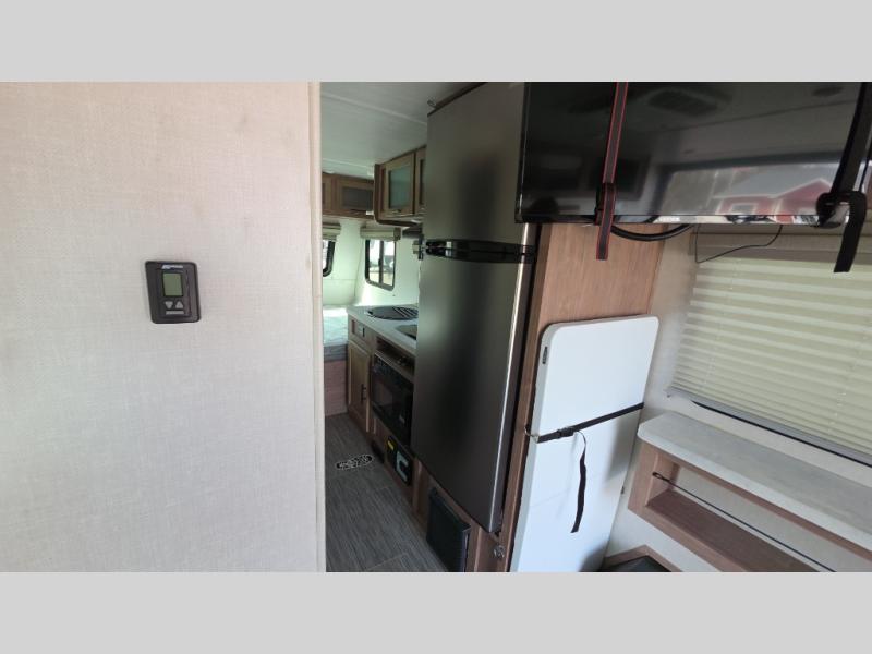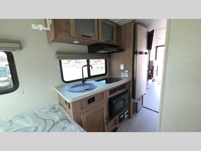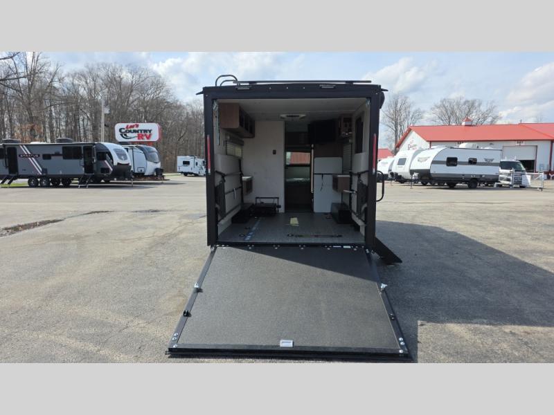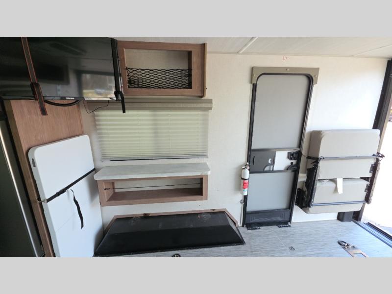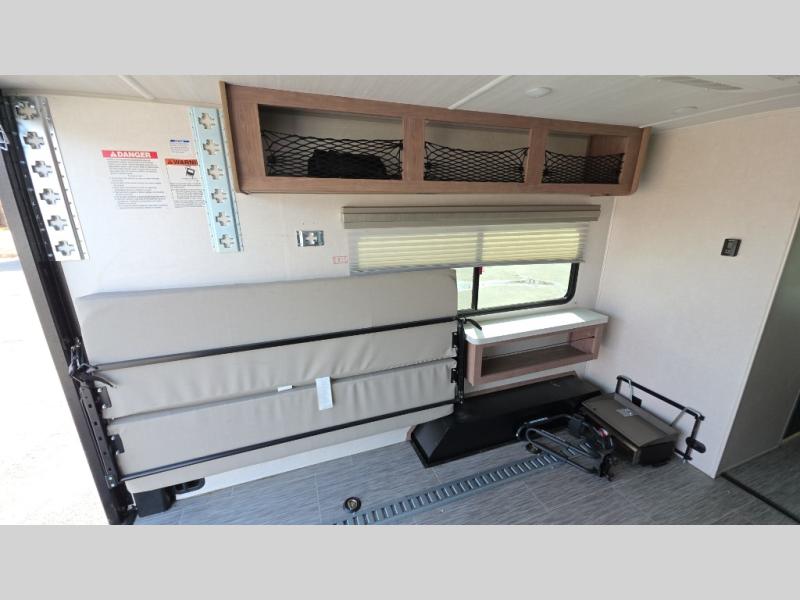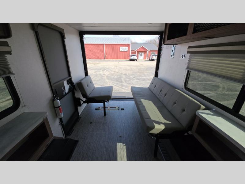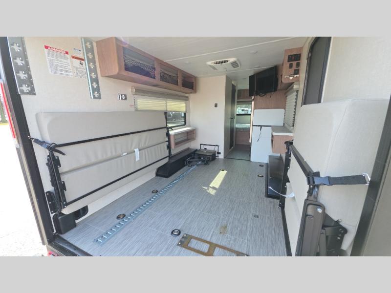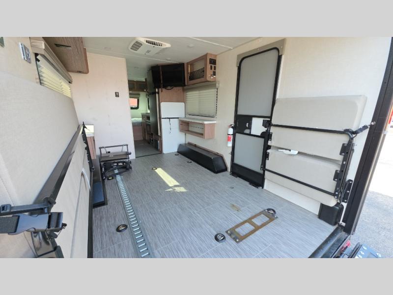 You'll be all set for your next adventure with this No Boundaries toy hauler! Not only do you have plenty of space to store your four-wheelers and dirt bikes in the 10' 7" garage, but you also have space to sleep on a queen-size bed, space to clean up with the full bathroom, space to create meals with the kitchen amenities, and space to relax with the flip-up sofa. If you want more space to spread out while you relax, just head outside to your camp chairs and pull out the 16' awning. There is also storage space on this trailer with the pantry, refrigerator, overhead cabinets, and exterior pass-through storage.