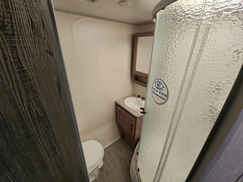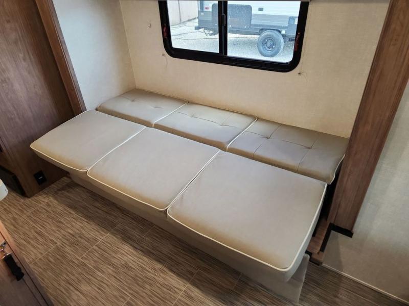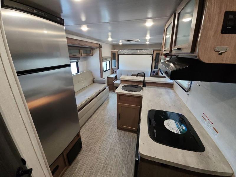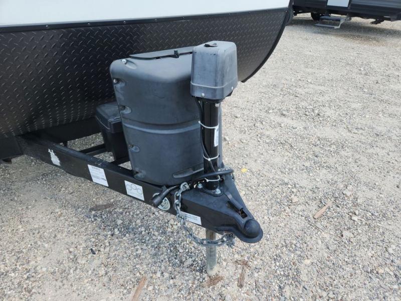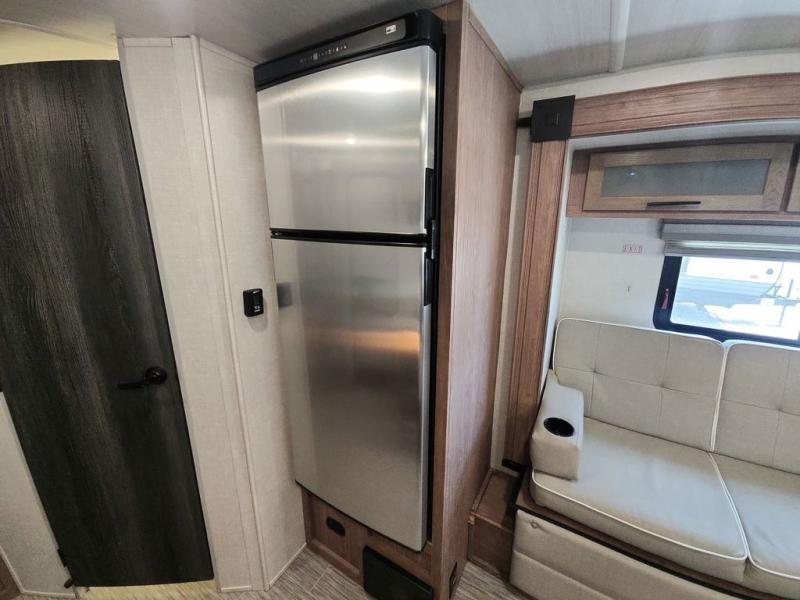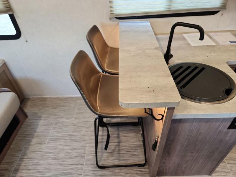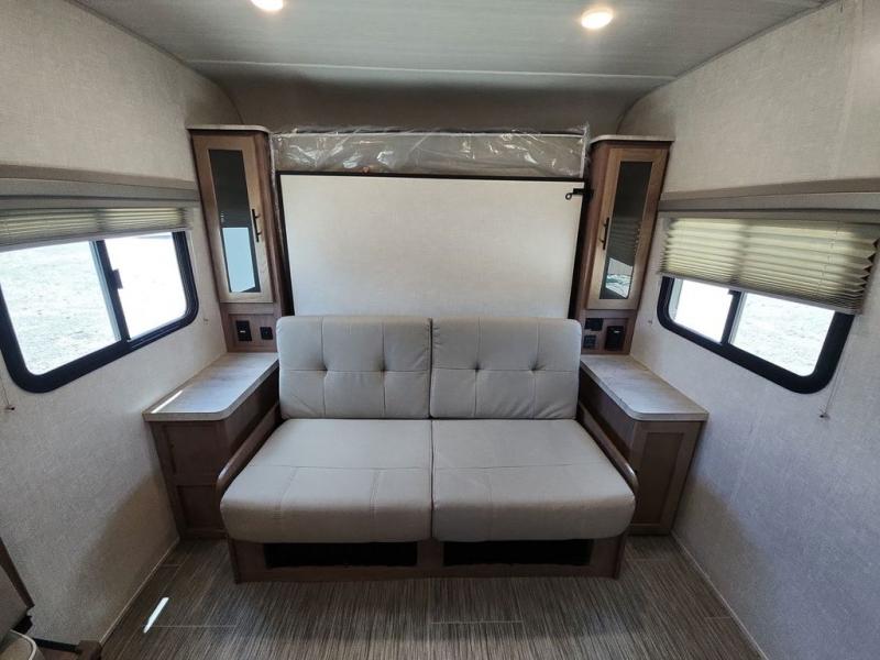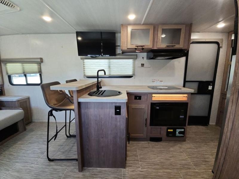 Make your camping dreams come true with this No Boundaries travel trailer! As you enter this unit, you'll notice an entryway closet that you can use to store your coats and scarves, and the full bathroom is also right in front of the entry door for easy access when you need it. The kitchen has great amenities, like a two-burner glass recessed cooktop, a refrigerator, and a sink, and there is a breakfast bar with two stools where you can sit down with a fresh plate of eggs each morning. When you fold away the Murphy bed in the morning, you'll have two sofas to rest on throughout the day, and you can use the JBL FLIP portable Bluetooth speaker to listen to some music while you enjoy the day.