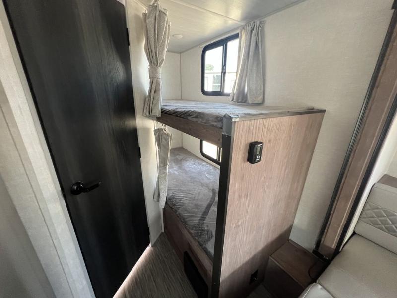 This No Boundaries travel trailer will make your life easier with its bunk beds, chaise lounge, and queen-size bed. Now you can bring along your favorite people without worrying where they will sleep at night. The single slide gives you more space for staying inside and spending time together, and there is an entertainment center that you can use while you're in there. This trailer also has great storage with the bathroom closet, kitchen refrigerator, overhead cabinets, and exterior pass-through storage. You'll also have a 14' power awning that will protect you while you're outside enjoying the weather.