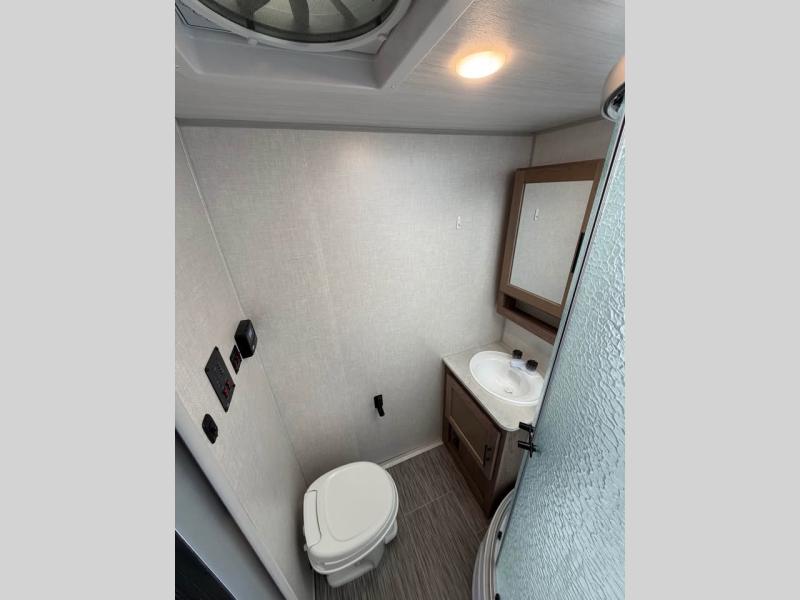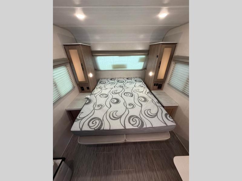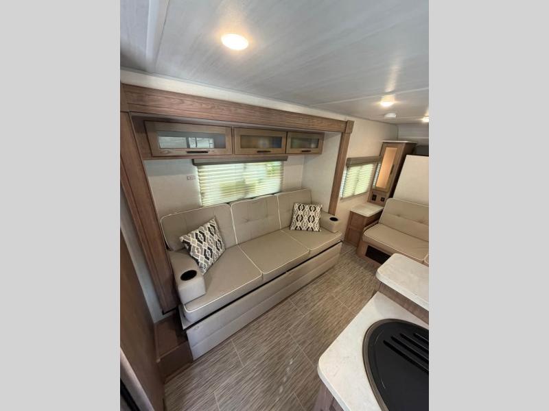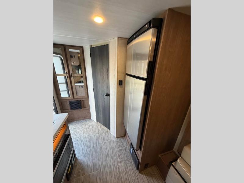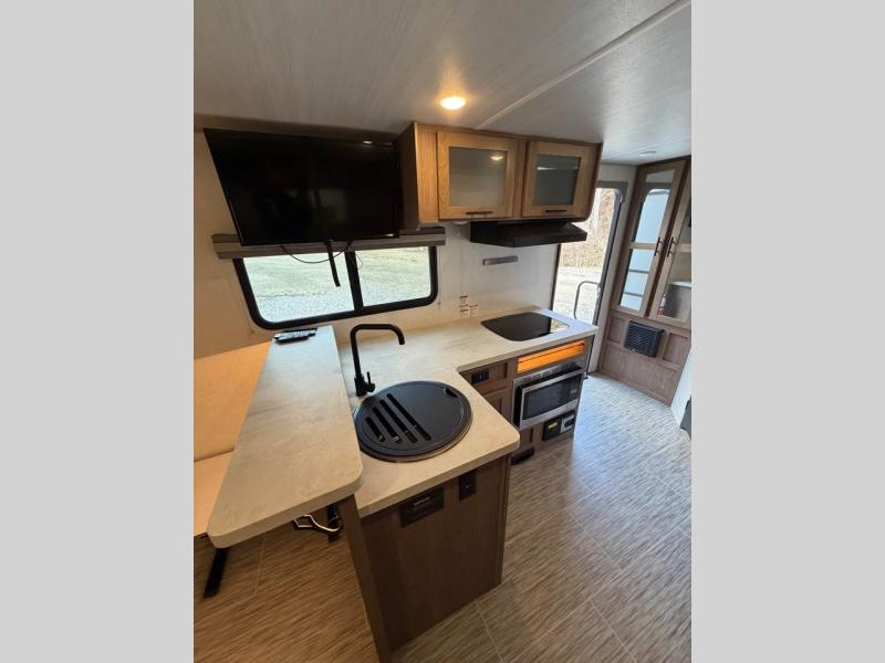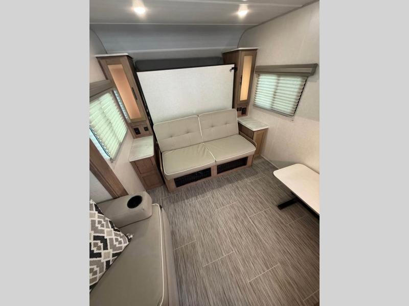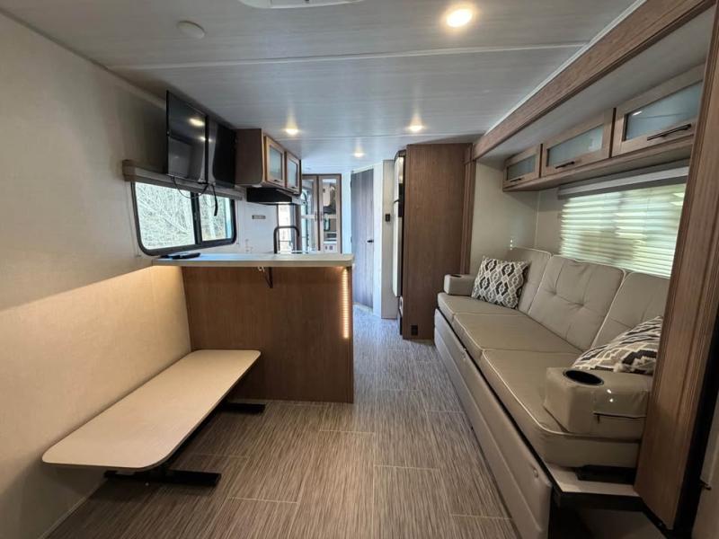 Make your camping dreams come true with this No Boundaries travel trailer! As you enter this unit, you'll notice an entryway closet that you can use to store your coats and scarves, and the full bathroom is also right in front of the entry door for easy access when you need it. The kitchen has great amenities, like a two-burner glass recessed cooktop, a refrigerator, and a sink, and there is a breakfast bar with two stools where you can sit down with a fresh plate of eggs each morning. When you fold away the Murphy bed in the morning, you'll have two sofas to rest on throughout the day, and you can use the JBL FLIP portable Bluetooth speaker to listen to some music while you enjoy the day.
