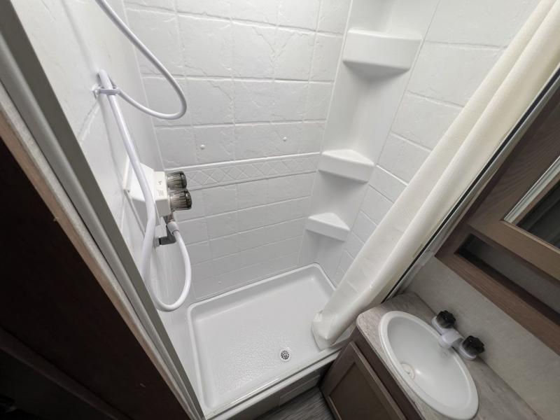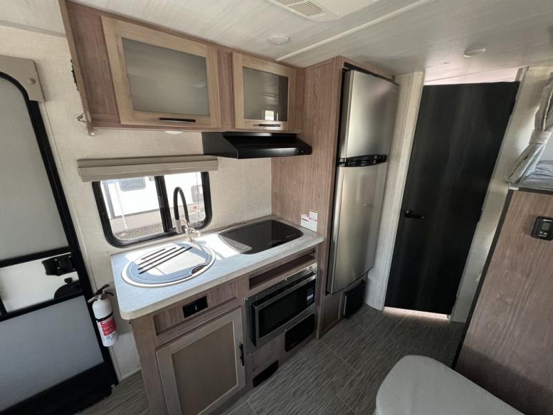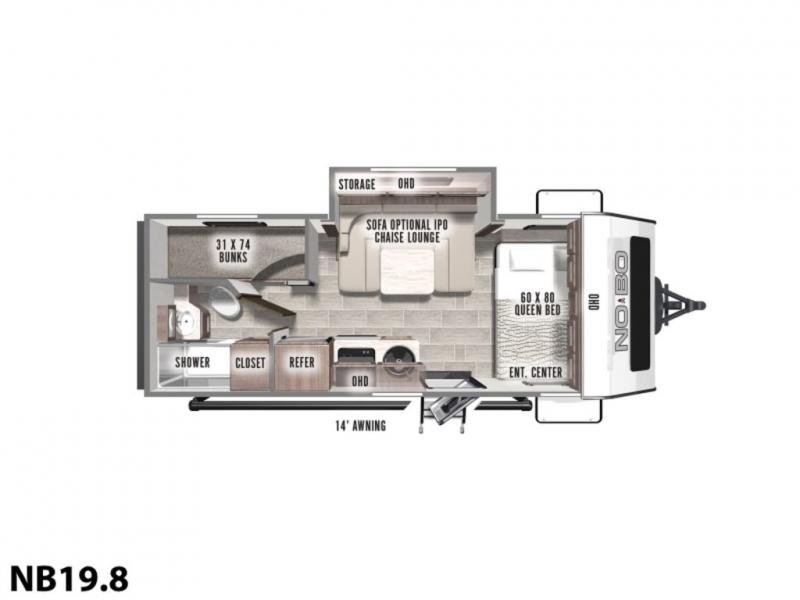 This No Boundaries travel trailer will make your life easier with its bunk beds, chaise lounge, and queen-size bed. Now you can bring along your favorite people without worrying where they will sleep at night. The single slide gives you more space for staying inside and spending time together, and there is an entertainment center that you can use while you're in there. This trailer also has great storage with the bathroom closet, kitchen refrigerator, overhead cabinets, and exterior pass-through storage. You'll also have a 14' power awning that will protect you while you're outside enjoying the weather.