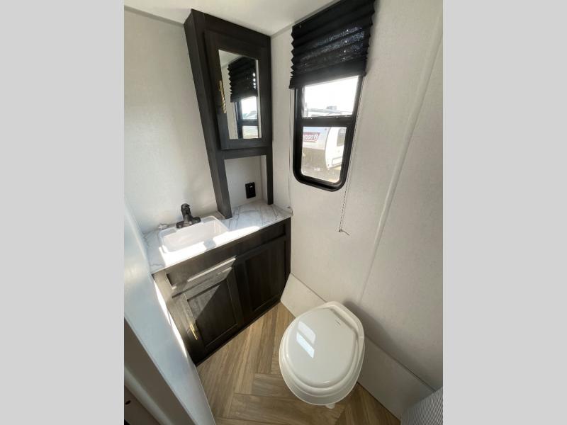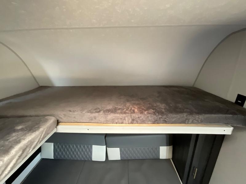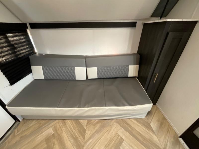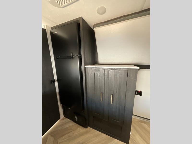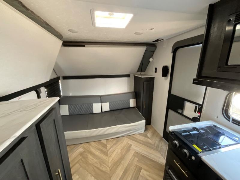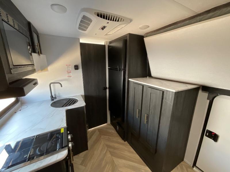 This single axle travel trailer is perfect for four campers since it includes a front queen bed with a flip-down bunk above, plus a second flip-down bunk across from the galley. There is a bike sized cargo door outside and a 24" tall removable cargo net inside so your gear stays secure. Meals can be prepared in the microwave or on the two burner cooktop, and there is an 11 cu. ft. double door 12V refrigerator for your perishables. After dinner you can head outdoors to relax under the 10' power awning with adjustable legs, and grab a cold drink from the outdoor refrigerator.