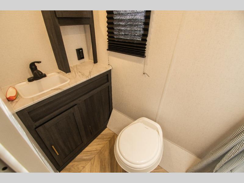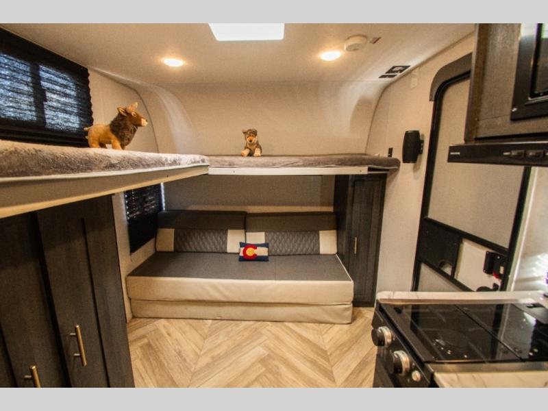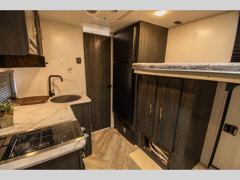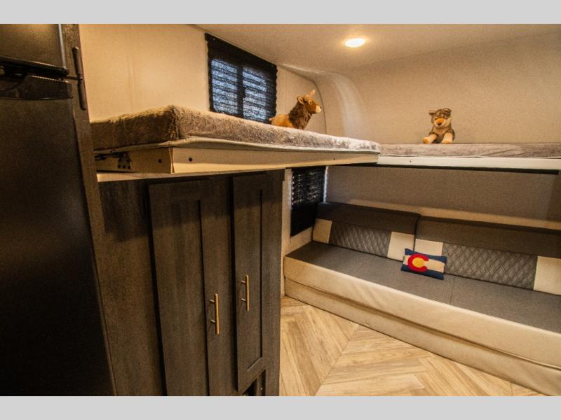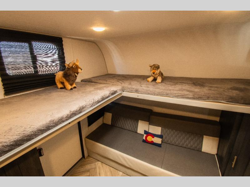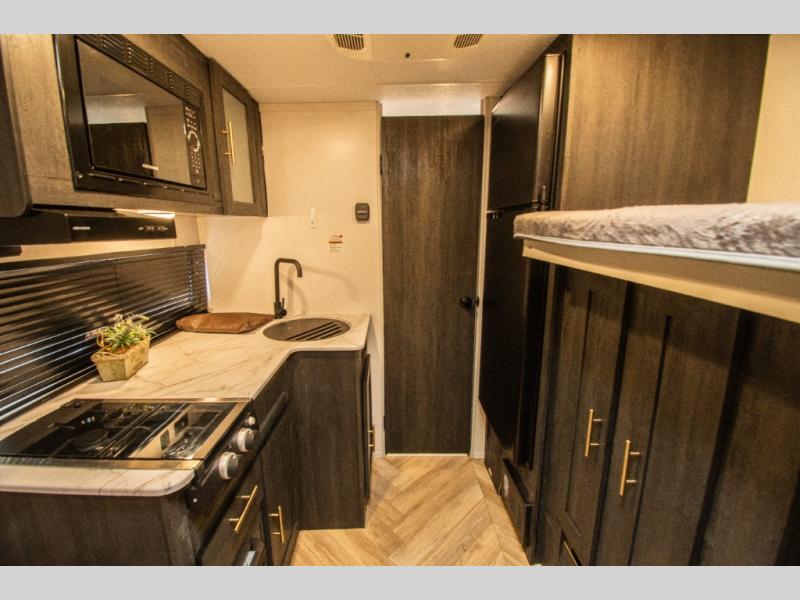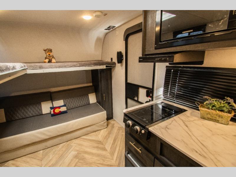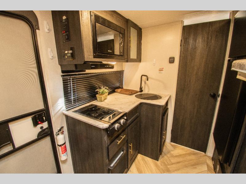 This single axle travel trailer is perfect for four campers since it includes a front queen bed with a flip-down bunk above, plus a second flip-down bunk across from the galley. There is a bike sized cargo door outside and a 24" tall removable cargo net inside so your gear stays secure. Meals can be prepared in the microwave or on the two burner cooktop, and there is an 11 cu. ft. double door 12V refrigerator for your perishables. After dinner you can head outdoors to relax under the 10' power awning with adjustable legs, and grab a cold drink from the outdoor refrigerator.
