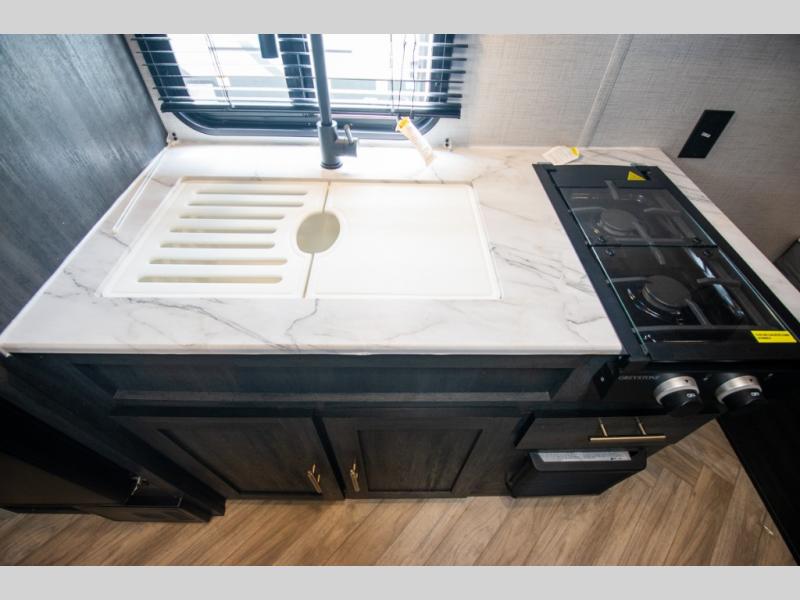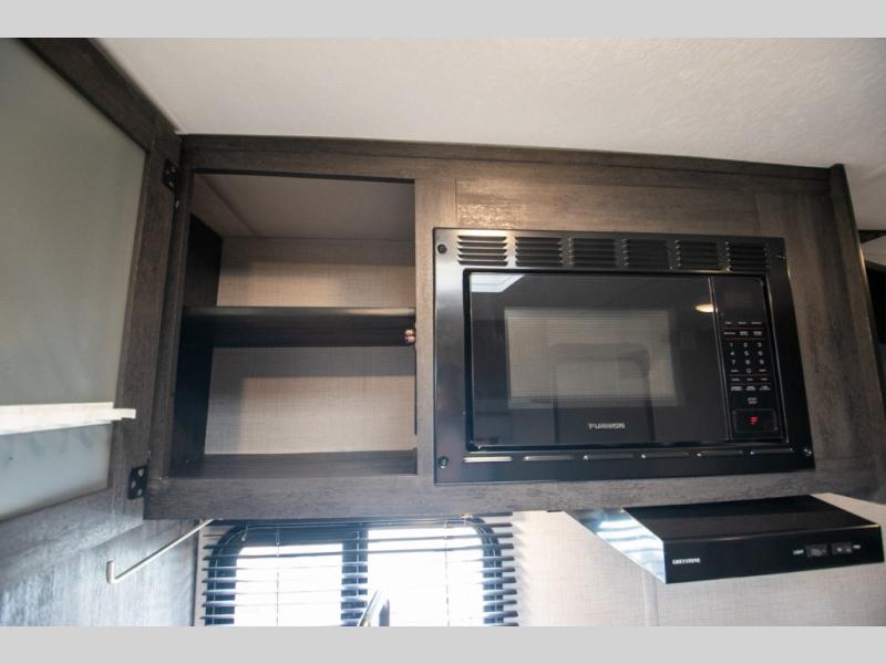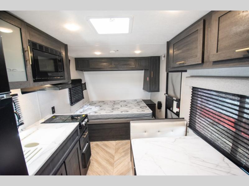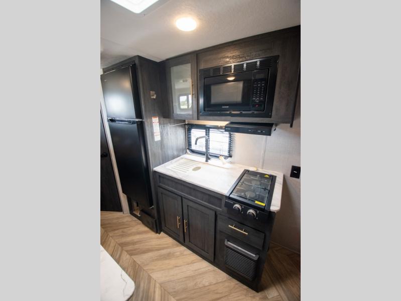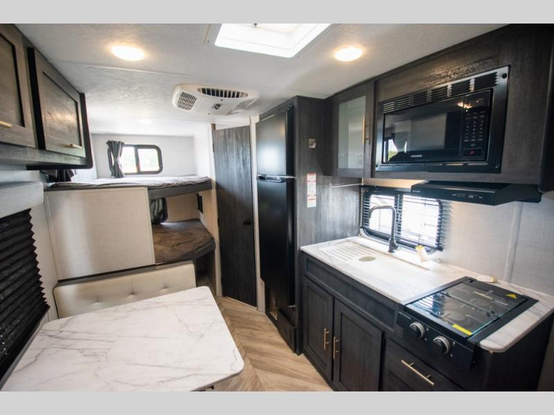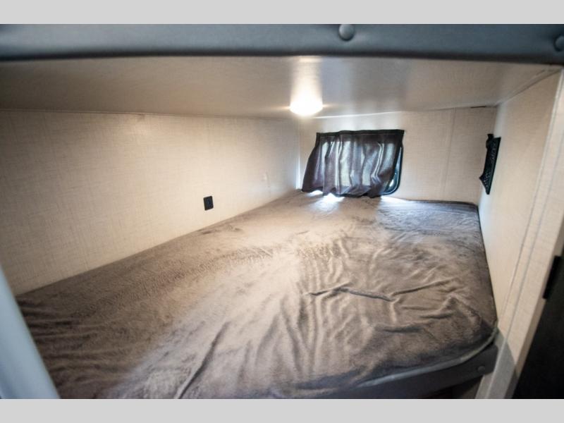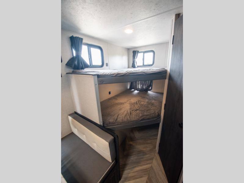 If you crave adventure, this Ozark travel trailer is ready to help you get your next fix! From the RV queen bed at the front to the double-size bunks in the back, you'll have comfortable sleeping accommodations for you and your fellow adventure junkies. You can also find space for one more tired camper on the bench dinette. The full bathroom comes equipped with a shower, foot-flush toilet, and sink to help you clean up after you spent all day playing in the dirt. The kitchen will also be a big help after you've exerted all of your energy because it will provide you with a hearty meal when you use the two-burner cooktop to create something delicious. The 11-cubic foot refrigerator is useful for keeping drinks cold, and the microwave will let you heat up something fast.