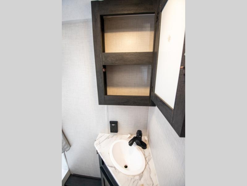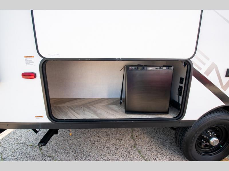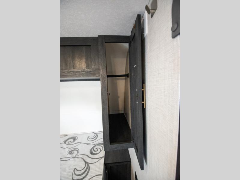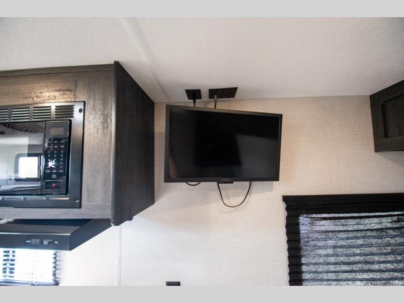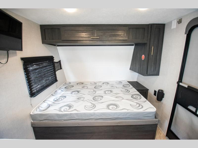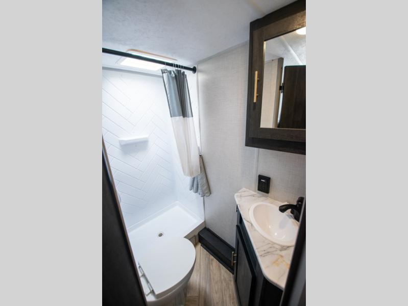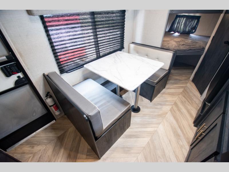 If you crave adventure, this Ozark travel trailer is ready to help you get your next fix! From the RV queen bed at the front to the double-size bunks in the back, you'll have comfortable sleeping accommodations for you and your fellow adventure junkies. You can also find space for one more tired camper on the bench dinette. The full bathroom comes equipped with a shower, foot-flush toilet, and sink to help you clean up after you spent all day playing in the dirt. The kitchen will also be a big help after you've exerted all of your energy because it will provide you with a hearty meal when you use the two-burner cooktop to create something delicious. The 11-cubic foot refrigerator is useful for keeping drinks cold, and the microwave will let you heat up something fast.