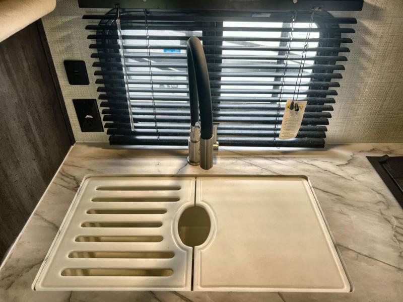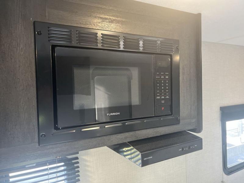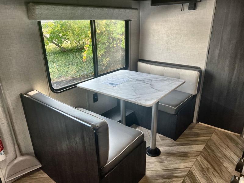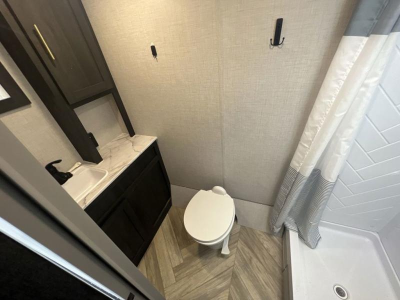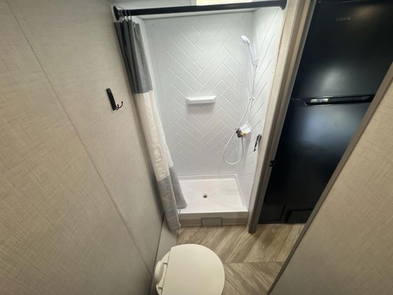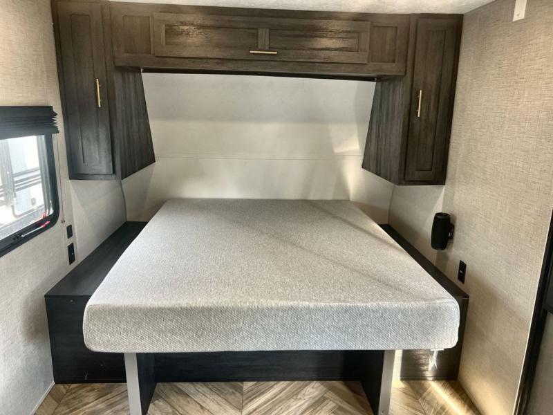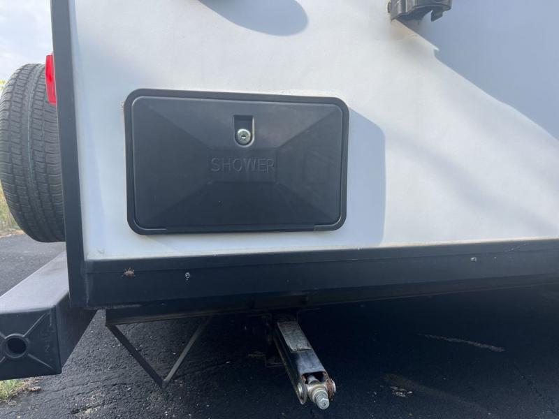 Just think about all of the new adventures you could have with this Ozark travel trailer! You have an exterior hot/cold shower to help you rinse the mud off of your boots, and there is also an exterior LP quick connect so that you can add a griddle for outdoor cooking. Once you make your way inside, you'll find an RV queen bed to your right. This bed has access to storage. Because the full bathroom is located in the back, you have a little extra privacy as you get ready, and the 11-cubic foot refrigerator is always ready for you to come grab an ice-cold beverage.