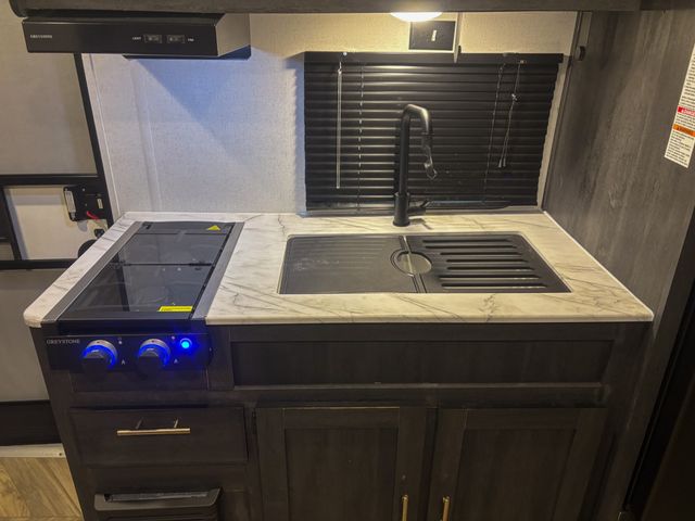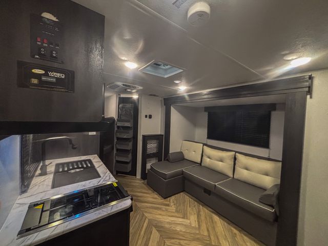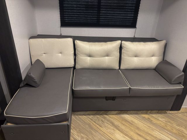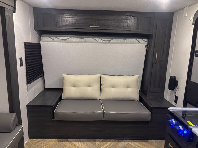 You can create the perfect oasis with this Ozark travel trailer! The exterior is outfitted with many useful features, like a 15' power awning to protect you, an outside shower with hot/cold water to rinse you off, an exterior LP griddle and refrigerator to allow you to prepare meals in the fresh air, a spare tire to use if you find yourself in need of a replacement, and an oversized door for storage access to the interior. On the interior, there is extra room thanks to the single slide. This slide is what holds the convertible chaise lounge with storage, and there is also a removable table in front of the chaise lounge for a place to eat when dinner is ready. The Murphy bed is especially useful when you are trying to be frugal with your space because it can fold away to reveal a sofa during the day.