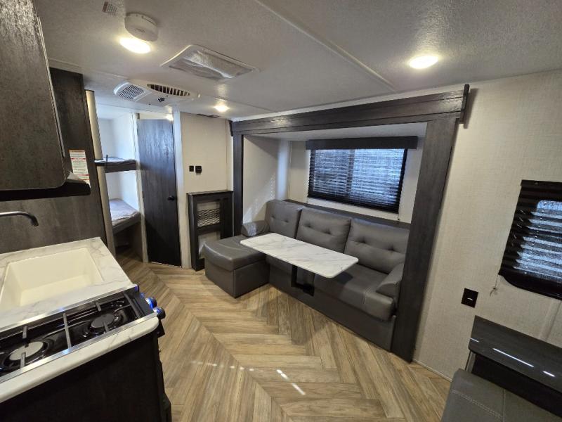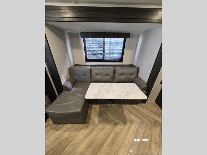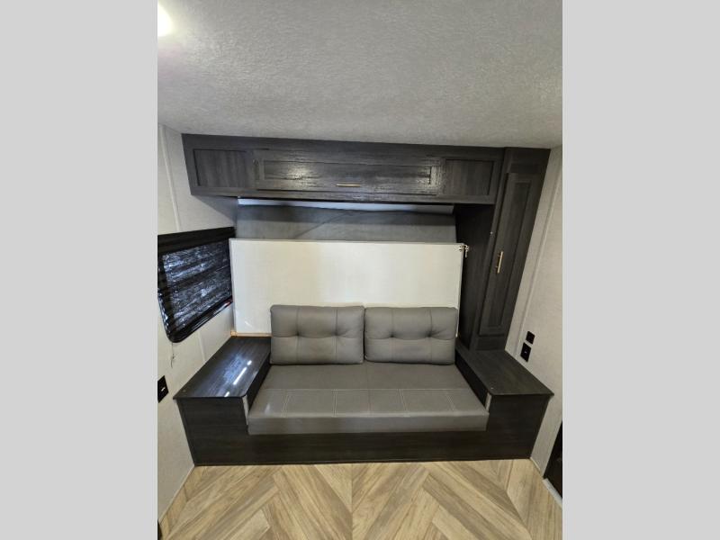 You can create the perfect oasis with this Ozark travel trailer! The exterior is outfitted with many useful features, like a 15' power awning to protect you, an outside shower with hot/cold water to rinse you off, an exterior LP griddle and refrigerator to allow you to prepare meals in the fresh air, a spare tire to use if you find yourself in need of a replacement, and an oversized door for storage access to the interior. On the interior, there is extra room thanks to the single slide. This slide is what holds the convertible chaise lounge with storage, and there is also a removable table in front of the chaise lounge for a place to eat when dinner is ready. The Murphy bed is especially useful when you are trying to be frugal with your space because it can fold away to reveal a sofa during the day.