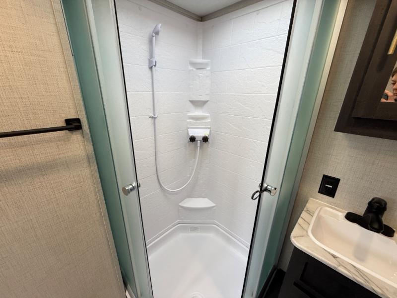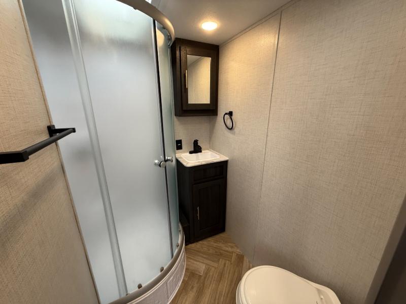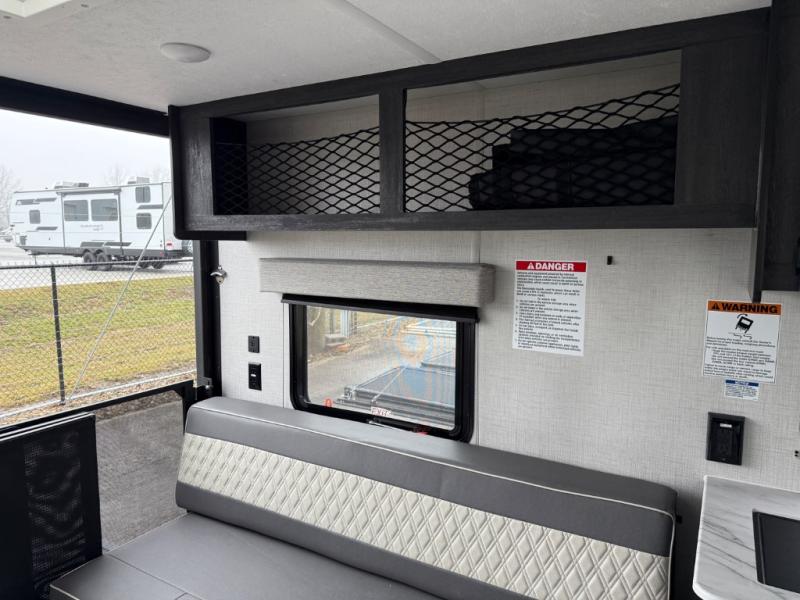 Take your favorite off-road toys with you in this Ozark toy hauler! It features 13' of garage space with 1,500 lb. tie-downs to ensure they stay in place while traveling. Once you have arrived, unload your toys with the 3,000 lb. ramp door and set up the opposing sofa seating/30" x 72" sleeper with table in between to enjoy your meals at. Plus, the ramp doubles as a 1,500 lb. party patio and the sofa sleepers convert into a king bed. Freshen up in the full bathroom with the 36" radius shower after a fun day on the trails and relax in the front private bedroom on the 60" x 74" queen bed which has access to the storage area below and USB charger/110V outlets on either side of it. Keep the dirt outside where it belongs with the exterior hot/cold shower, but if some does get tracked inside you can easily clean it up thanks to the carpet free interior!