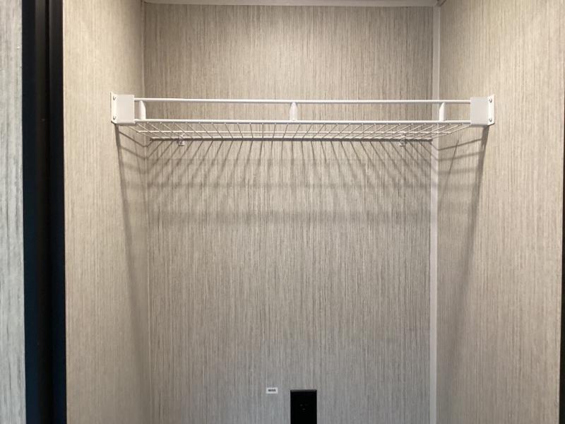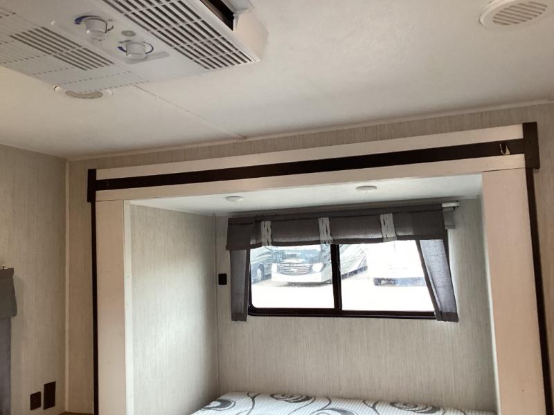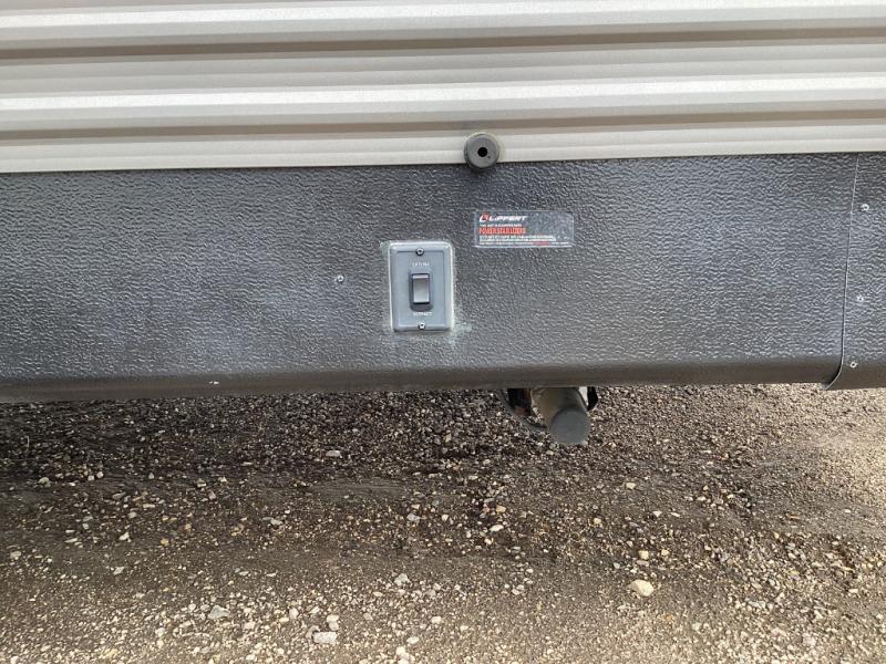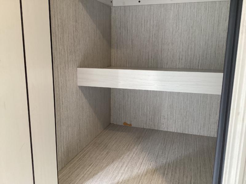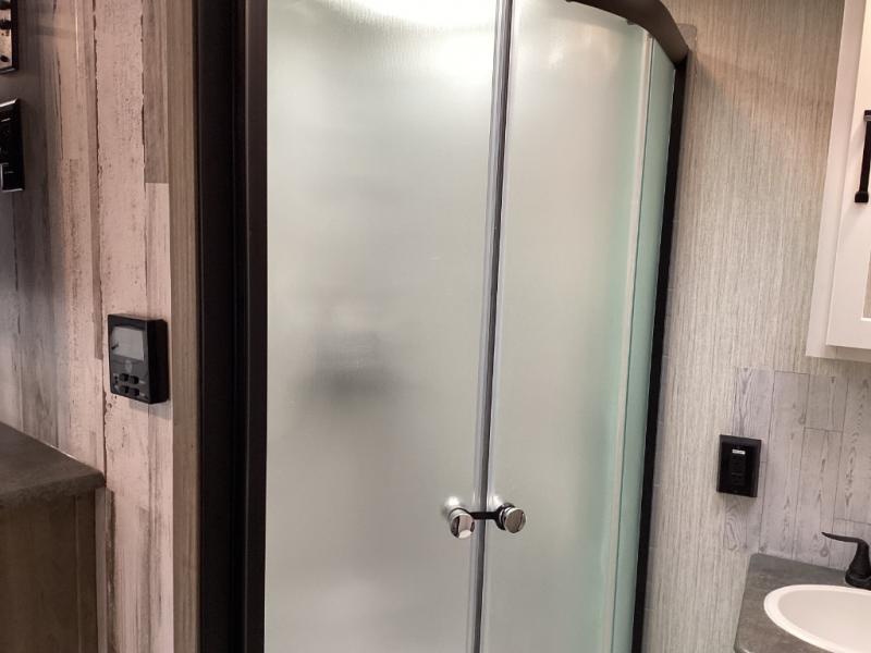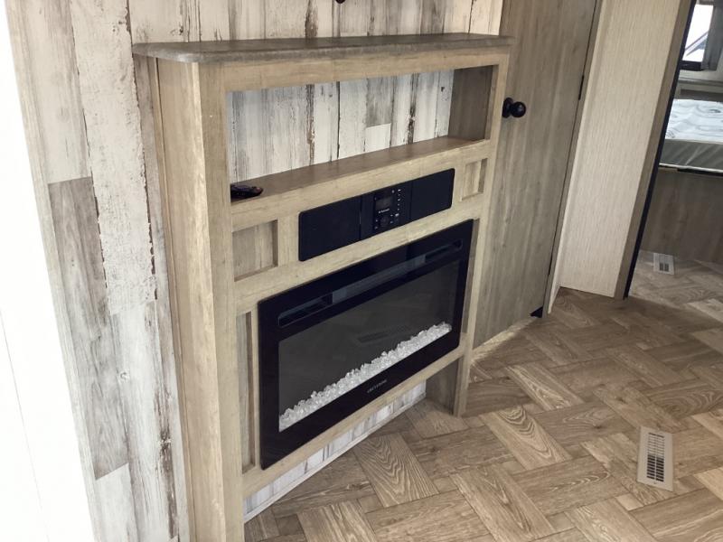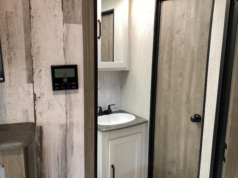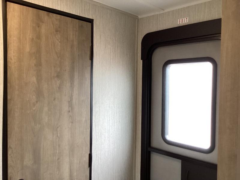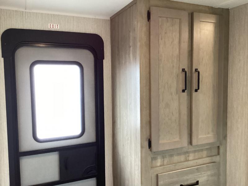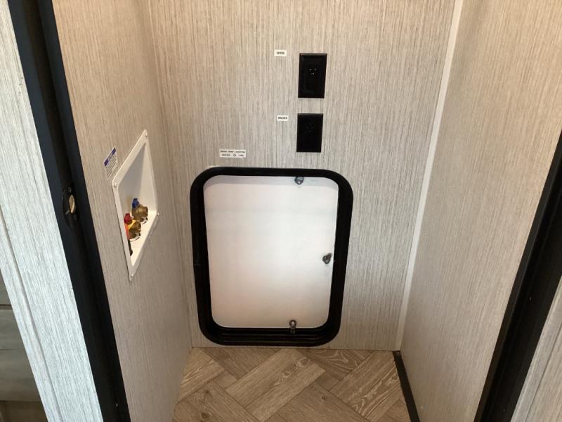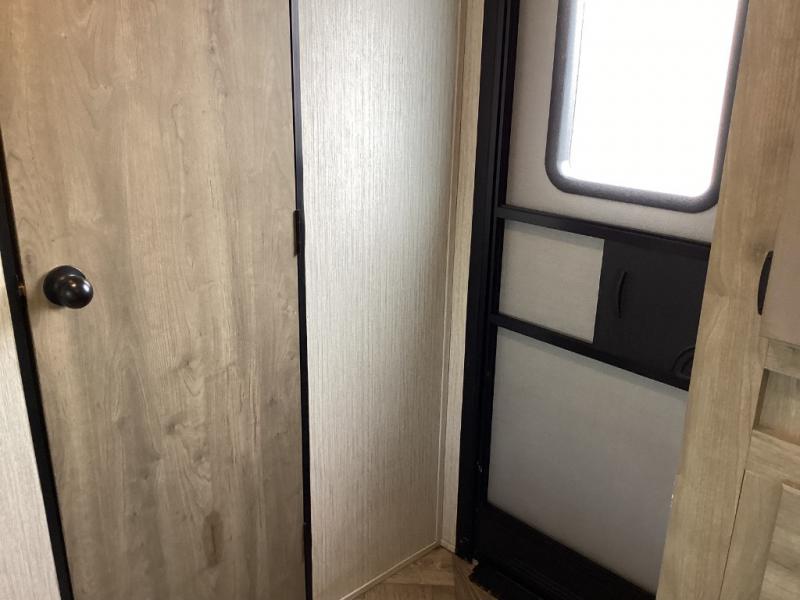 Walk into this travel trailer with one of the dual entry doors for a great camping trip! One entrance enters directly into the rear private bedroom which has a queen bed slide, a walk-in closet that is prepped for an optional washer and dryer, a wardrobe, and even an entrance into the dual entry bathroom. Grab a snack from the walk-in pantry then relax on the sofa while you watch a movie with the entertainment center or play a game at the booth dinette. The front kitchen has everything you will need to prepare your best home cooked meals including lots of countertop space, and you could even add an optional exterior micro kitchen with griddle for dinner outdoors!