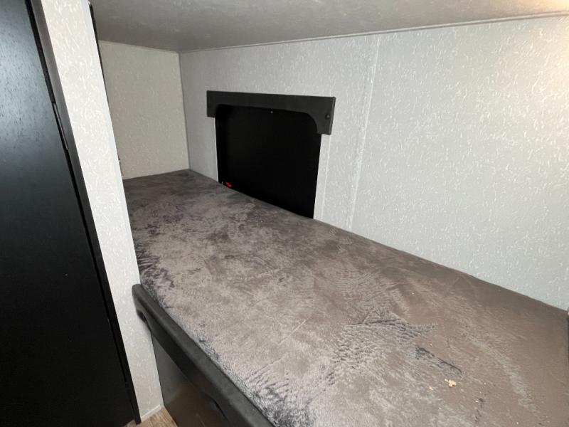 Imagine your kids on the rear bunk beds in this Patriot Edition travel trailer while you enjoy the front queen bed before everyone gets up to make breakfast and head out for a hike. The kitchen includes a high-output cooktop and microwave, as well as a refrigerator to store your leftovers and a sink to wash the dishes. You will find storage in the overhead cabinets, and there is a shelf by the queen bed. Your hiking gear can also be stowed out in the outside storage.
