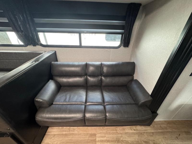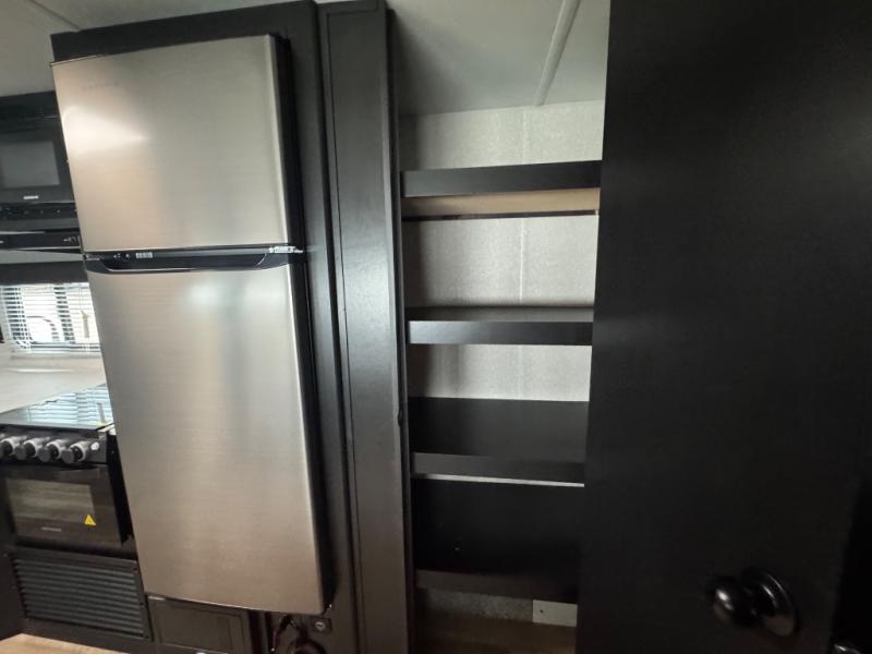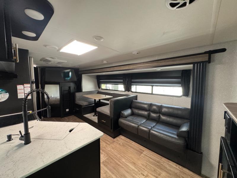Come on inside this Patriot Edition travel trailer and experience the convenience of a smooth flow of traffic in and out with two entry doors. The rear door leads into a full bath which is great for accessibility when outside and when you need to use the bathroom. Once inside, you will notice the large U-shaped dinette and the sofa which sit on the slide and create a spacious footprint for moving about, as well as great places to play games and socialize with your friends and family. A walk-in pantry provides plenty of storage allowing you to stock up on your favorite snacks and dry goods for your family adventure. At night, there is sleeping space for everyone between the double-size bunks and the queen-size bed, plus the furniture.