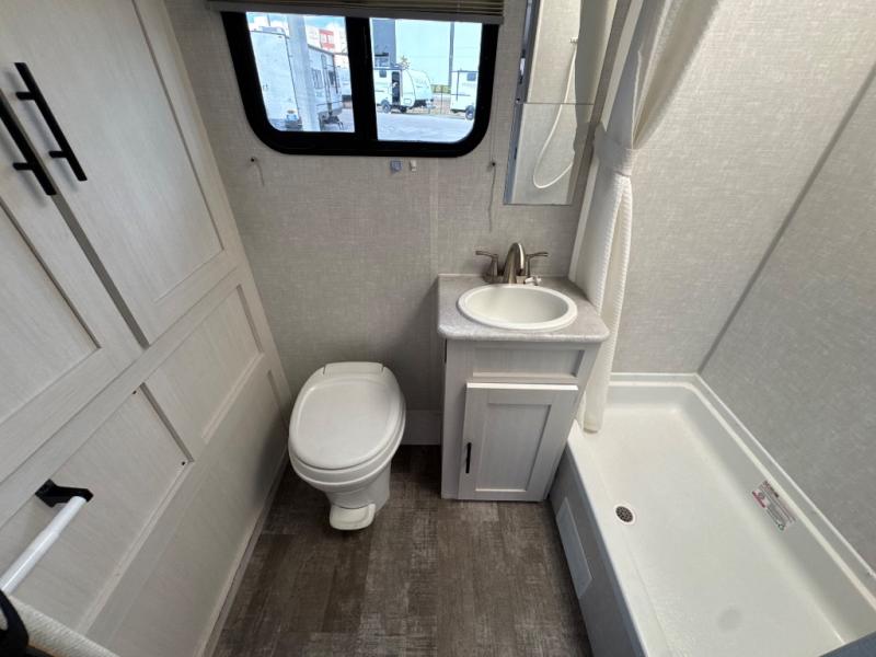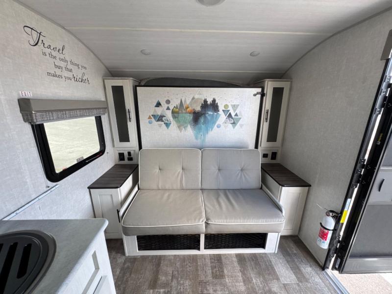 You're going to love all of the conveniences and versatility of this R-Pod travel trailer! The front Murphy bed can fold away to reveal a sofa which gives you a comfortable place to sit during the day and to sleep at night too. The rear full bath features everything you will need to get squeaky clean each morning, as well as a large wardrobe for you to store your linens. After you have whipped up your best meal with the two-burner cooktop or convection microwave, you can head to the 30" x 75" booth dinette and enjoy eating it there comfortably. There is plenty of storage space inside, but if you need more space, then you can use the exterior pass-through storage!