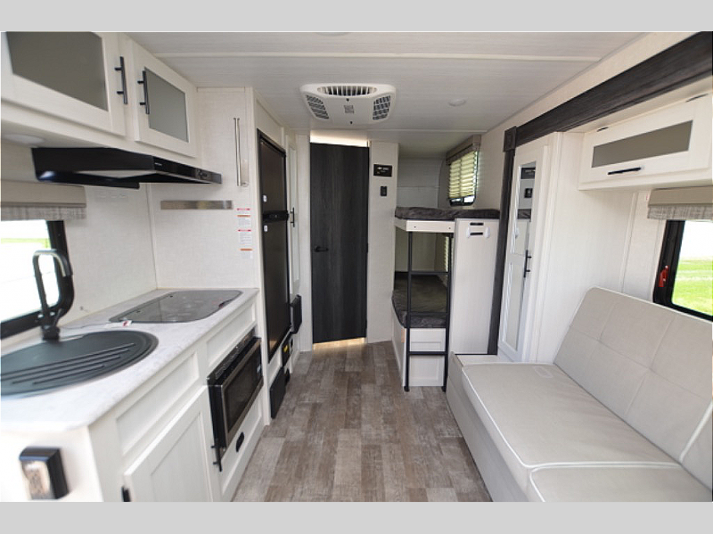 The whole family will enjoy this trailer with sleeping space for five between the bunk beds, the queen Murphy bed and the second sofa within the slide out. This sofa also includes a table for dining, and there is a closet to hang your clothes. During the day you will be able to relax inside while visiting with the cook in the kitchen with full amenities including a pantry for dry good storage. And the bathroom includes a toilet, linen storage, and a shower with a sink, so load up and head out to easily set up and enjoy your own accommodations in the great outdoors.