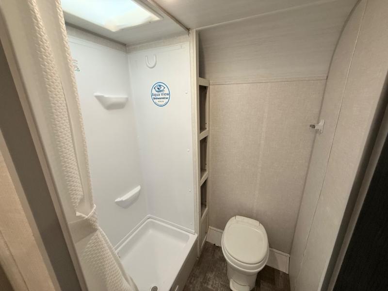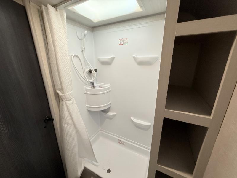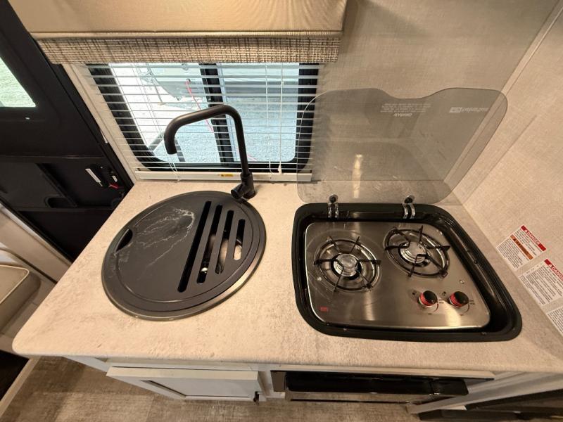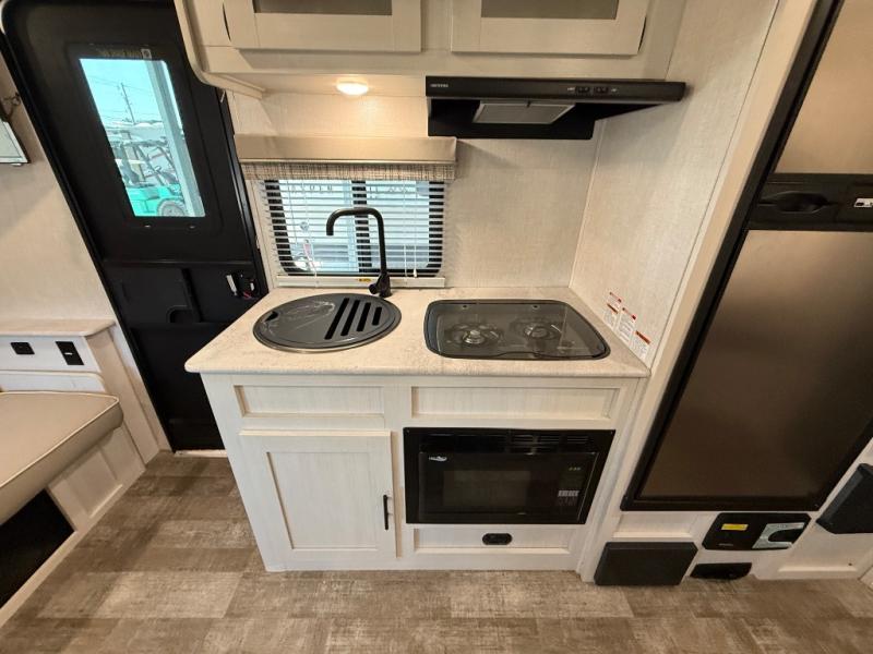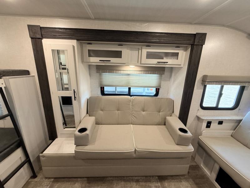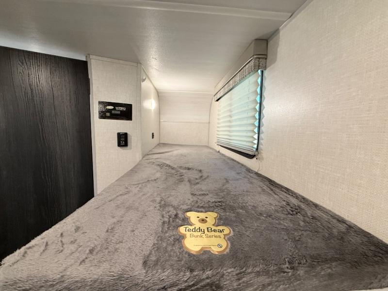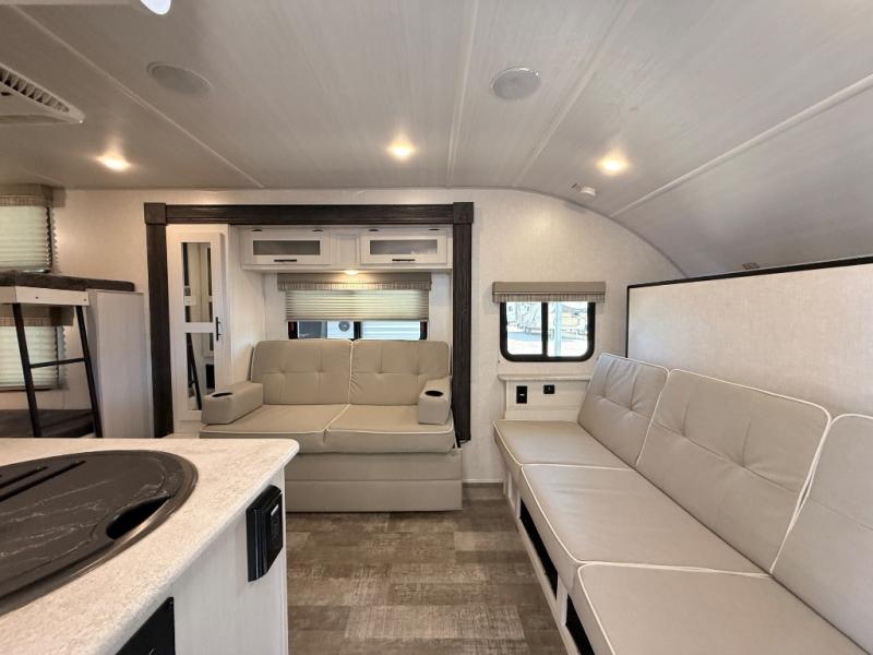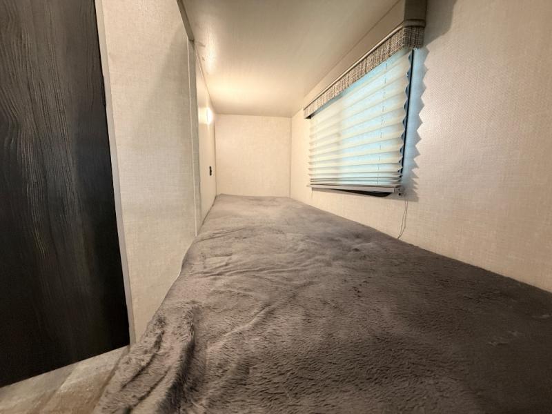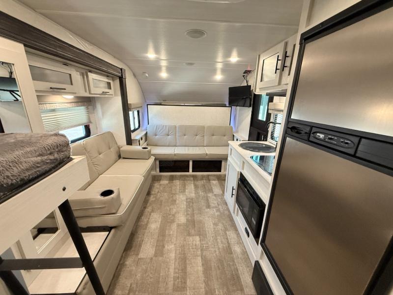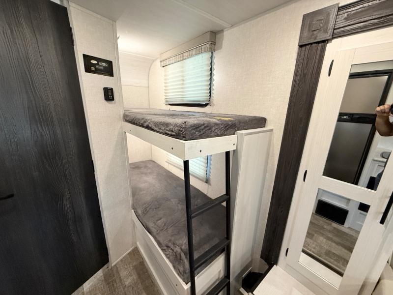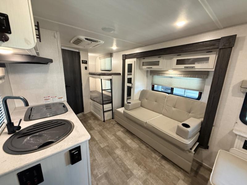 The whole family will enjoy this trailer with sleeping space for five between the bunk beds, the queen Murphy bed and the second sofa within the slide out. This sofa also includes a table for dining, and there is a closet to hang your clothes. During the day you will be able to relax inside while visiting with the cook in the kitchen with full amenities including a pantry for dry good storage. And the bathroom includes a toilet, linen storage, and a shower with a sink, so load up and head out to easily set up and enjoy your own accommodations in the great outdoors.
