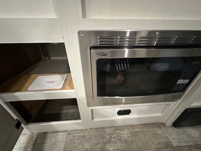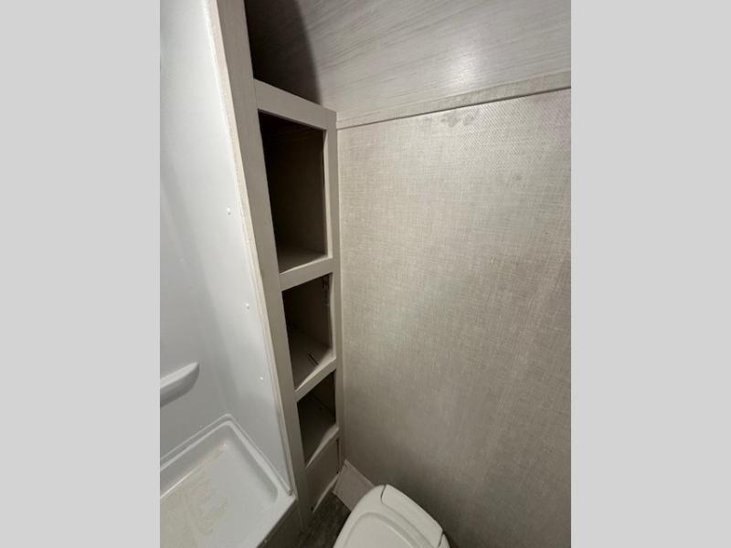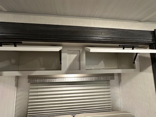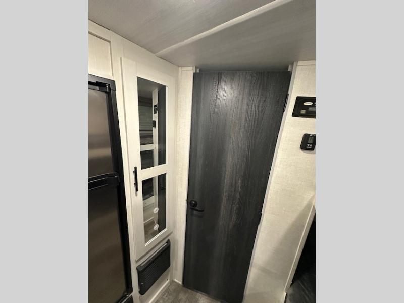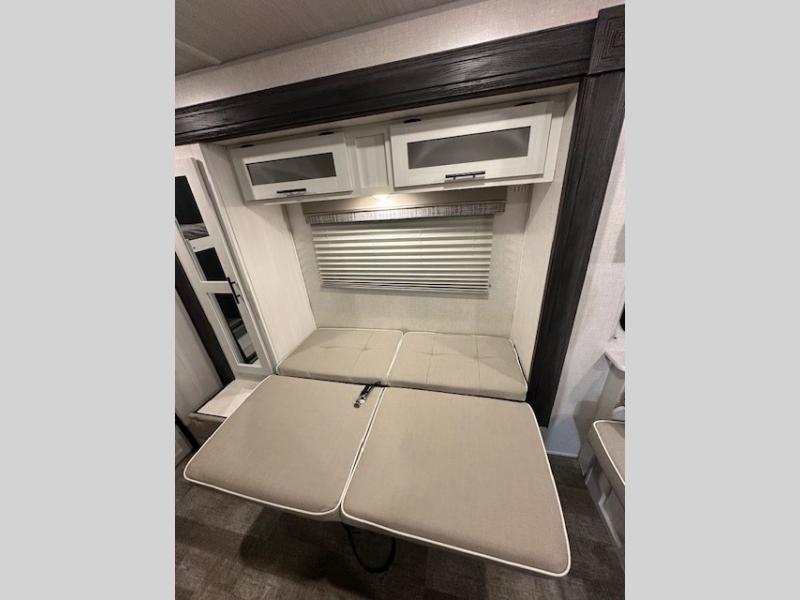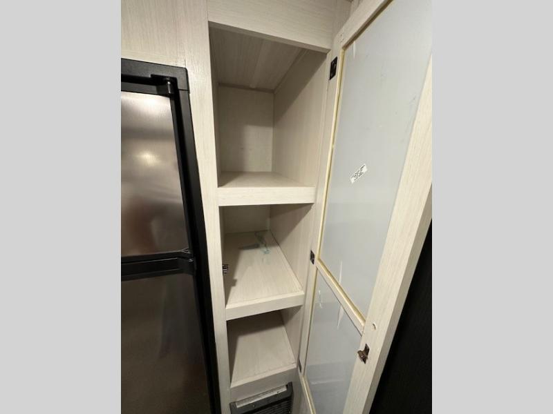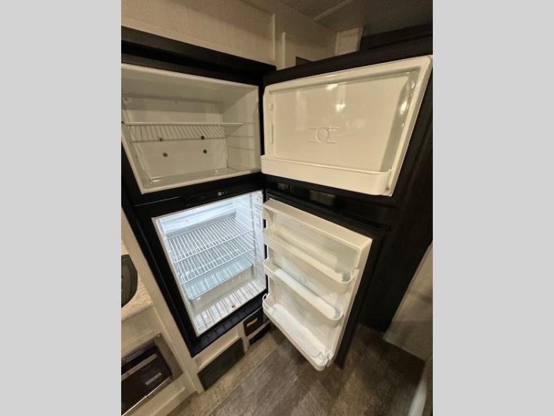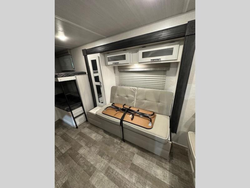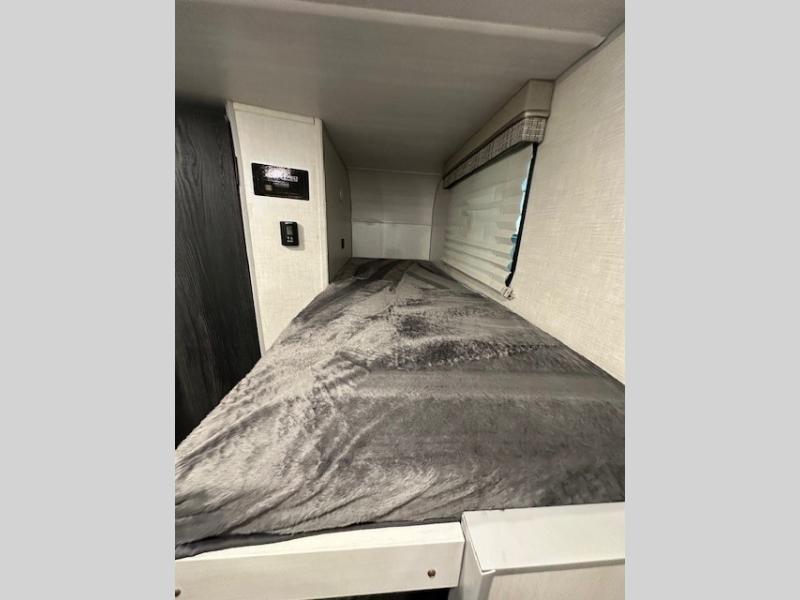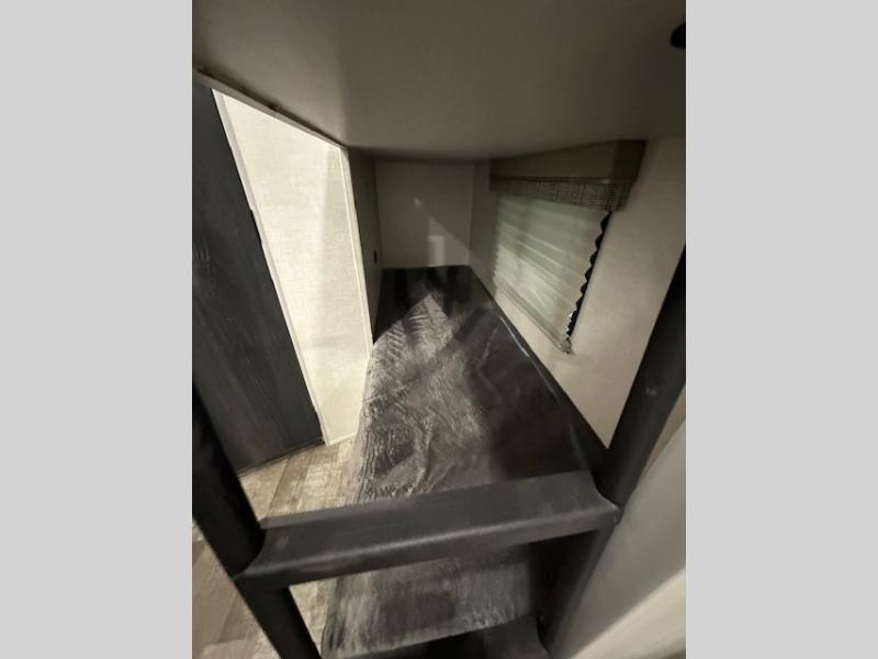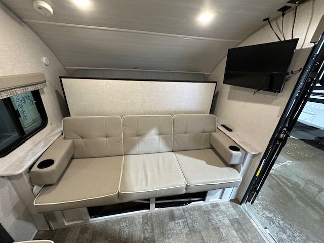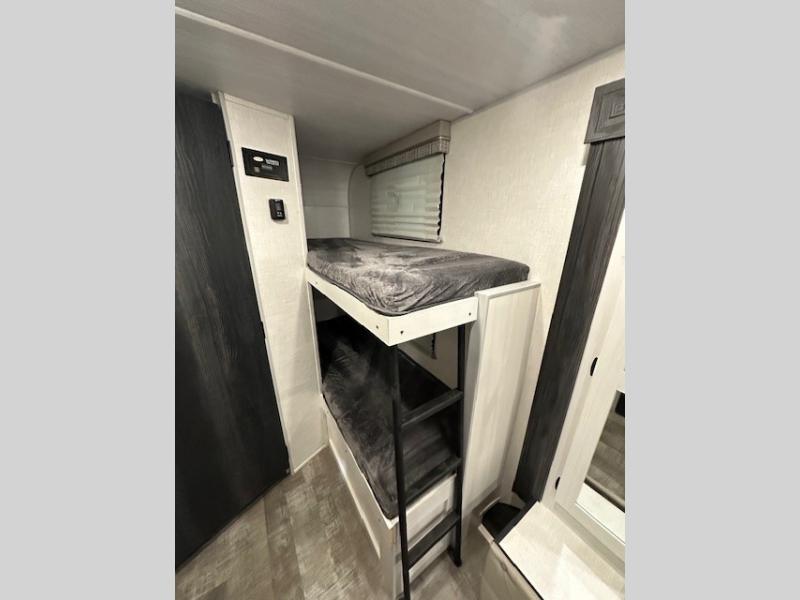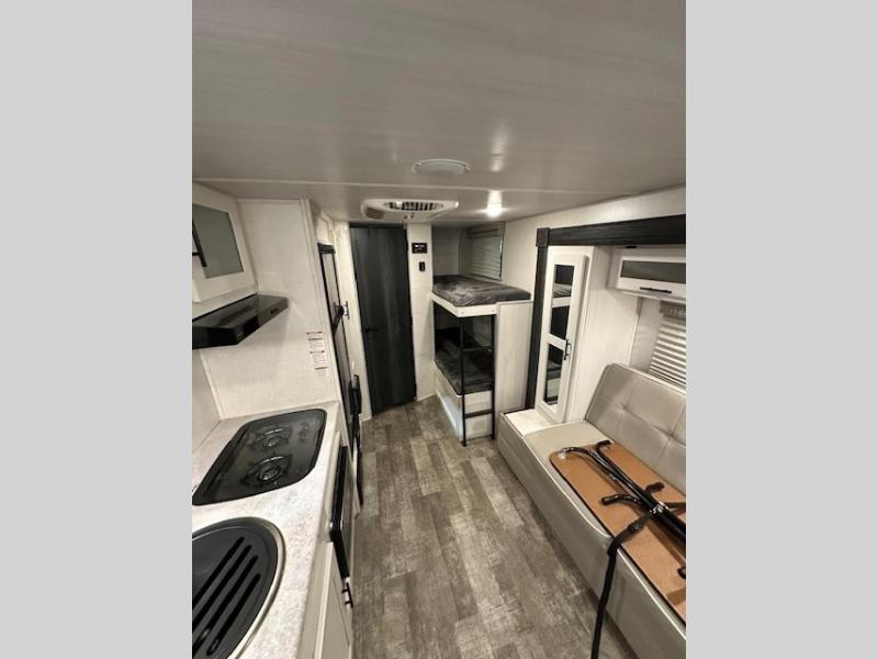 The whole family will enjoy this trailer with sleeping space for five between the bunk beds, the queen Murphy bed and the second sofa within the slide out. This sofa also includes a table for dining, and there is a closet to hang your clothes. During the day you will be able to relax inside while visiting with the cook in the kitchen with full amenities including a pantry for dry good storage. And the bathroom includes a toilet, linen storage, and a shower with a sink, so load up and head out to easily set up and enjoy your own accommodations in the great outdoors.