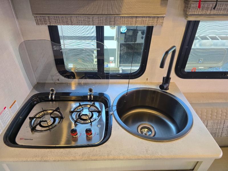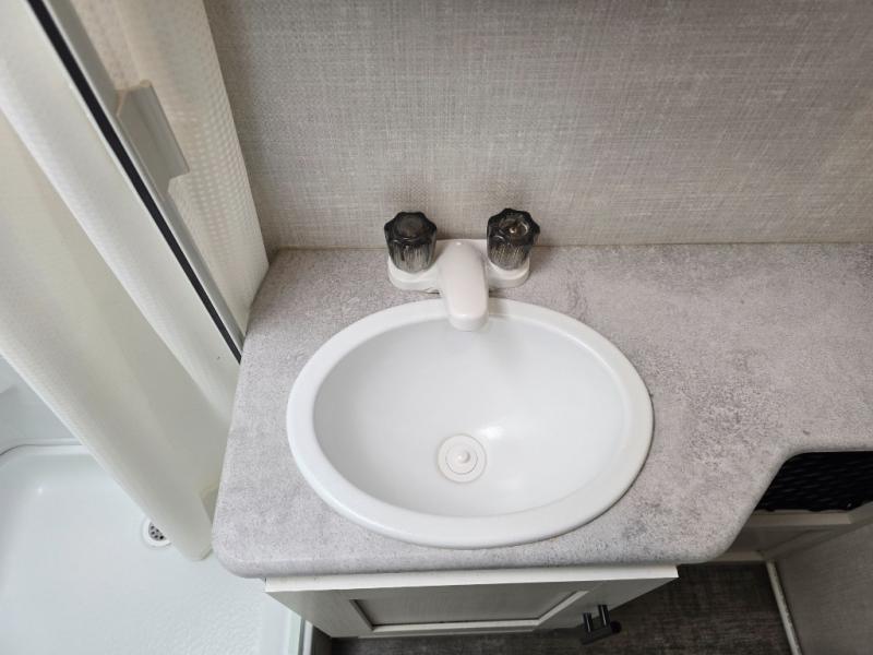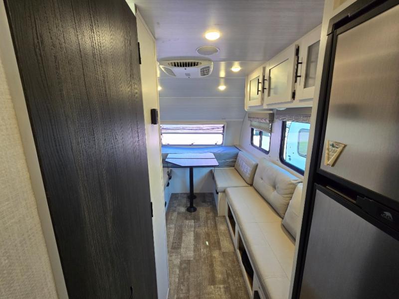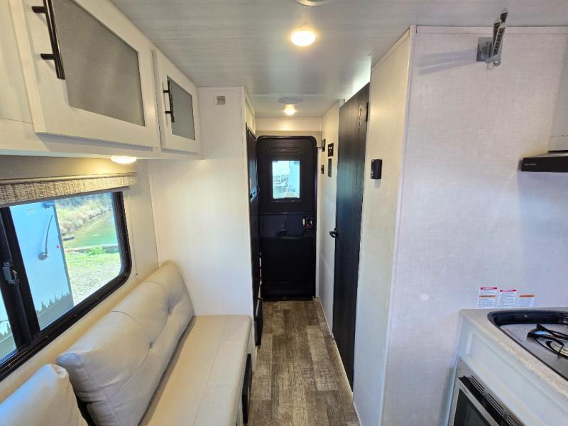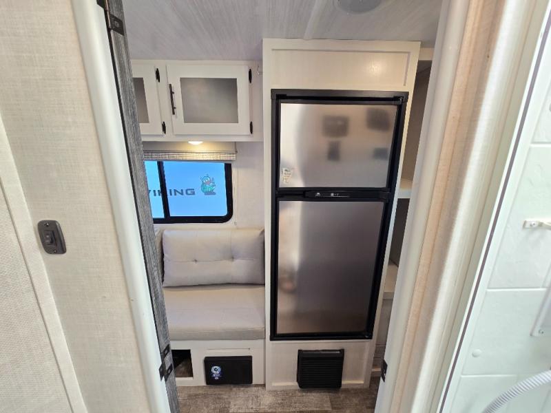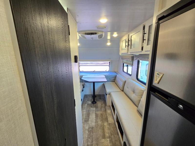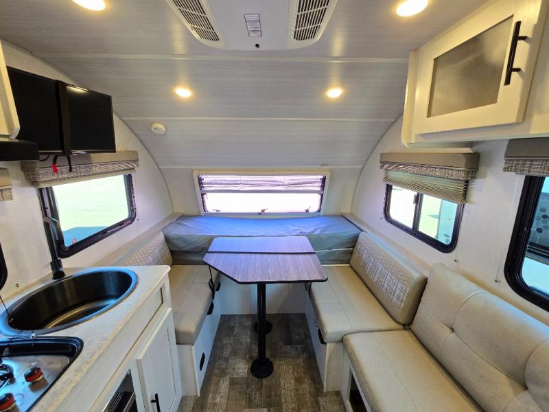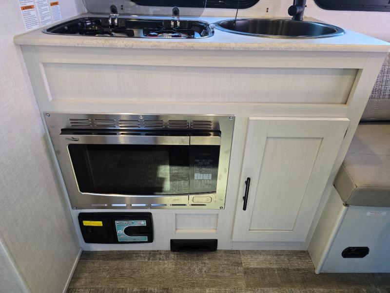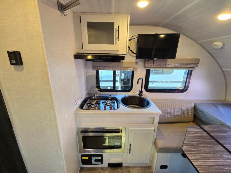 Weekends at the lake just got sweeter in this cozy R-Pod travel trailer. You can prepare your meals each day on the two burner recessed cooktop, or in the convection microwave. There is a sofa to relax on with a good book, plus a booth dinette up front that features a Murphy bed you can fold down at night. This model also includes a refrigerator to keep your perishables fresh, and a pantry to store snacks and dry goods.