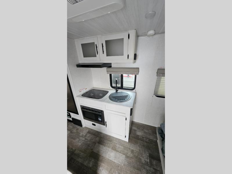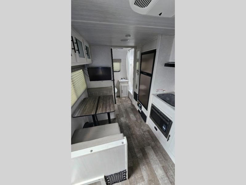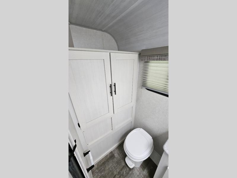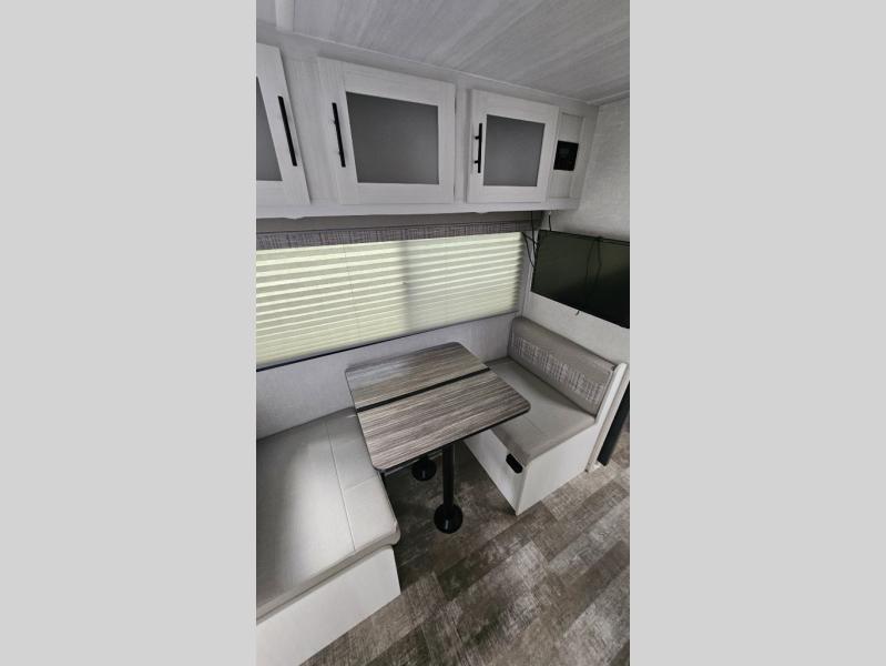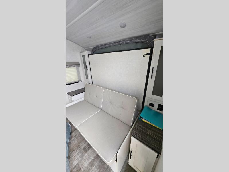 You're going to love all of the conveniences and versatility of this R-Pod travel trailer! The front Murphy bed folds away to reveal the sofa which gives you a comfortable place to sit during the day and to sleep at night too. The rear full bath features everything you will need to get squeaky clean each morning as well as a large wardrobe for you to store your linens. After you have whipped up your best meal with the two-burner cooktop, you can head to the 30" x 75" booth dinette and enjoy eating it there comfortably. There is plenty of storage space inside, but if you need more space, then you can use the exterior pass-through storage!